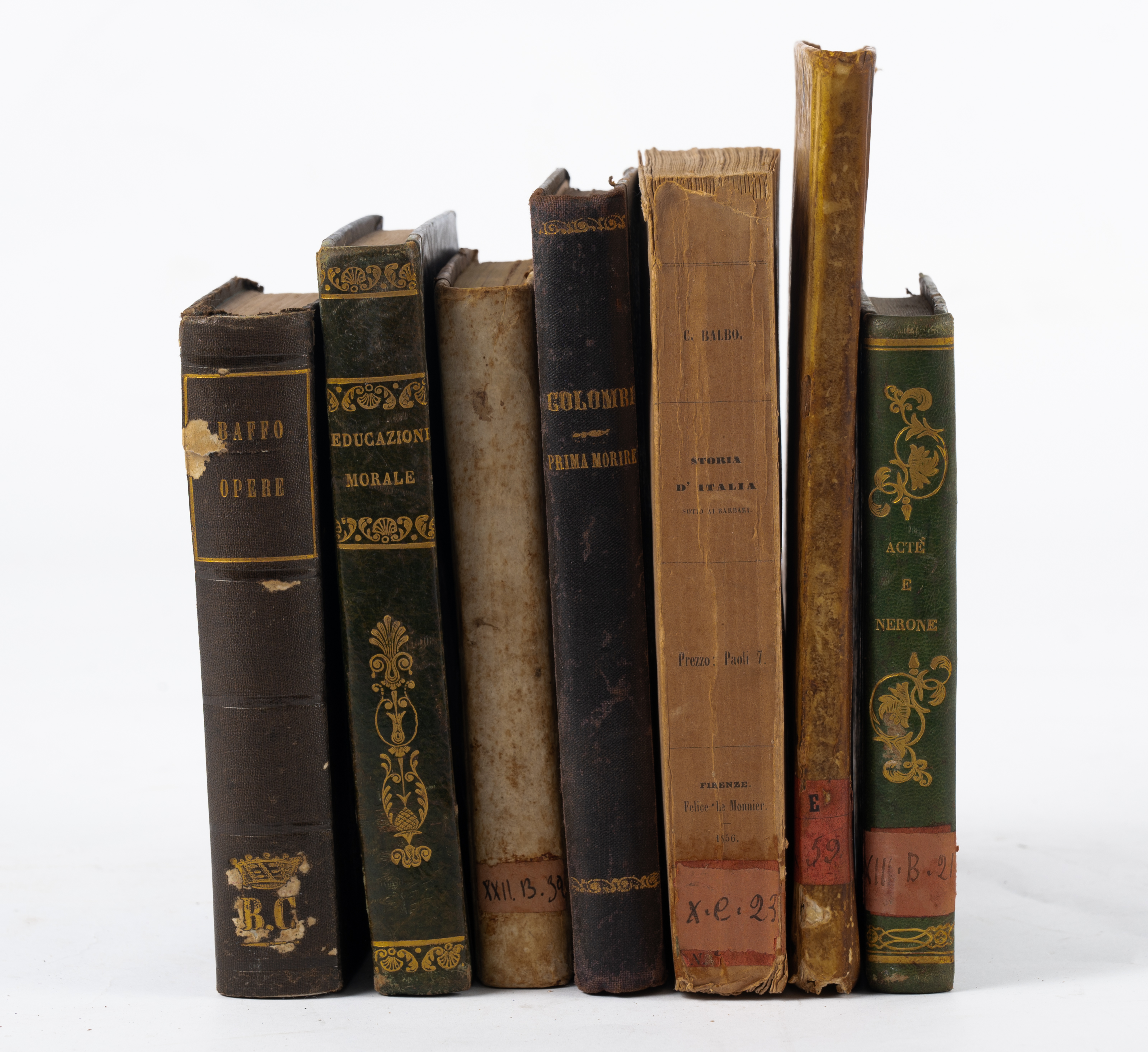 SETTE OTTOCENTINE IN FORMATO 16°: 1) Alessandro Dumas ACTE’ E NERONE, ed. Napoli, Gaetano Nobile 1843. In 16°. Legatura coeva in mezza pelle con piatti marmorizzati e titoli e fregi in oro al dorso. tagli spruzzati. Incipit dei capitoli figurati e finalini. Volume in ottime condizione. Pp. 502. Raro in questa edizione. 2) Francesco Soave ISTITUZIONI DI METAFISICA, ed. Napoli, Salvati 1824. In 16°. Legatura coeva in mezza pergamena con piatti marmorizzati. in buone condizioni. Pp. 324. 3) Cesare Balbo STORIA D’ITALIA SOTTO AI BARBARI, ed. Firenze, Le Monnier 1856. In 8° piccolo. Brossura editoriale. Tagli irregolari e marginosi. Pagine ancora intonse. Qualche brunitura alle pagine ma volume in buone condizioni. Pp. 498, (1). 4) Luigi Galanti GEOGRAFIA ELEMENTARE, ed. Napoli 1850. In 8°. Note m. s. e di possesso. Legatura coeva in piena pergamena rigida. Pp. 144. 5) Caterina Franceschi Ferrucci DELLA EDUCAZIONE MORALE DELLA DONNA ITALIANA, ed. Torino, Gius. Pomba e Comp. 1848. In 16°. Bella legatura coeva in mezza pelle con piatti foderati in seta e titoli e fregi in oro al dorso. Pp. XIX, (1), 409, (3). 6) La Marchesa Colombi (Anna Maria Torriani) PRIMA MORIRE, ed. Milano, Galli 1896. In 16°. Legatura coeva in mezza tela con piatti rigidi in pelle e titoli in oro al dorso. volume in ottime condizioni. Pp. 285. 7) RACCOLTA COMPLETA DELLE OPERE DI GIORGIO BAFFO, VENETO, ed. Costantinopoli 1860. In 16°. Legatura coeva in piena percallina rigida con titoli, filetti e fregi impressi in oro al dorso. qualche normale usura d’uso, ma volume in ottime condizioni. Pp. 300.