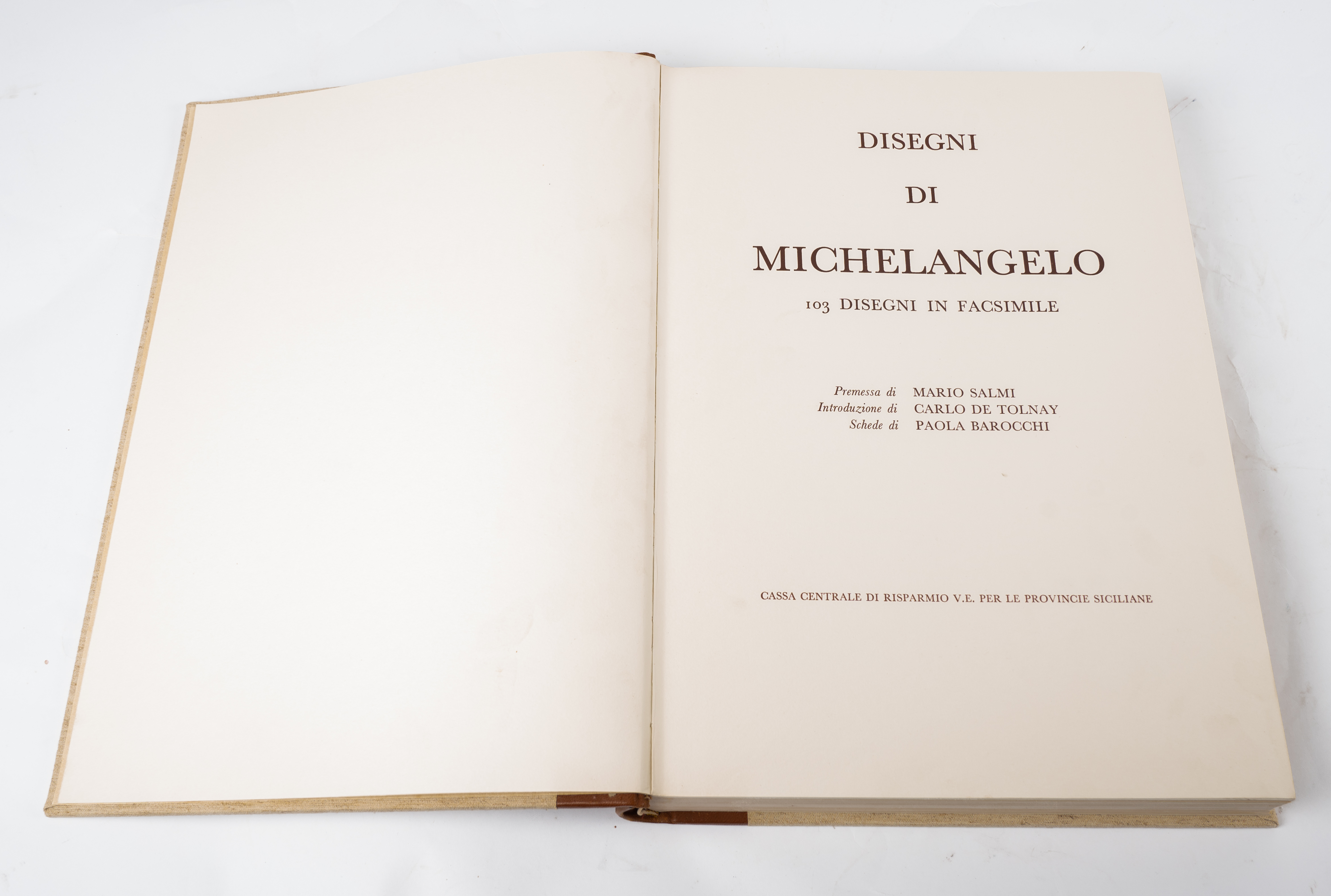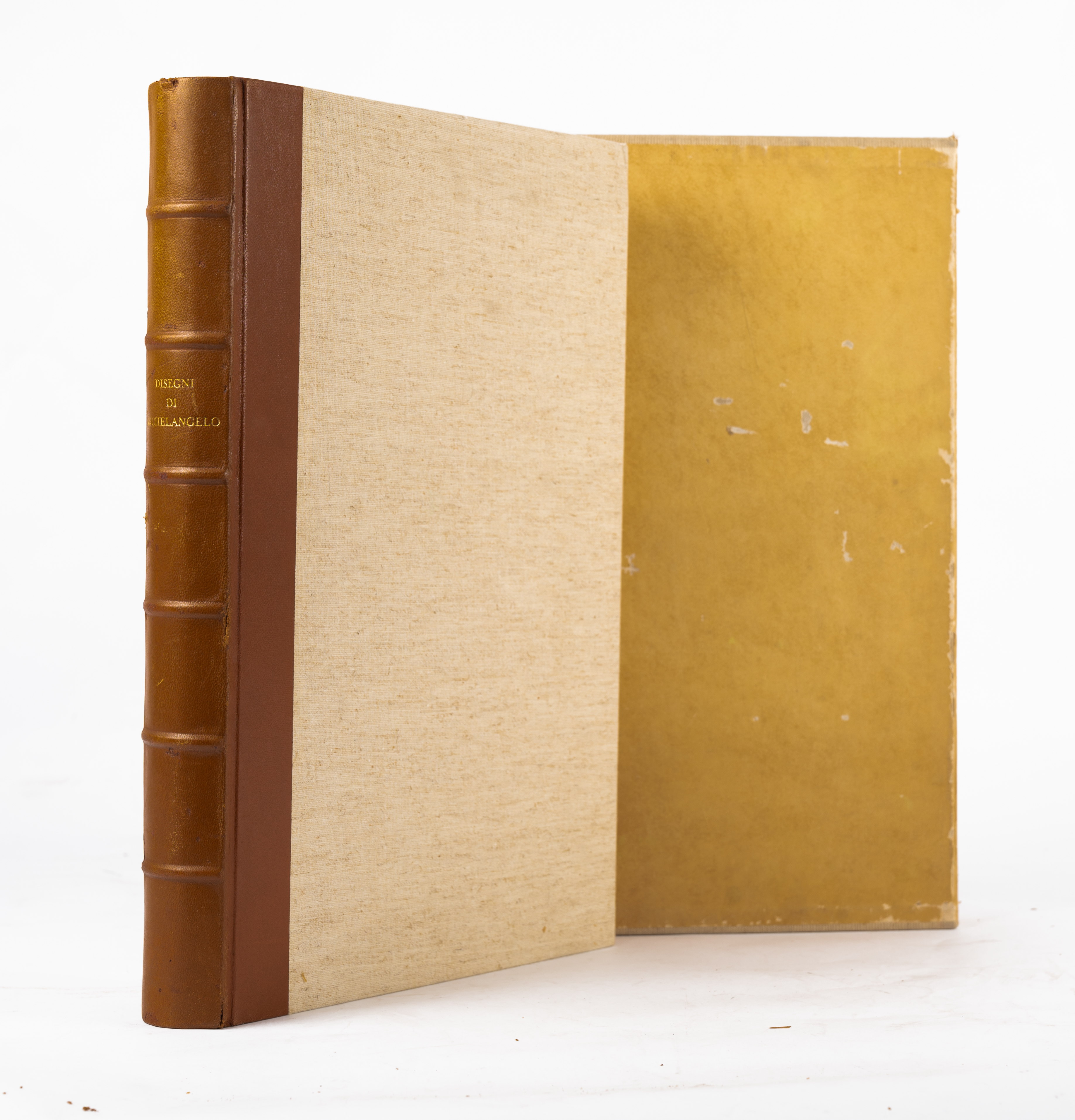 DISEGNI DI MICHELANGELO. 103 DISEGNI IN FACSIMILE, ed. CCRVE, Milano 1964. Volume in folio grande. In ottime condizioni. legatura editoriale in mezza pelle con piatti in tela, con titoli impressi in oro al dorso. Volume custodito entro cofanetto editoriale in cartonato rigido telato. Le tavole riproducono in colori originali i disegni. Premessa di Mario Salmi, introduzione di Carlo de Tolnay e schede di Paola Barocchi. Pp. 20 con le 103 tavole protette da velina.