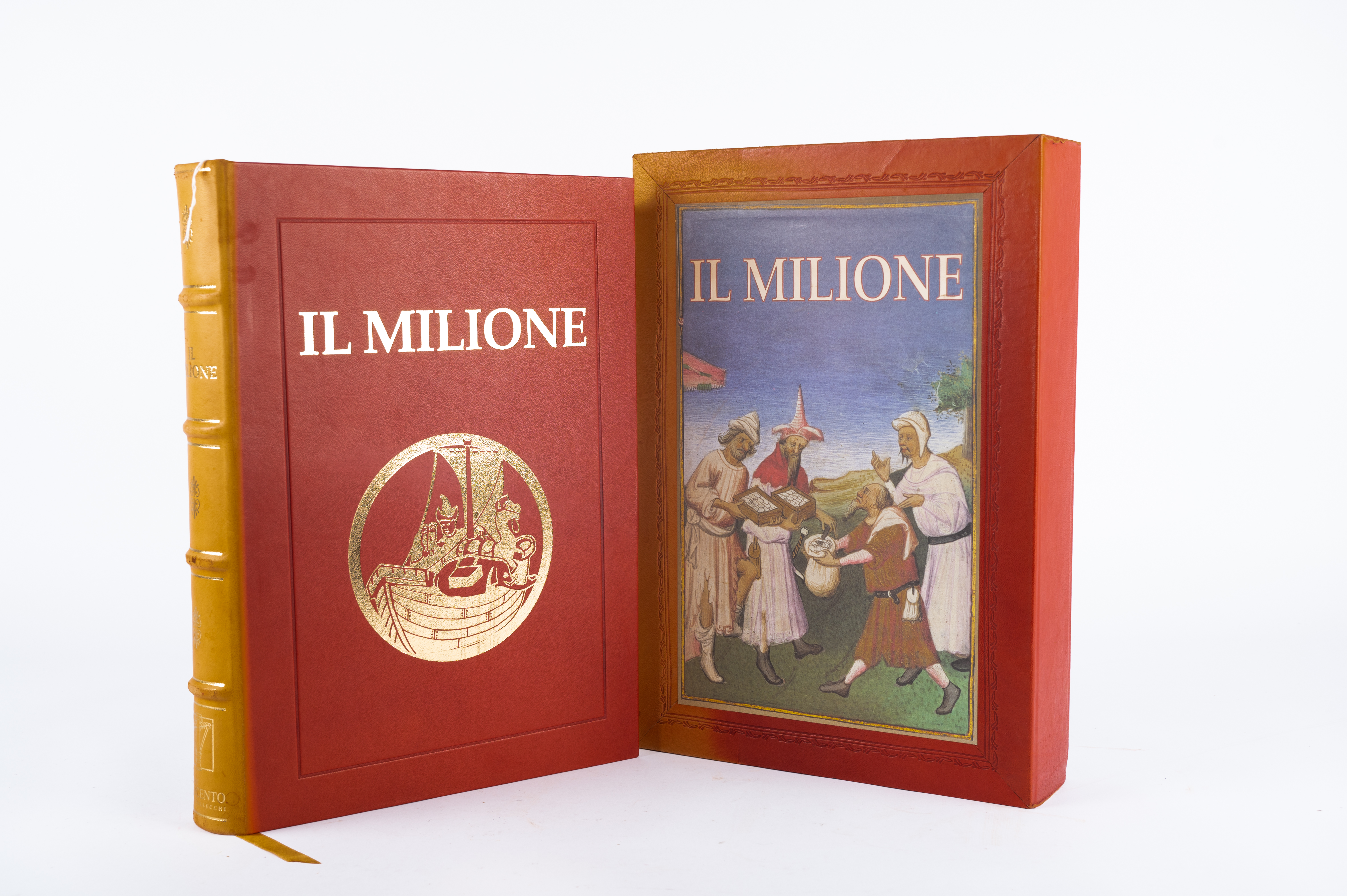 IL MILIONE, ed. Officine del '900 Gruppo Vallecchi, 1999. Volume di cm 34,8 x 46,4 x 6,5. Volume custodito entro cofanetto. Il Milione. Officine del Novecento, Firenze, 1999. Numerose illustrazioni in bianco e nero e a colori. Legatura in piena pelle con impressioni in oro sul dorso e immagine a colori sul primo piatto. Formato 35x46 cm. Pagine 240. Cofanetto di custodia in legno rivestito in pelle. Tiratura numerata e limitata di 1999 copie. Condizione ottima.