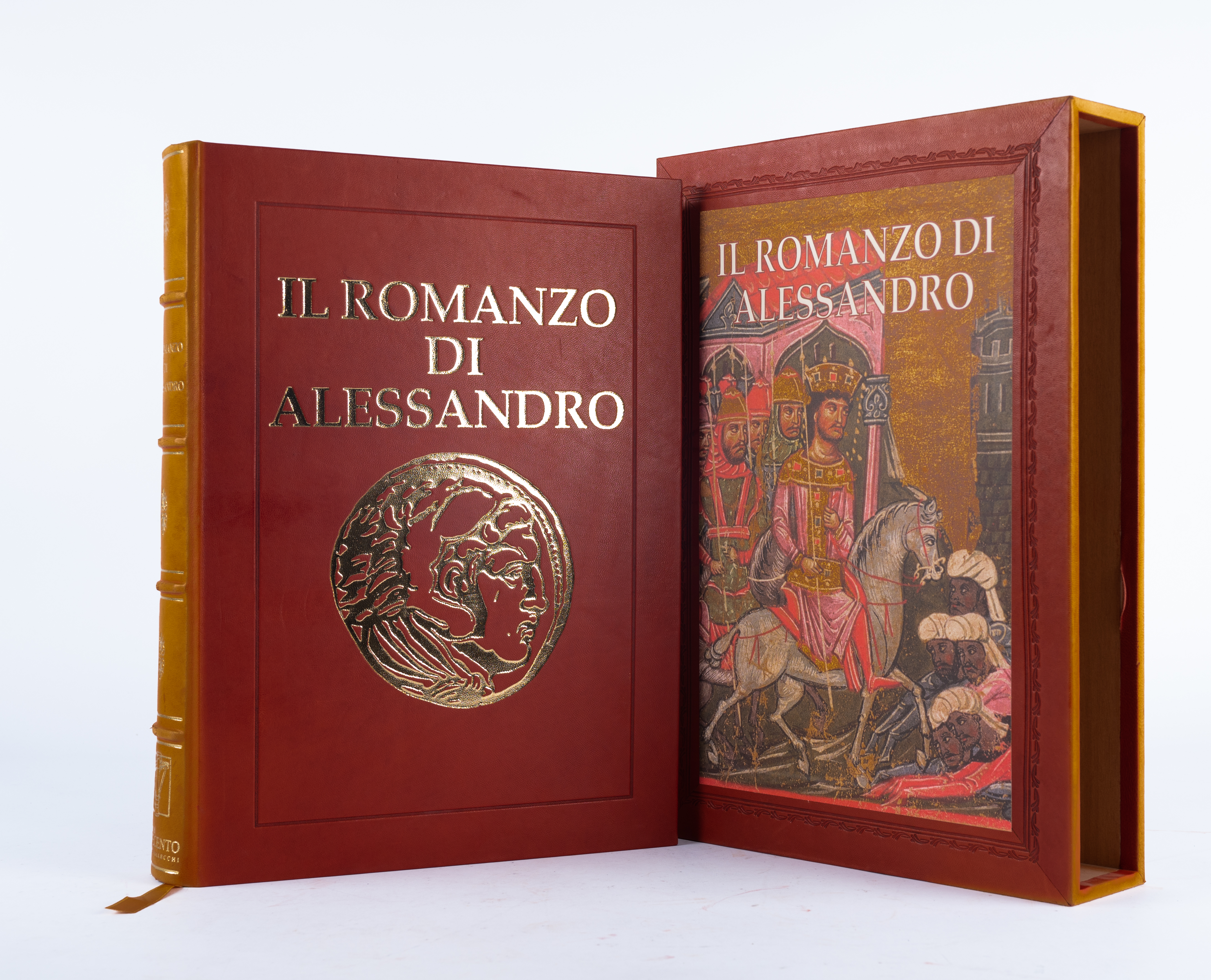 IL ROMANZO DI ALESSANDRO, ed. Officine del Novecento 1999. Volume in folio (cm 46). Legatura editoriale in pelle rossa con impressioni oro al dorso ed al piatto anteriore. Edizione limitata a 1999 copie, la nostra è la n. 408. Opera stampata su carta speciale realizzata dalle cartiere Miliani di Fabriano. Saggi introduttivi a cura di Monica Centanni e Fabrizio Lollini. Il volume è conservato nel suo cofanetto originale rivestito in pelle con decorazioni a secco, illustrato da un'immagine di Alessandro il Grande. Ottimo stato di conservazione. Pp. 272 con un ricco apparato di illustrazioni.