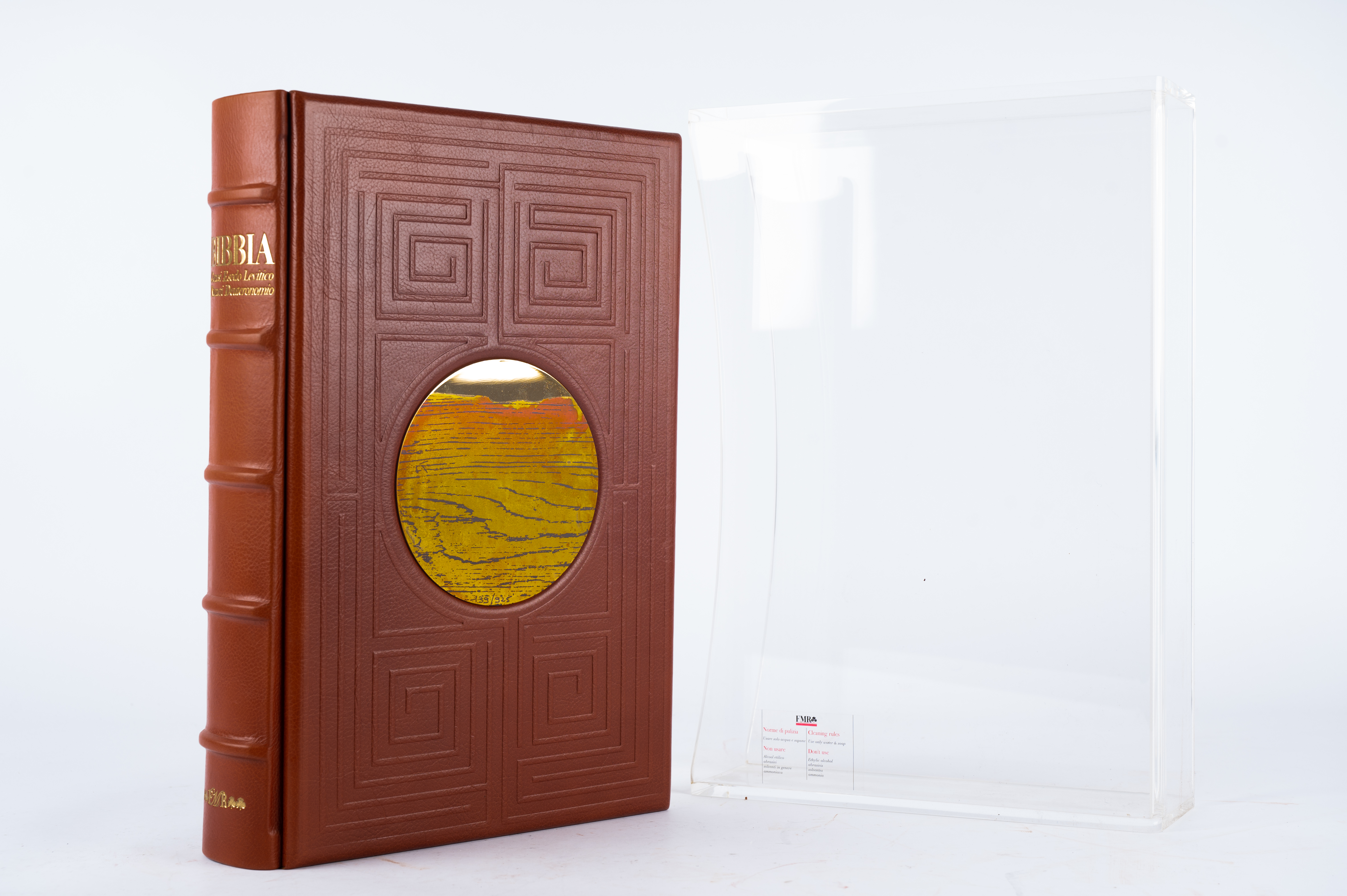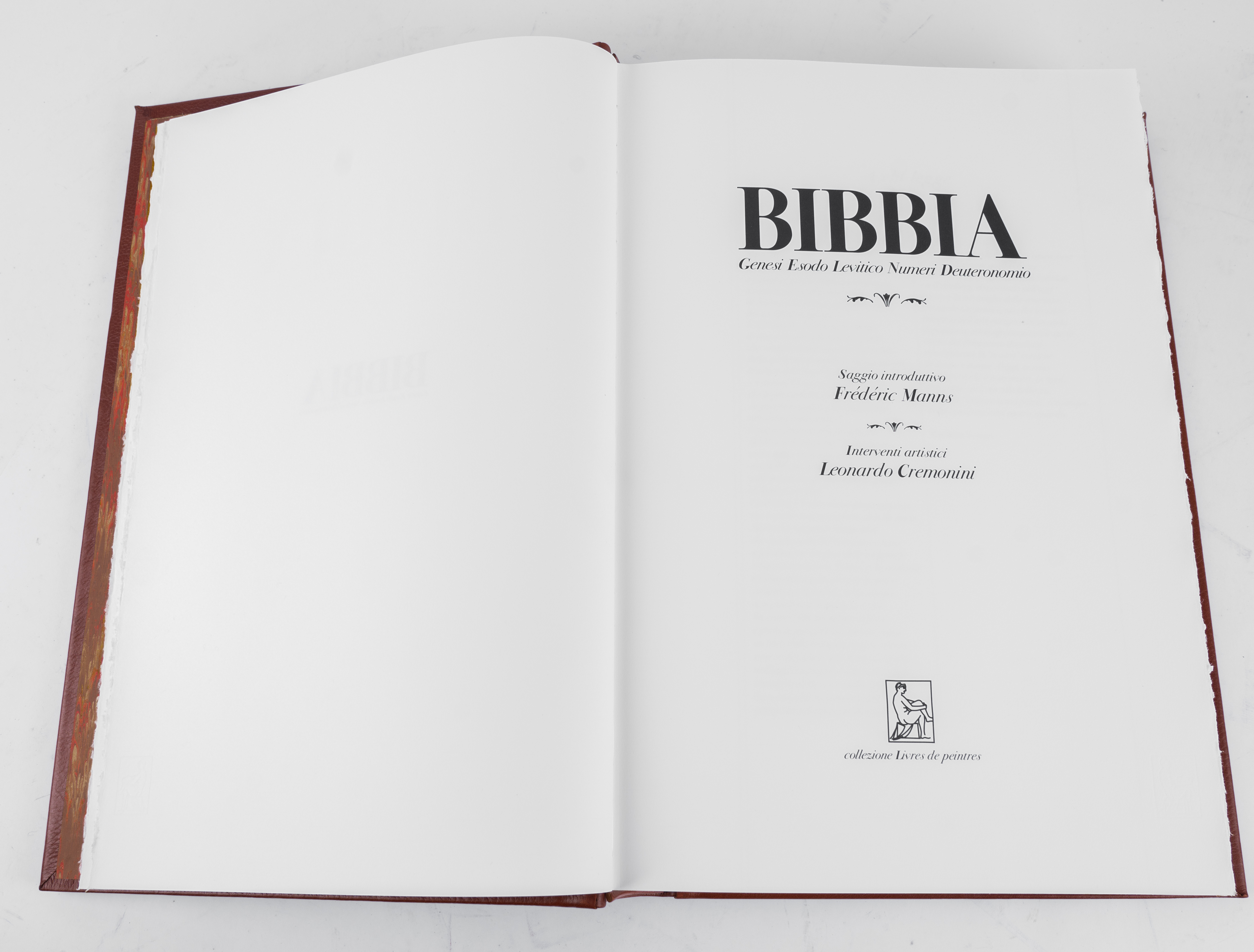 BIBBIA. GENESI, ESODO, LEVITICO, NUMERI, DEUTERONOMIO, ed. FMR/Livres de Peintres 2008. L'opera comprende un saggio introduttivo di Frédéric Manns, già direttore dello Studium Biblicum Franciscanum di Gerusalemme; i primi cinque Libri della Bibbia (Genesi, Esodo, Levitico, Numeri, Deuteronomio) nella versione ufficiale curata dalla Conferenza Episcopale Italiana; otto tavole a colori fuori testo, realizzate appositamente per questa edizione dal maestro Leonardo Cremonini. Cm. 28 x 42,5, pp. 352. Con tavole serigrafiche a colori fuori testo di Leonardo Cremonini. Sontuosa legatura in piena pelle naturale, tinta alla botte, con fregi ed iscrizioni in oro a caldo. In copertina litoserigrafia materica su lastra di ottone dorato sempre del maestro. Entro custodia originale in plexiglass. Edizione di pregio stampata in 925 esemplari numerati, il nostro è il n. 139.