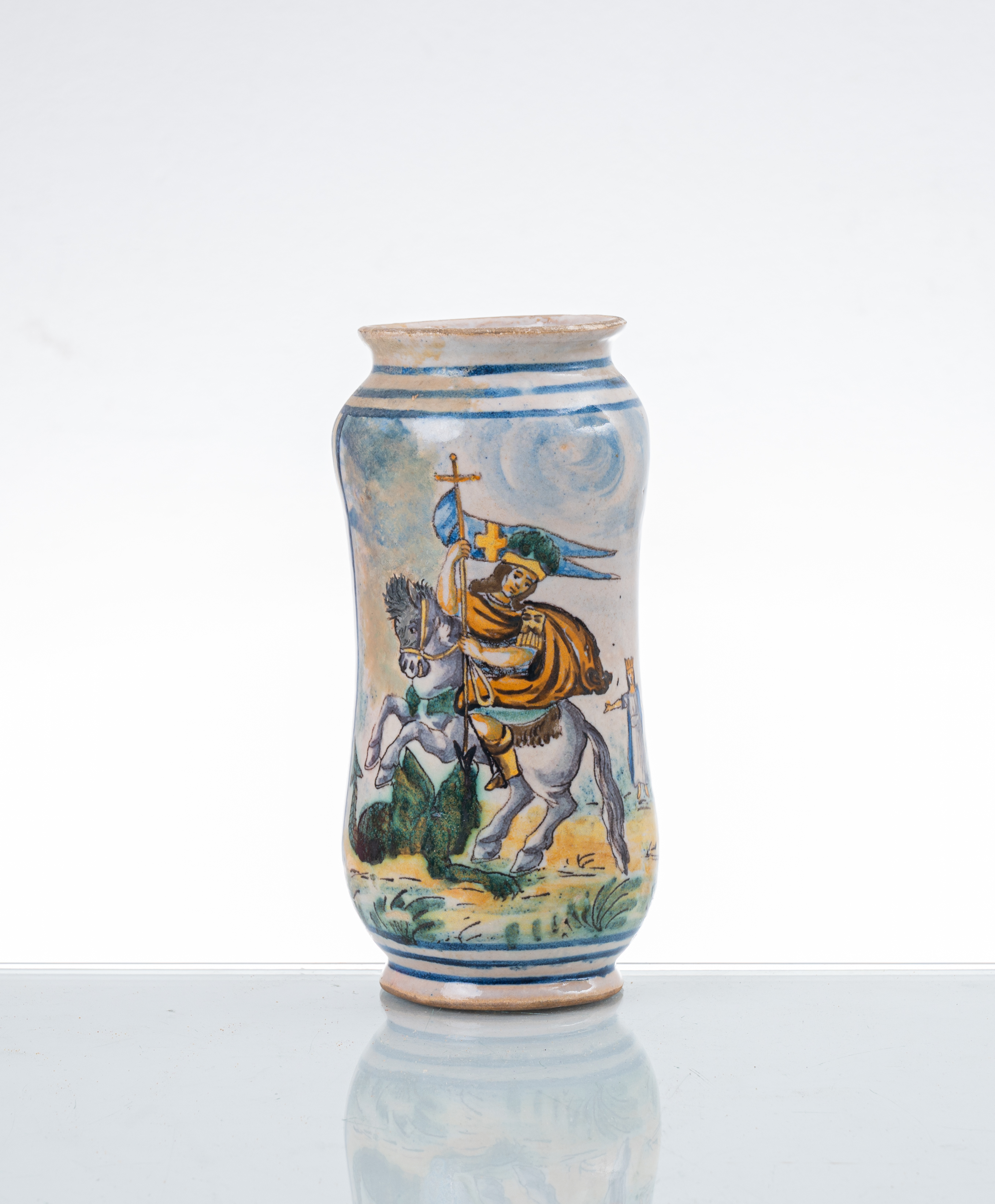Albarello in ceramica decorata e dipinta datata 1756 (restauri).