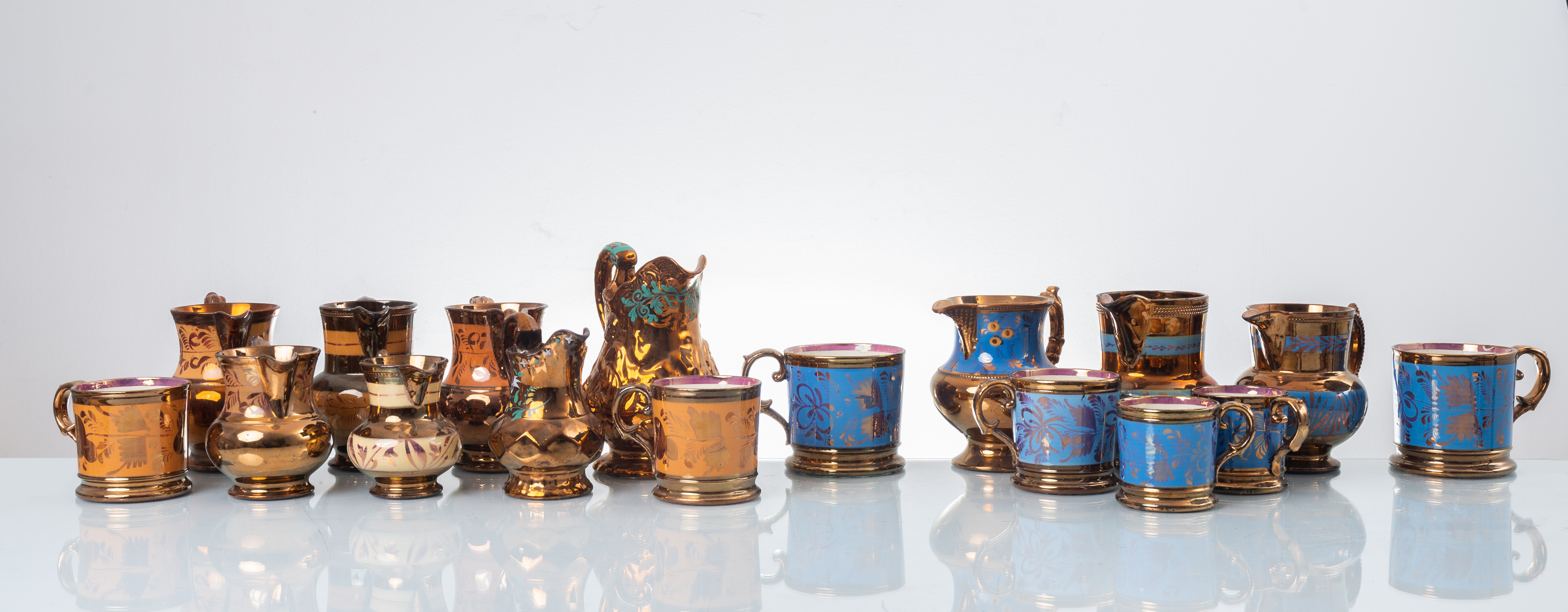Quattordici brocche e otto tazze in ceramica smaltata e decorata (influenza Inglese) (usure).