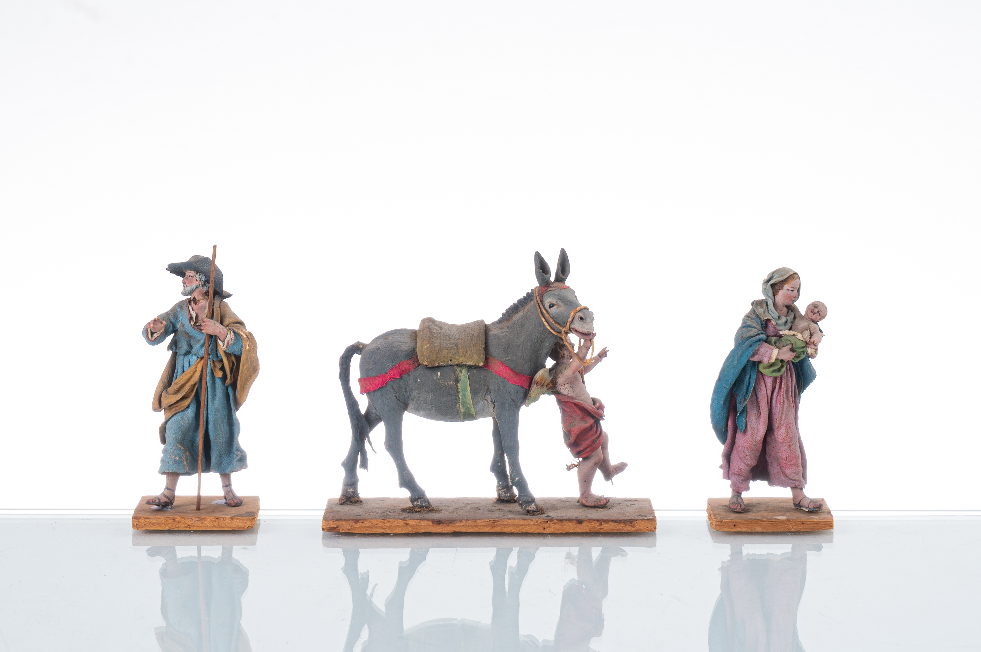 Tre sculture in terracotta, cartapesta e legno raffigurante "Madonna con Bambino", "San Giuseppe" e "Asinello con Angelo" (Fuga in Egitto) (usure).