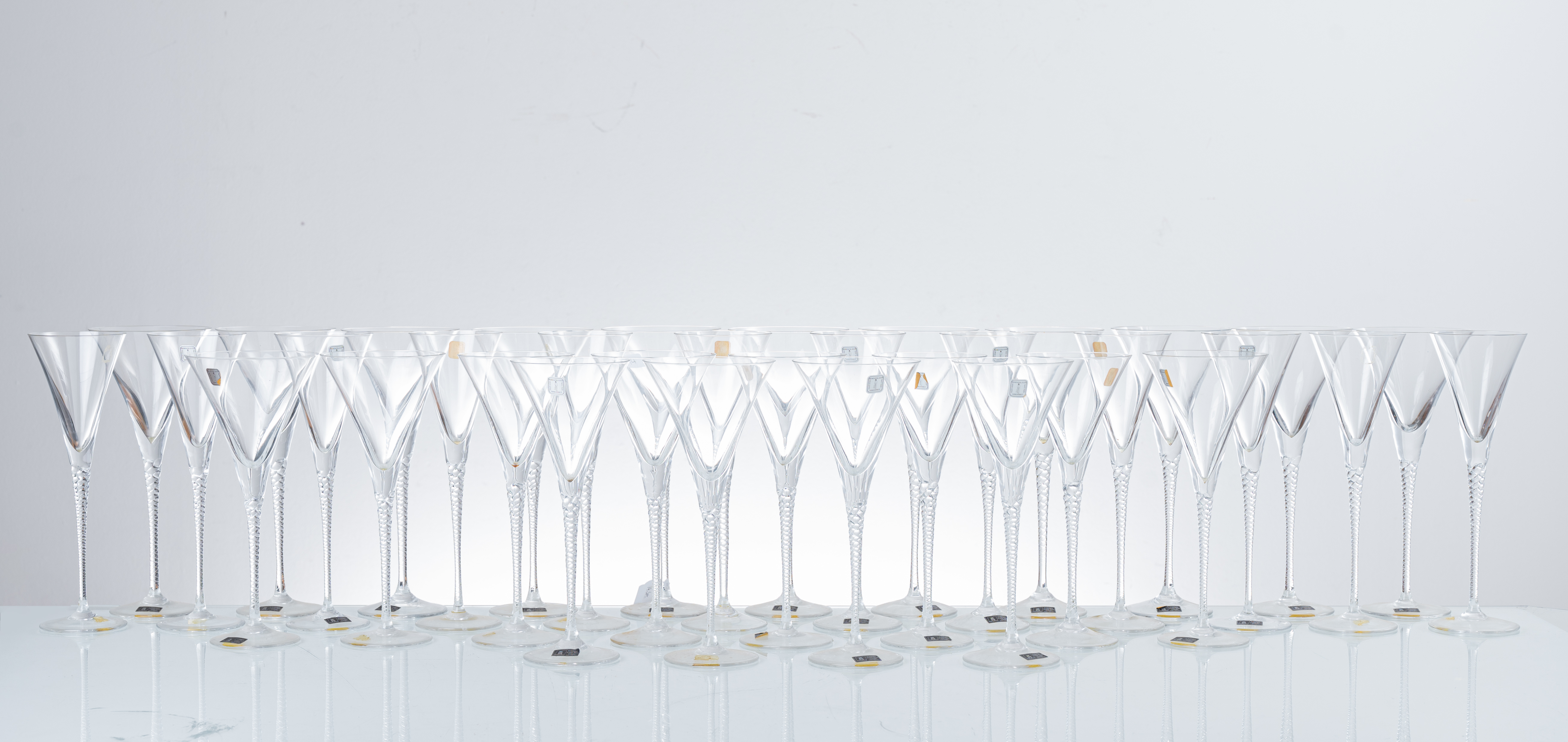 Servizio di bicchieri in cristallo composto da 12 bicchieri acqua, 12 bicchieri vino e 12 flutes.