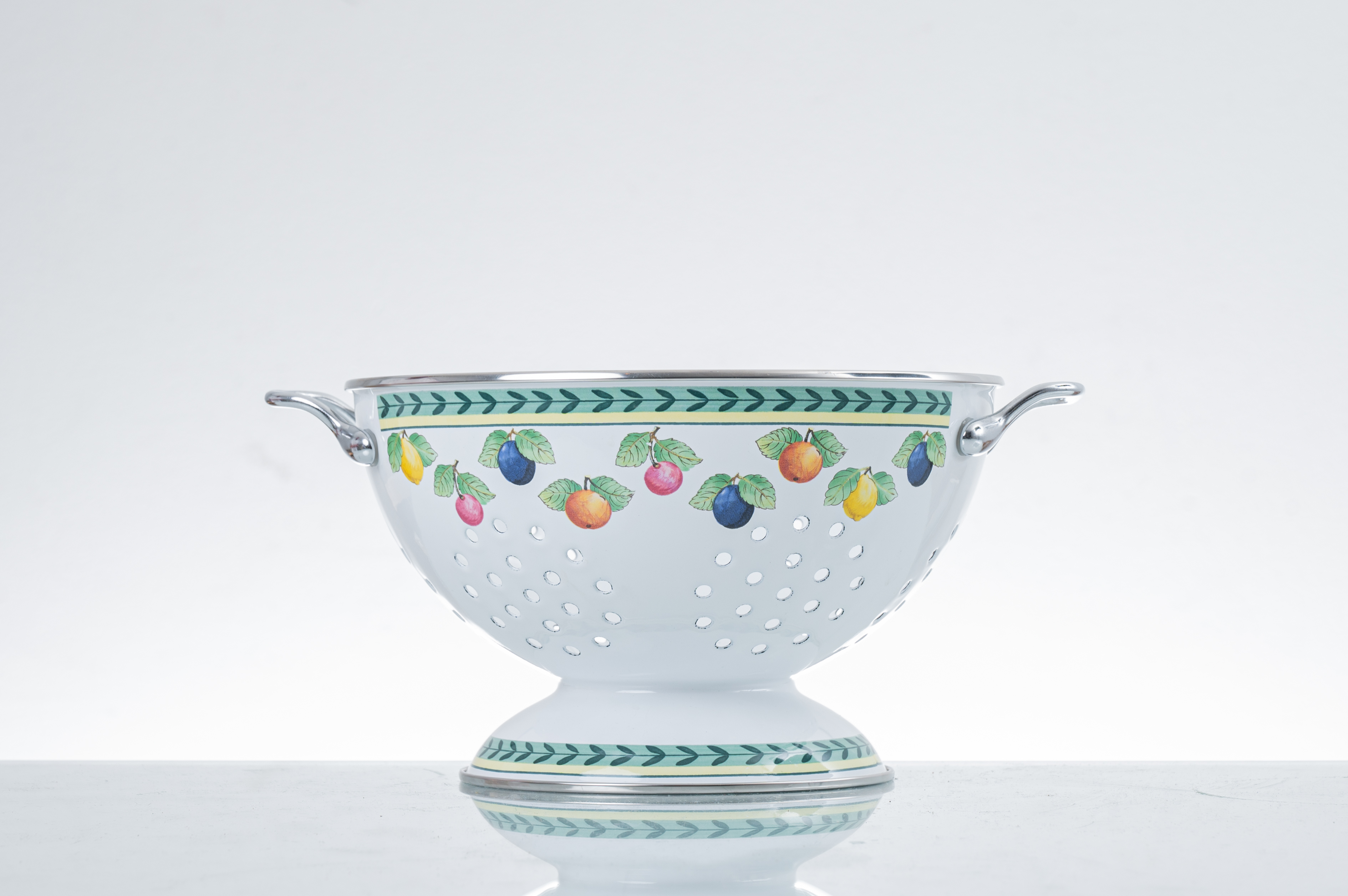 Scolapasta in metallo con decori in smalto a motivo di frutta.