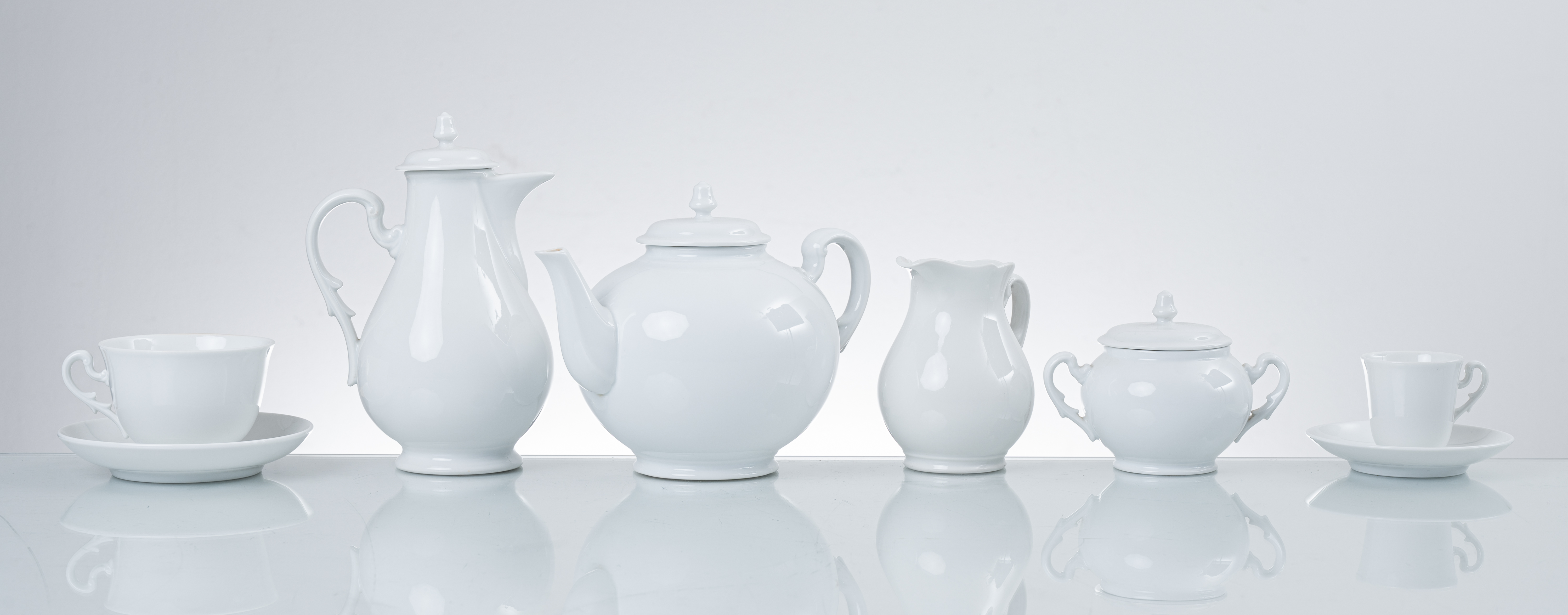 Servizio da tè e caffè in porcellana bianca composto da: teiera, caffettiera, zuccheriera, lattiera, 12 tazze con piattini e 10 tazzine con piattini (mancanze e difetti).