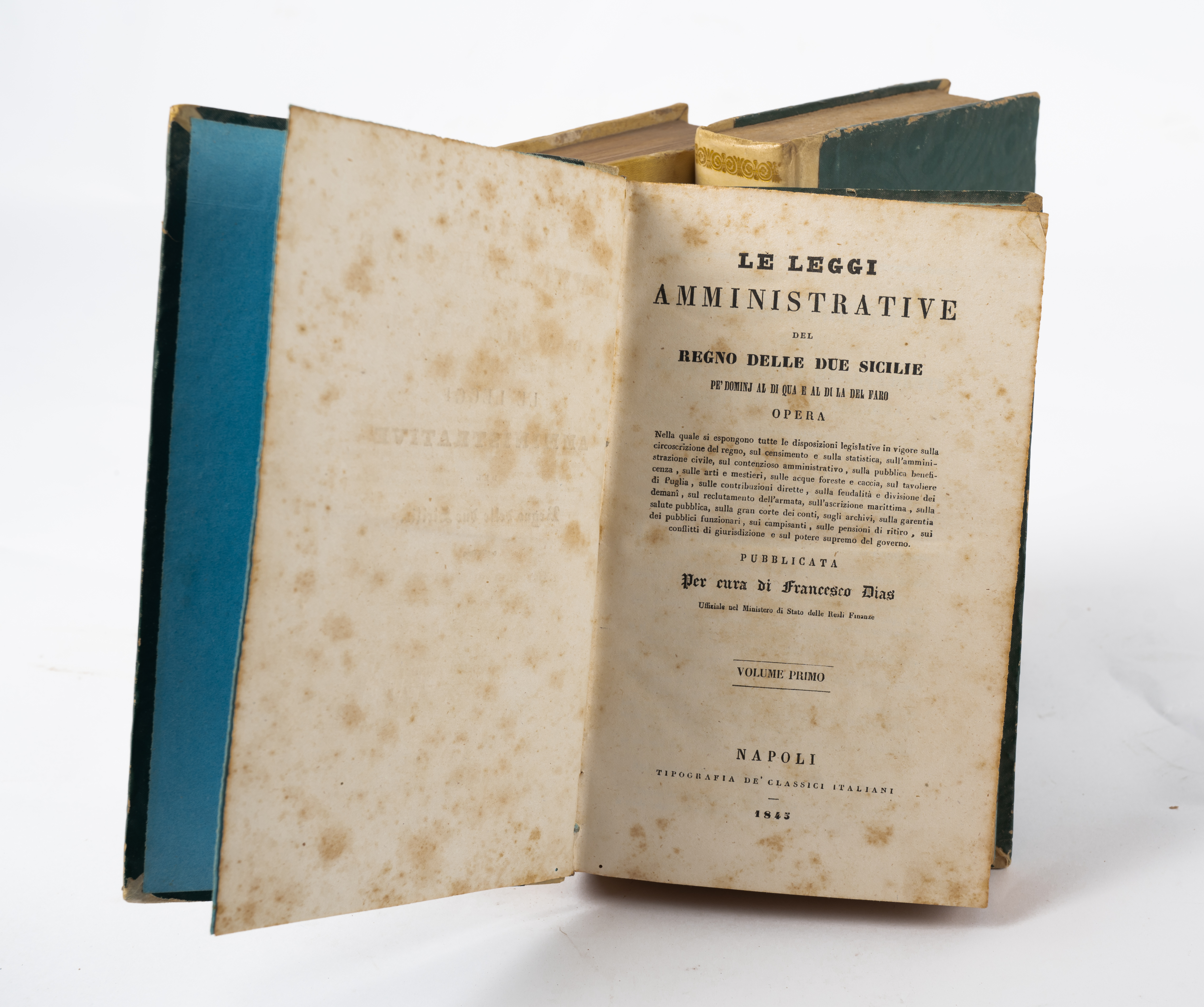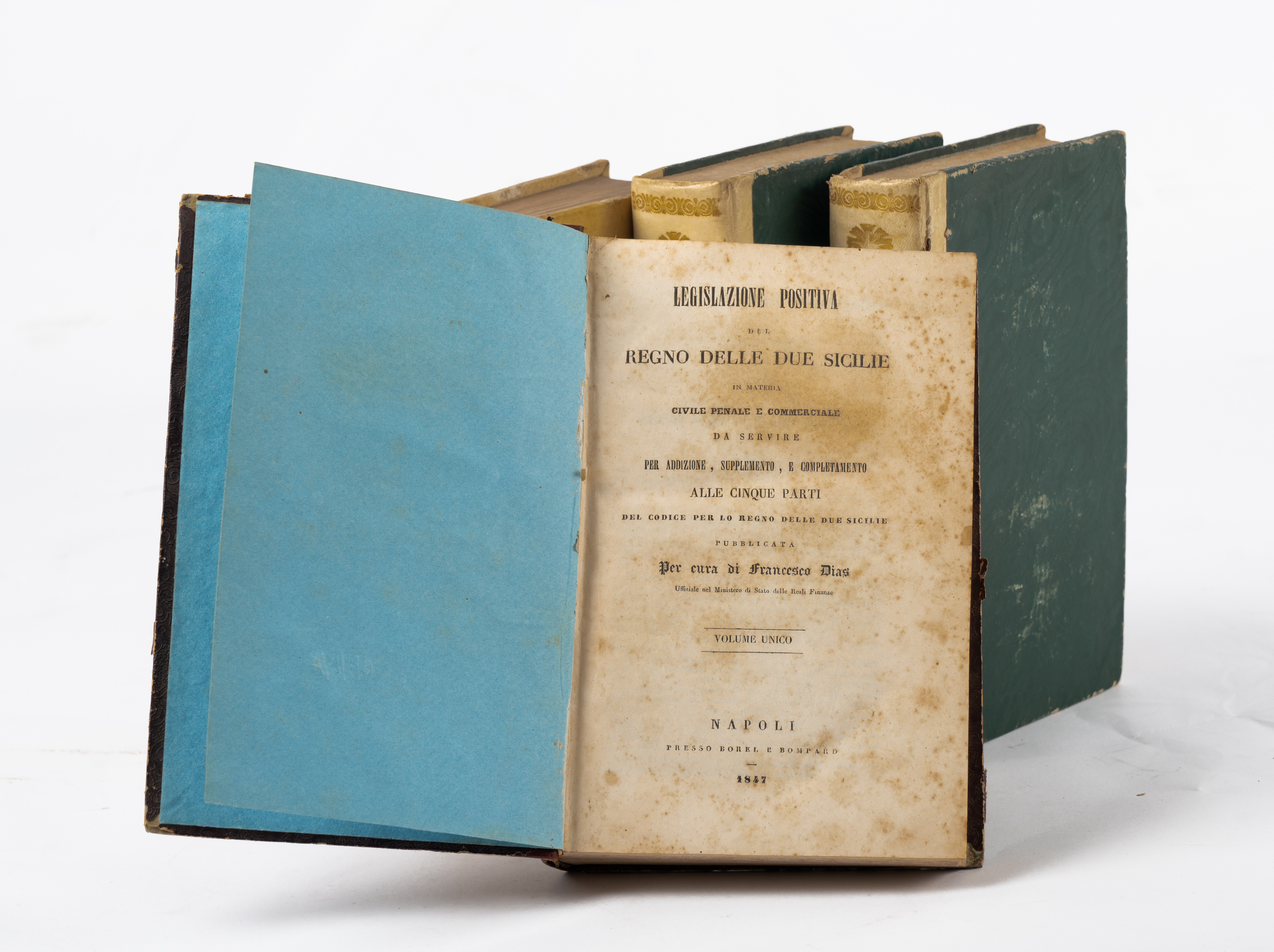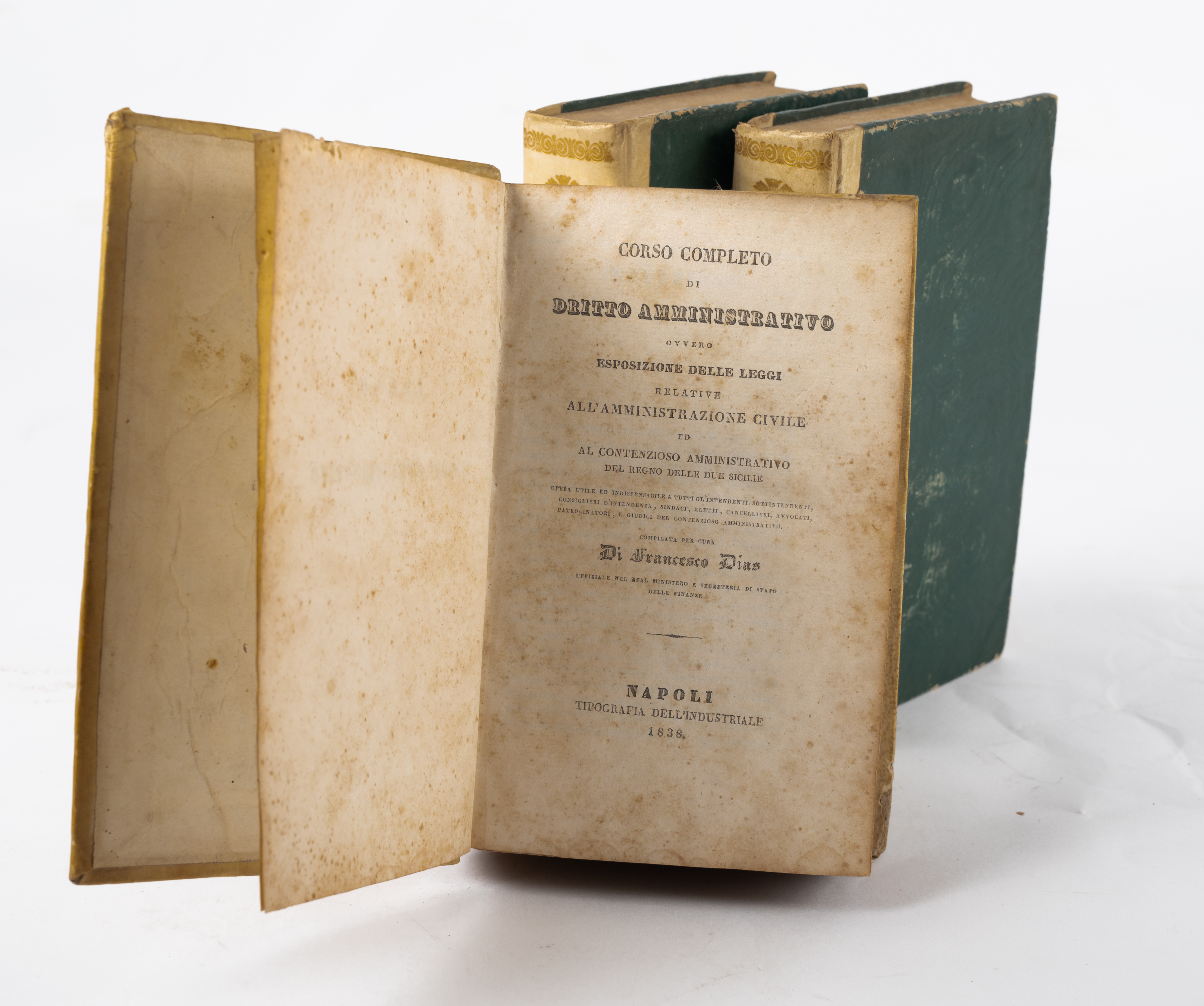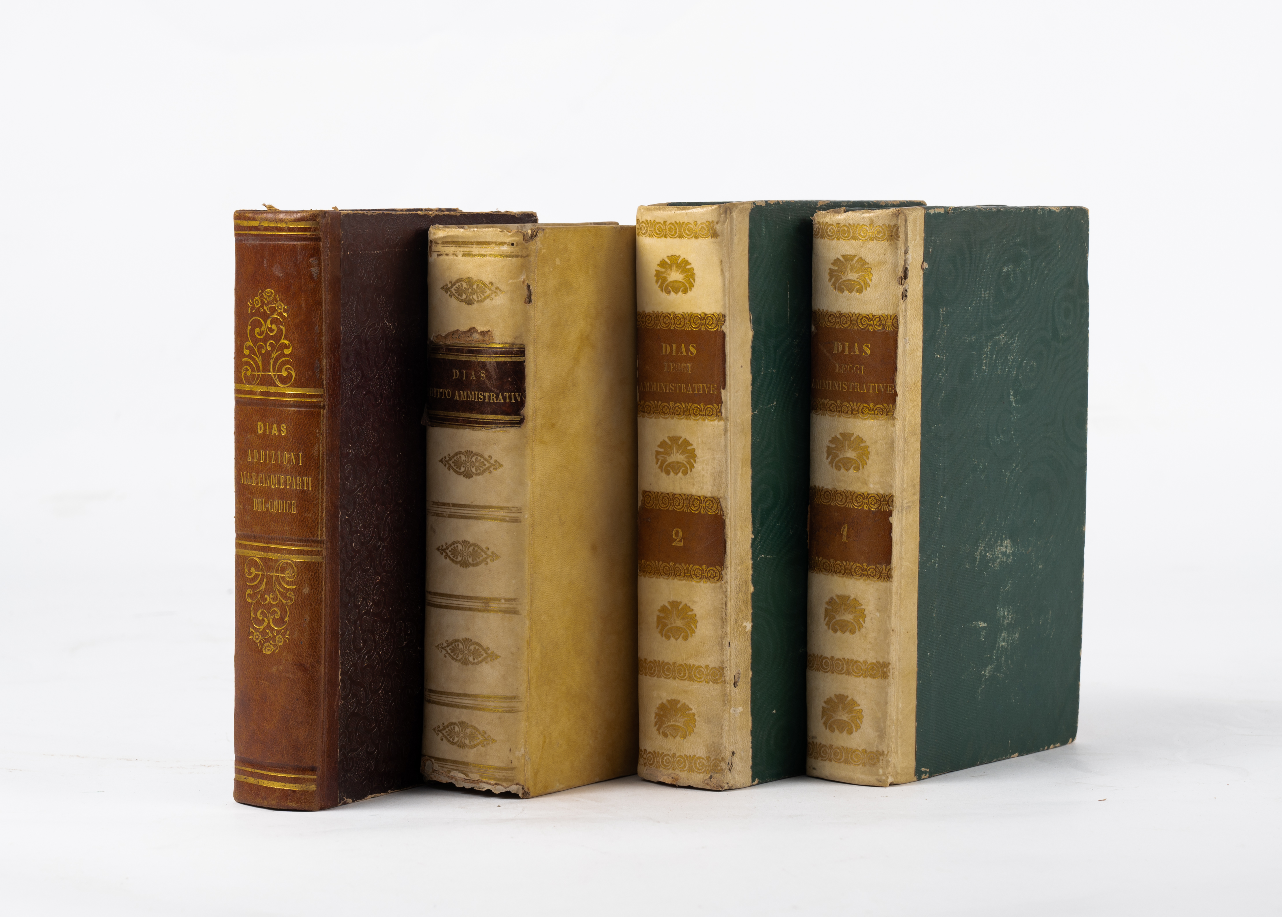 QUATTRO VOLUMI DEL GIURISTA FRANCESCO DIAS: 1) LE LEGGI AMMINISTRATIVE DEL REGNO DELLE DUE SIILIE, ed. Napoli, Tipografia de’ classici italiani, 1845. 2 volumi in 8°. Legature coeve in mezza pergamena con piatti in percallina rigida. Titoli e fregi impressi in oro ai dorsi. Tagli goffrati a secco. Volumi in ottime condizioni. piccoli segni di tarlo ormai debellato. pp. continuative XXX, 1299, (2). Note m. s. 2) CORSO COMPLETO DI DIRITTO AMMINISTRATIVO, ed. Napoli, Tipografia dell’Industriale 1836. Legatura coeva in piena pergamena rigida. Titoli, filetti e fregi impressi in oro ai dorsi. Volume in ottime condizioni. pp. VIII, 956. 3) LEGISLAZIONE POSITIVA DEL REGNO DELLE DUE SICILIE, ed. Napoli, Borel e Bompard 1847. Legatura coeva in mezza pelle con piatti in percallina rigida. Titoli, filetti e fregi impressi in oro ai dorsi. Volume in ottime condizioni. pp. 748.