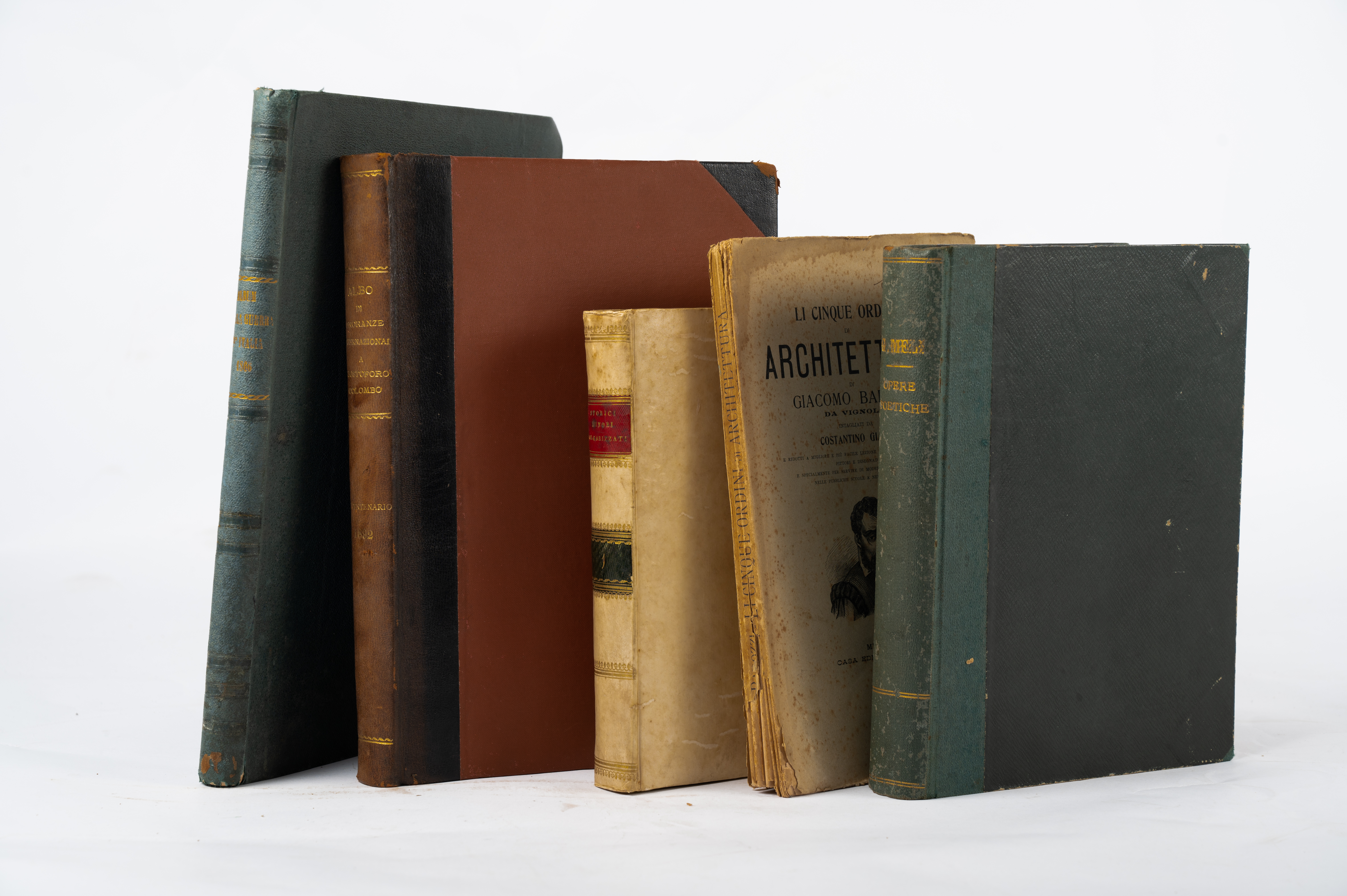 CINQUE VOLUMI IN MISCELLANEA DEL XIX E XX SECOLO: 1) AA. VV. STORICI MINORI VOLGARIZZATI ED ILLUSTRATI, ed. Fratelli Sonzogno 1826. In 8°. Collana degli Antichi storici greci volgarizzati, solo il vol. 1° con quattro tavole xilografiche fuori testo. Legatura coeva in piena pergamena rigida con titoli in oro entro tasselli e filetti in oro al dorso. piccole e sparse fioriture ma volume in perfette condizioni. Pp. 96, 118, (1). 2) ALBO DI ONORANZE INTERNAZIONALI A CRISTOFORO COLOMBO& PEL GLORIOSO RICORDO DEL QUARTO CENTENARIO DELLA SCOPERTA DELL'AMERICA, 12 OTTOBRE 1892. in 4°. Solida ed elegante legatura coeva in mezza pelle con angoli, e titoli, filetti e fregi in oro al dorso. Preservata all'interno la bella brossura originale in cromolitografia. In ottimo stato di conservazione. Il testo è composto da centinaia di facsimili di autografi e documenti inerenti la figura di Colombo (alcuni con illustrazioni). Pp. (4) 406. 3) ALBUM DELLA GUERRA DEL 1866, ed. Sonzogno s. d. In 4°, legatura coeva in piena percallina rigida con titoli e fregi in oro al dorso. Pp. 239, 46, (2) con illustrazioni intercalate nel testo e a intera pagina. Su due colonne. Volume in ottime condizioni. 4) Giacomo Barozzi da Vignola LI CINQUE ORDINI DI ARCHITETTURA, ed. Milano, Bietti 1910. In 8°. Brossura editoriale figurata con ritratto del Barozzi ( o Barozzio). Ritratto xilografico del Barozzi in antiporta. Volume in ottime condizioni e con tutte le XXXI tavole. Pp. 40 oltre le tavole f. t. 5) Edoardo Alfano – a cura di - GIOVANNI MELI. OPERE POETICHE, ed. Palermo, Giuseppe Piazza 1915. Con dedica autografa del curatore. In 8°. Normali usure d’uso alla coperta, ma pagine in ottime condizioni. stampato su due colonne. Pp. XXXVI, 548, XXVI, (2), 78. Con un disegno a sanguigna a piena pagina di Jules Van Biesbroek, j. che ritrae Giovanni Meli e la sua Musa.