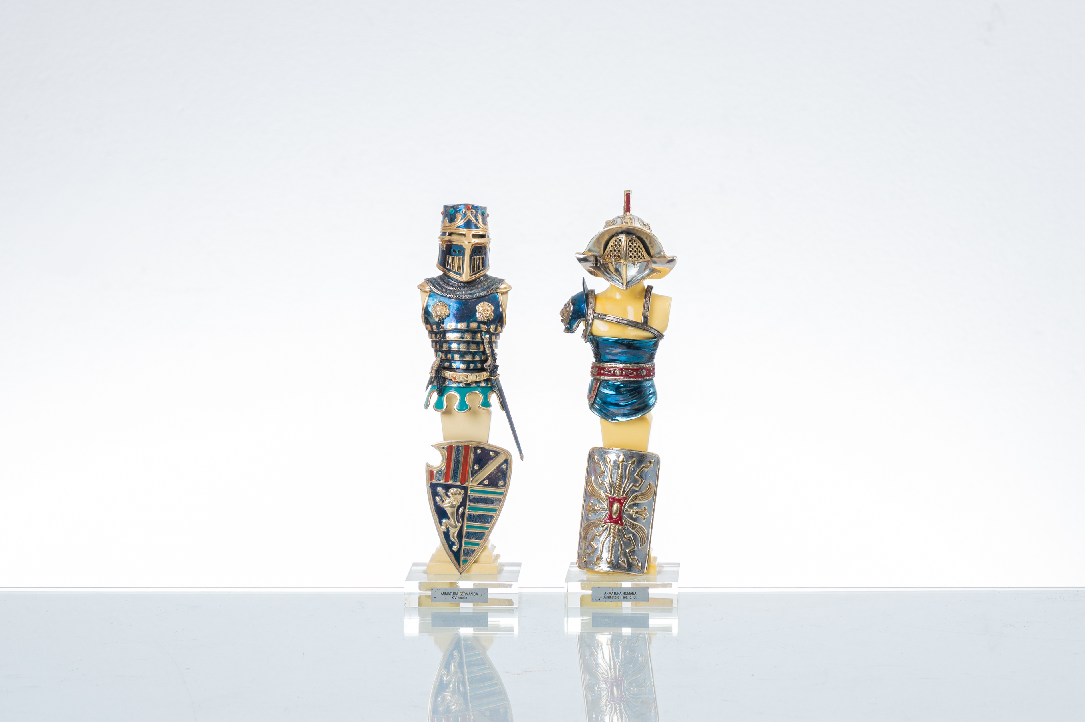 DUE SCULTURE in resina con armature in argento smaltato in policromia raffiguranti "Soldati", base in plexiglass. Argentiere fabbrica argenterie Etruria.