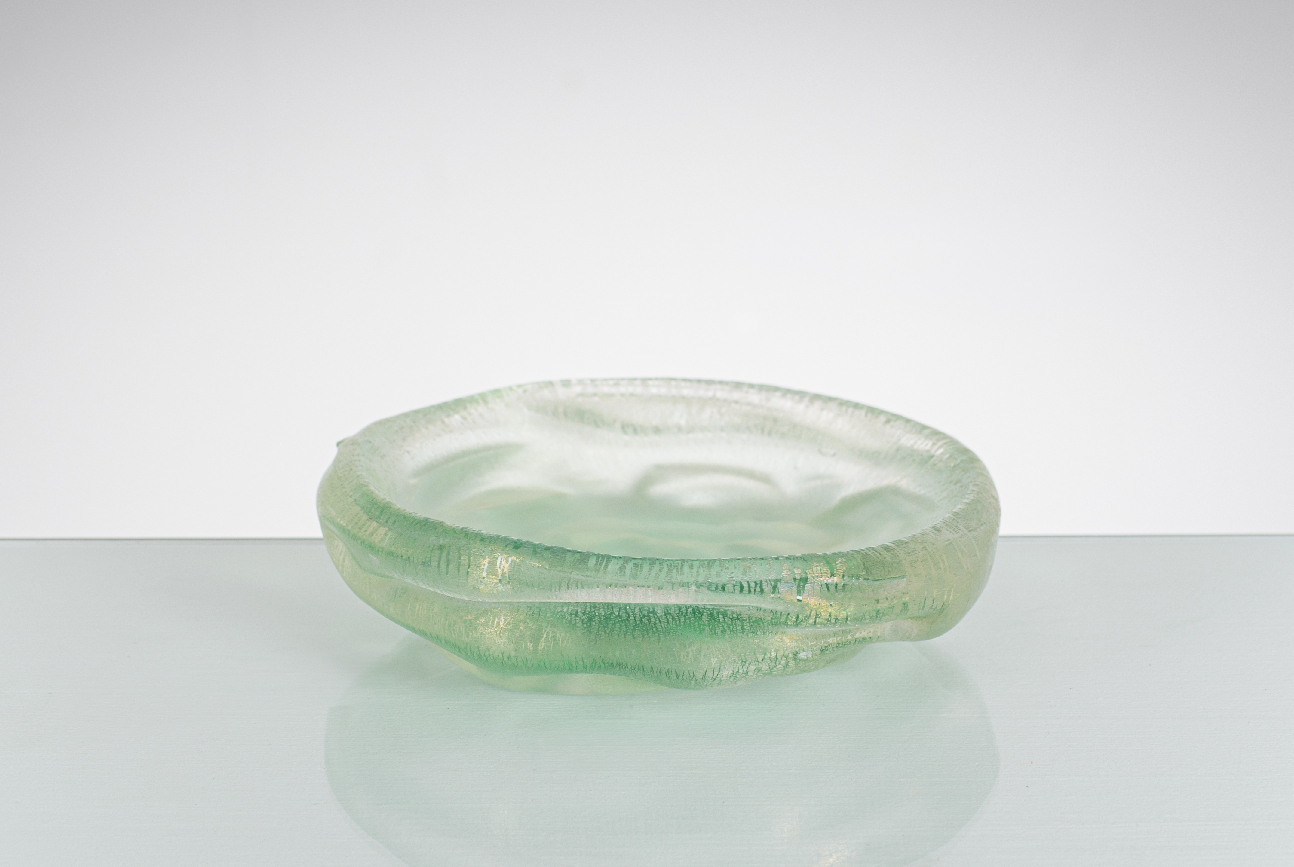 Ciotola di forma irregolare in vetro pesante sommerso colore verdino con inclusioni oro.