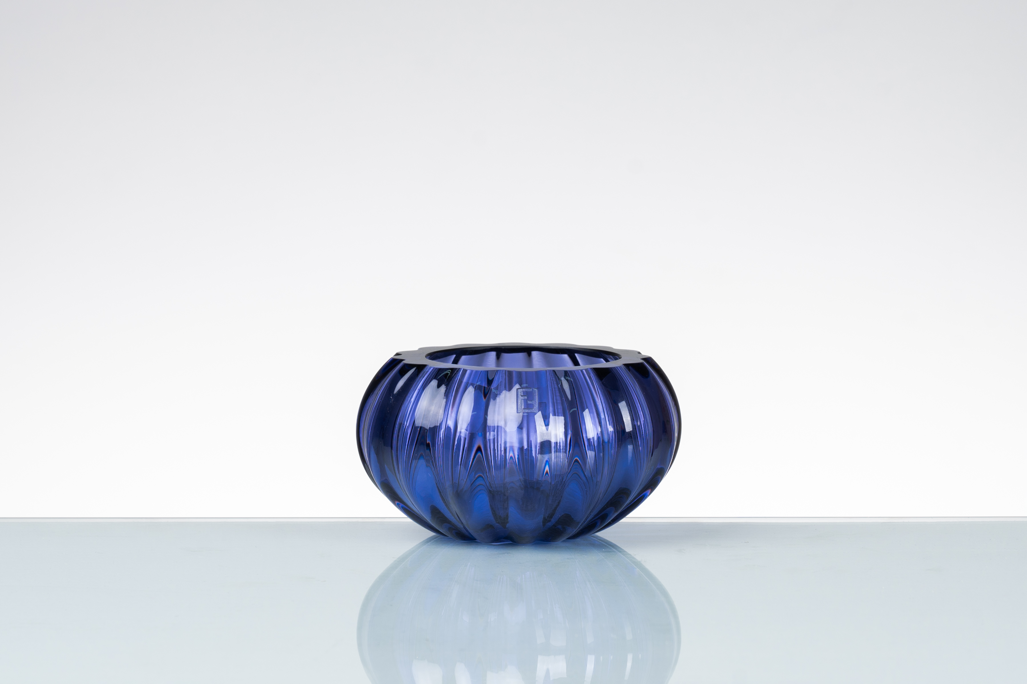 Coppa in vetro violetto trasparente, corpo sferico decorato con costolature verticali, bocca circolare sagomata. Marchio di produzione ed etichetta consorzio vetri di Murano.