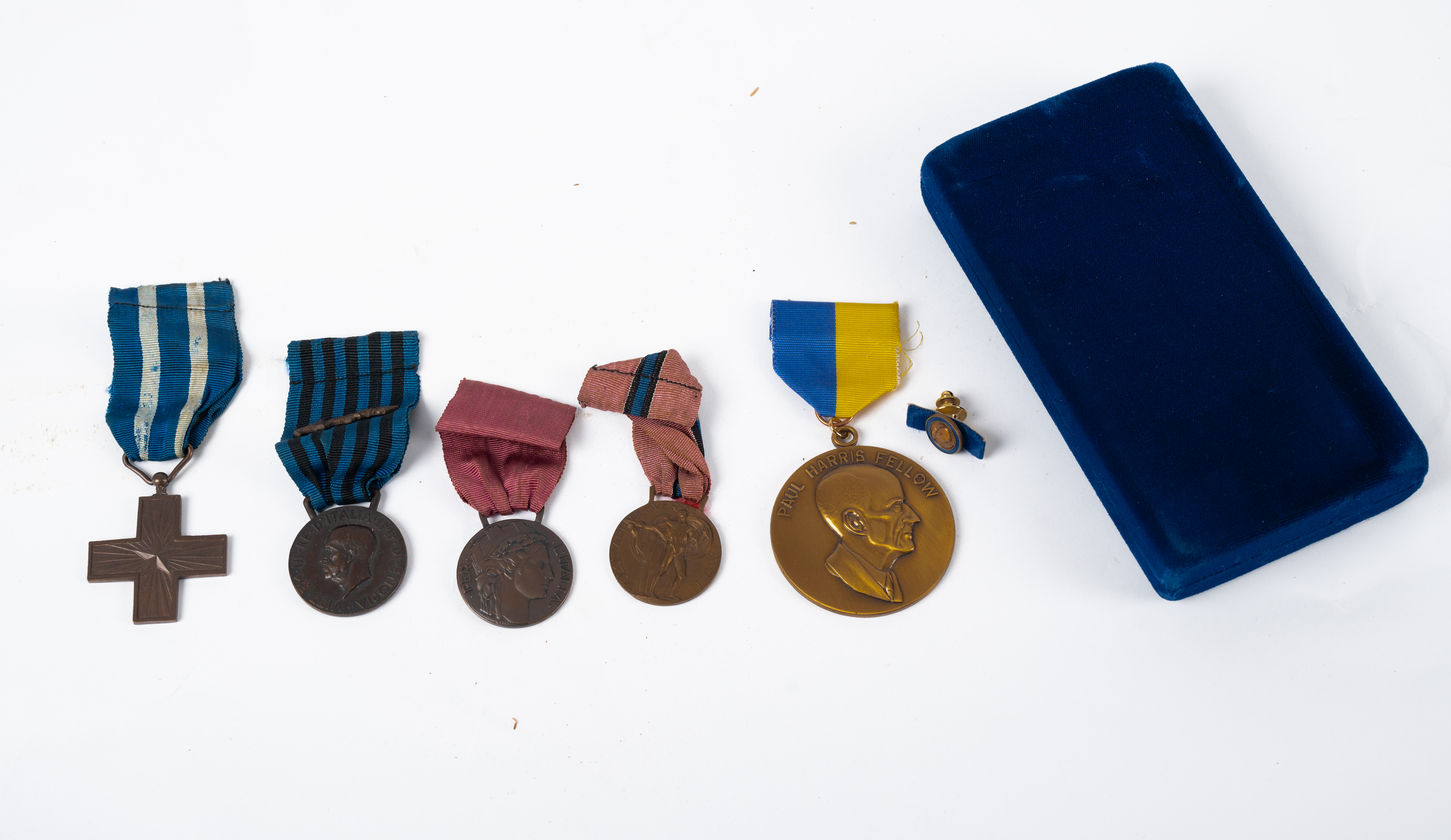CINQUE MEDAGLIE VARIE: 1) MEDAGLIA DEL FONDATORE del ROTARY INTERNATIONAL PAUL HARRIS FELLOW, in cofanetto con bottone. 2) CROCE AL MERITO DI GUERRA, del 1918; venne concessa a tutti i combattenti italiani che avessero onorevolmente prestato servizio attivo per un periodo minimo ben definito (non meno di un anno) in zona di guerra o fossero stati feriti o caduti in azione. 3) MEDAGLIA COMMEMORATIVA DELLE OPERAZIONI MILITARI IN AFRICA ORIENTALE, 1936; venne concessa a tutti i combattenti italiani che avessero onorevolmente prestato servizio attivo in zona di guerra o fossero stati feriti o caduti in azione. 4) MEDAGLIA DI BENEMERENZA PER I VOLONTARI DELLA GUERRA ITALO-AUSTRIACA 1915-1918. La speciale medaglia di benemerenza per i volontari degni di encomio della guerra italo-austriaca del 1915-1918 fu istituita nel maggio 1923 dal governo italiano. La concessione della benemerenza fu estesa a coloro che presero parte volontariamente ai successivi conflitti. 5) MEDAGLIA PER L'ITALIA VOLONTARI DI GUERRA A.O.I. è una Medaglia di benemerenza per i volontari della campagna dell'Africa Orientale 1935-1936, istituita dal Regno d'Italia per chi aveva partecipato alle operazioni militari in AOI.
