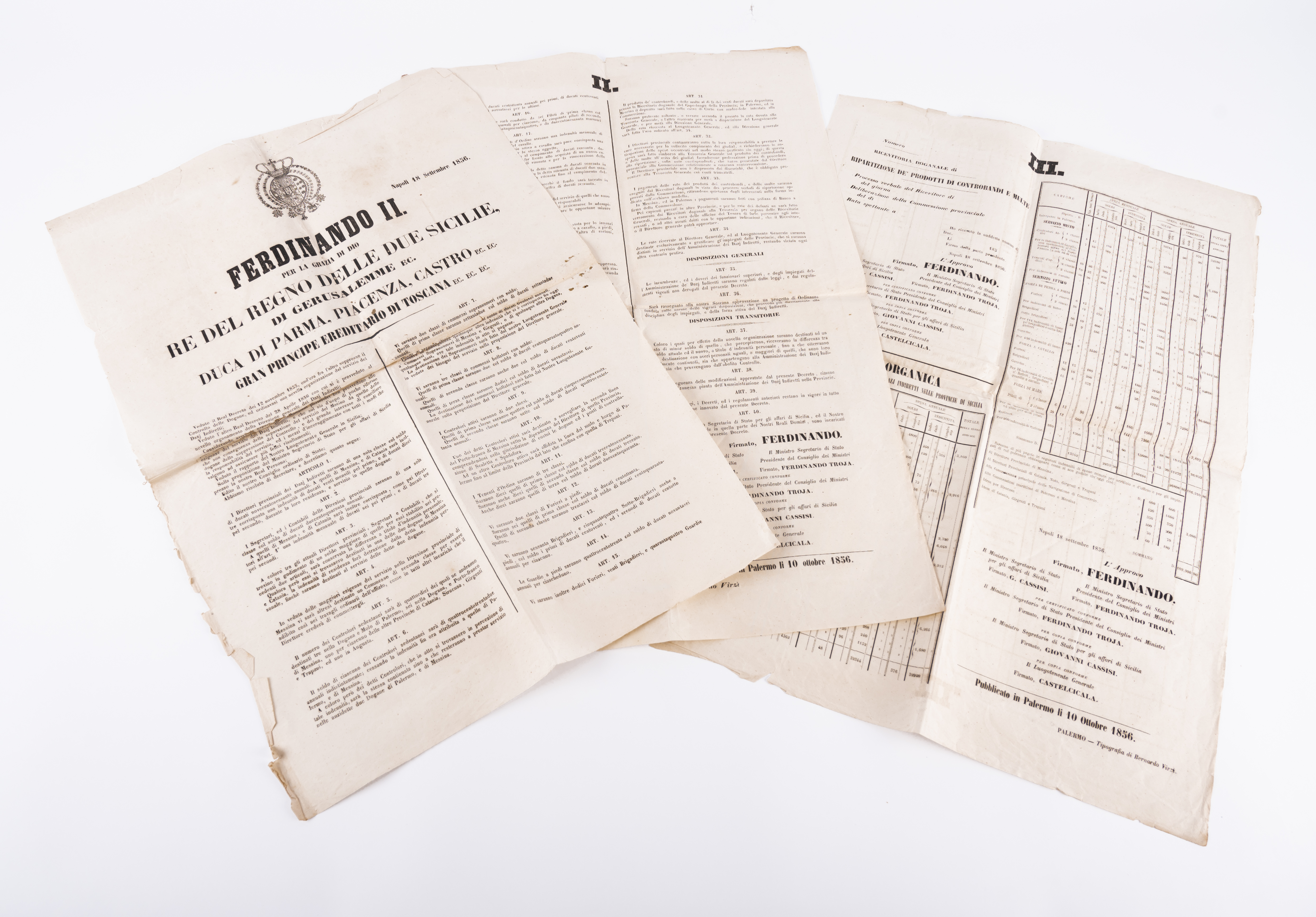 DECRETO A STAMPA DEL REGNO DELLE DUE SICILIE, datato 18 Settembre 1856. Il decreto, inerente i dazi indiretti e la ristrutturazione dei relativi uffici, consta di tre pagine di cm 42 x 63.