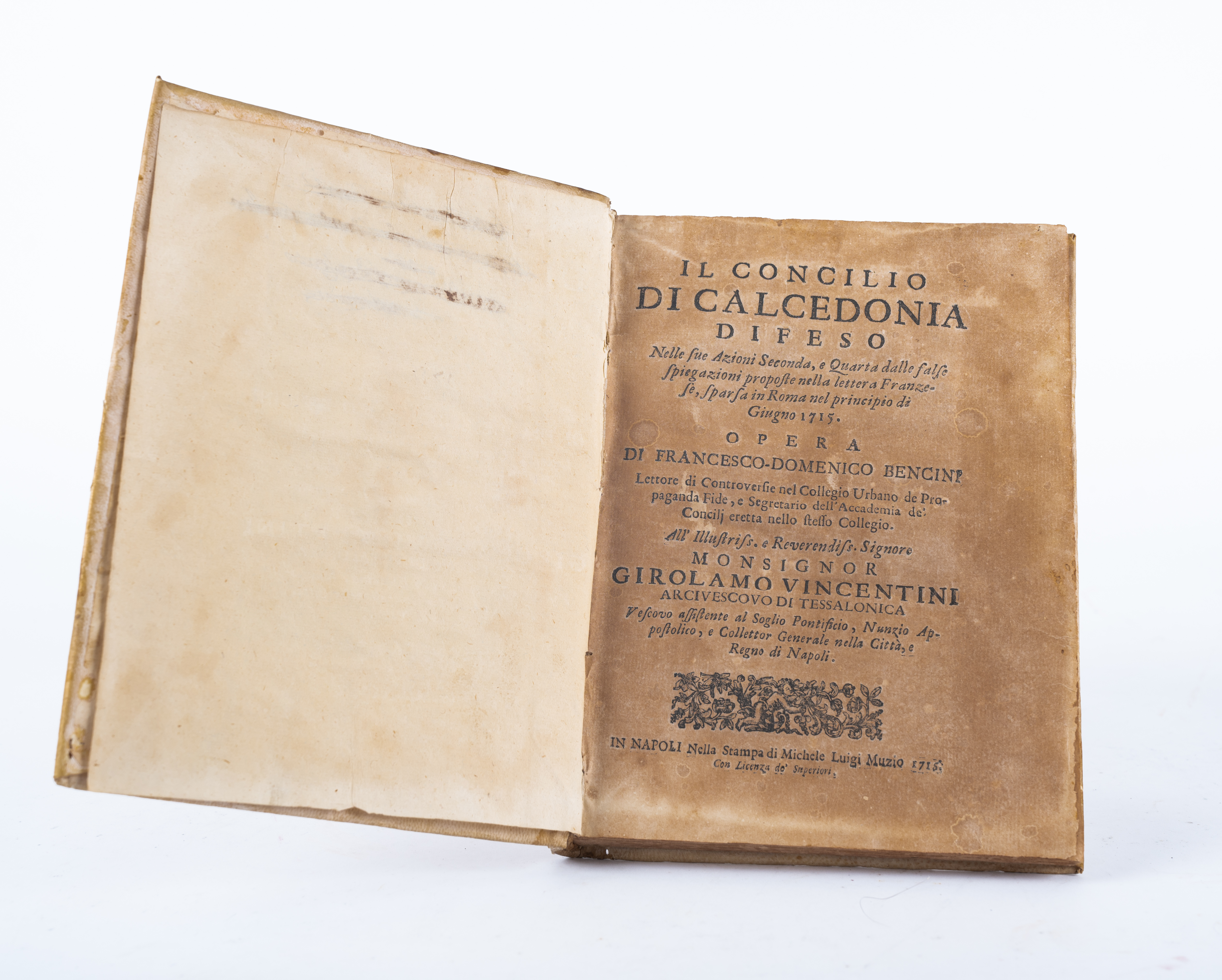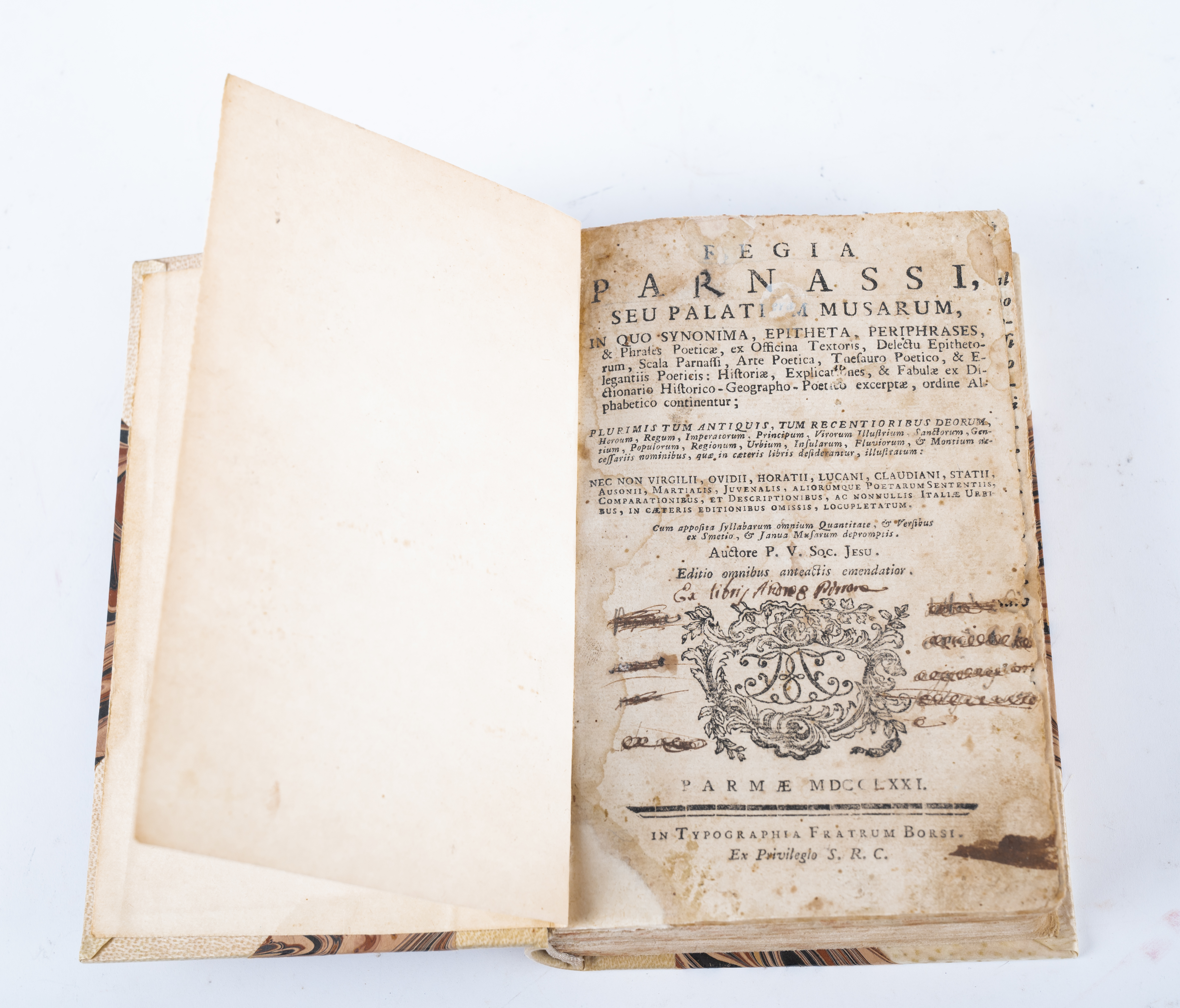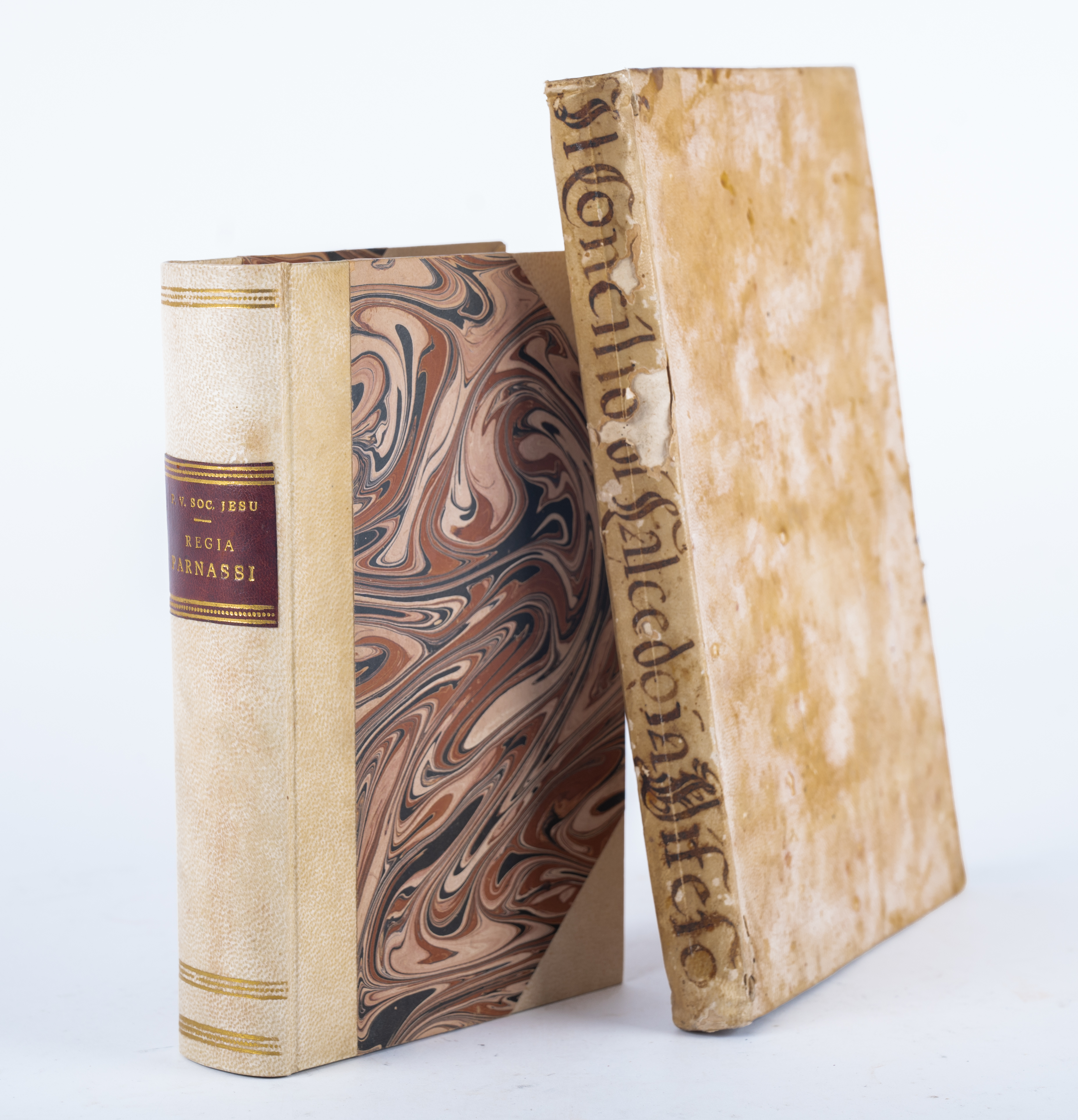 DUE SETTECENTINE A CONTENUTO STORICO E LETTERARIO: 1) Francesco Domenico Bencini IL CONCILIO DI CALCEDONIA DIFESO NELLE SUE AZIONI SECONDA, E QUARTA DALLE FALSE SPIEGAZIONI PROPOSTE NELLA LETTERA FRANZESE, SPARSA IN ROMA NEL PRINCIPIO DI GIUGNO 1715. OPERA DI FRANCESCO-DOMENICO BENCINI LETTORE DI CONTROVERSIE NEL COLLEGIO URBANO DE PROPAGANDA FIDE, In Napoli nella Stamperia di Michele Luigi Muzio 1715. In 4°. Legatura coeva in piena pergamena con titoli m. s. al dorso. tracce di appartenenza. Brunitura del tempo alle pagine. Volume in ottime condizioni, con un minuscola manca al dorso. volume rarissimo a trovarsi. Fregio xilografico sul frontespizio. Iniziali xilografiche. Pp. [12], 198, [2]. 2) REGIA PARNASSI SEU PALATIUM MUSARUM IN QUO SYNONIMA … Parma 1771 In Typographia Fratrum Borsi. In 8°. Bella e robusta legatura novecentesca in mezza pergamena con angoli e piatti marmorizzati. titoli in oro al tassello al dorso. filetti e fregi in oro al dorso. pagine in più che discrete condizioni con tracce di restauro. Capilettere finemente incisi, cancellatura a firma coeva al frontespizio. L'autore potrebbe essere Jacques Vaniere cfr. Barbier IV, 1362 ; Backer-Sommervogel VIII, 450 indica come probabili autori Jacques Vaniere o Francois Vavasseur o G. Vialdr. Sul frontespizio monogramma dell'editore. Pp. XX, 486.