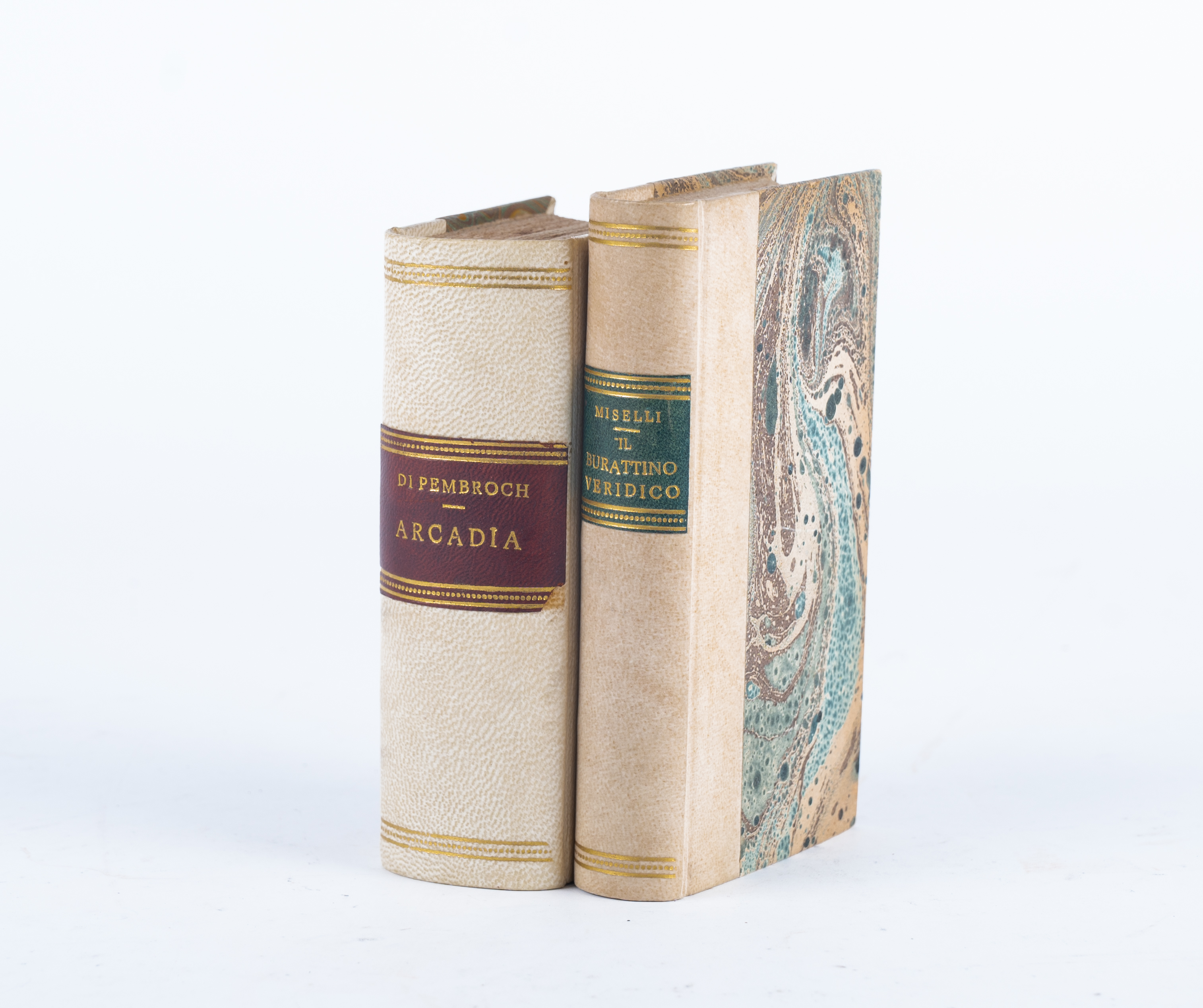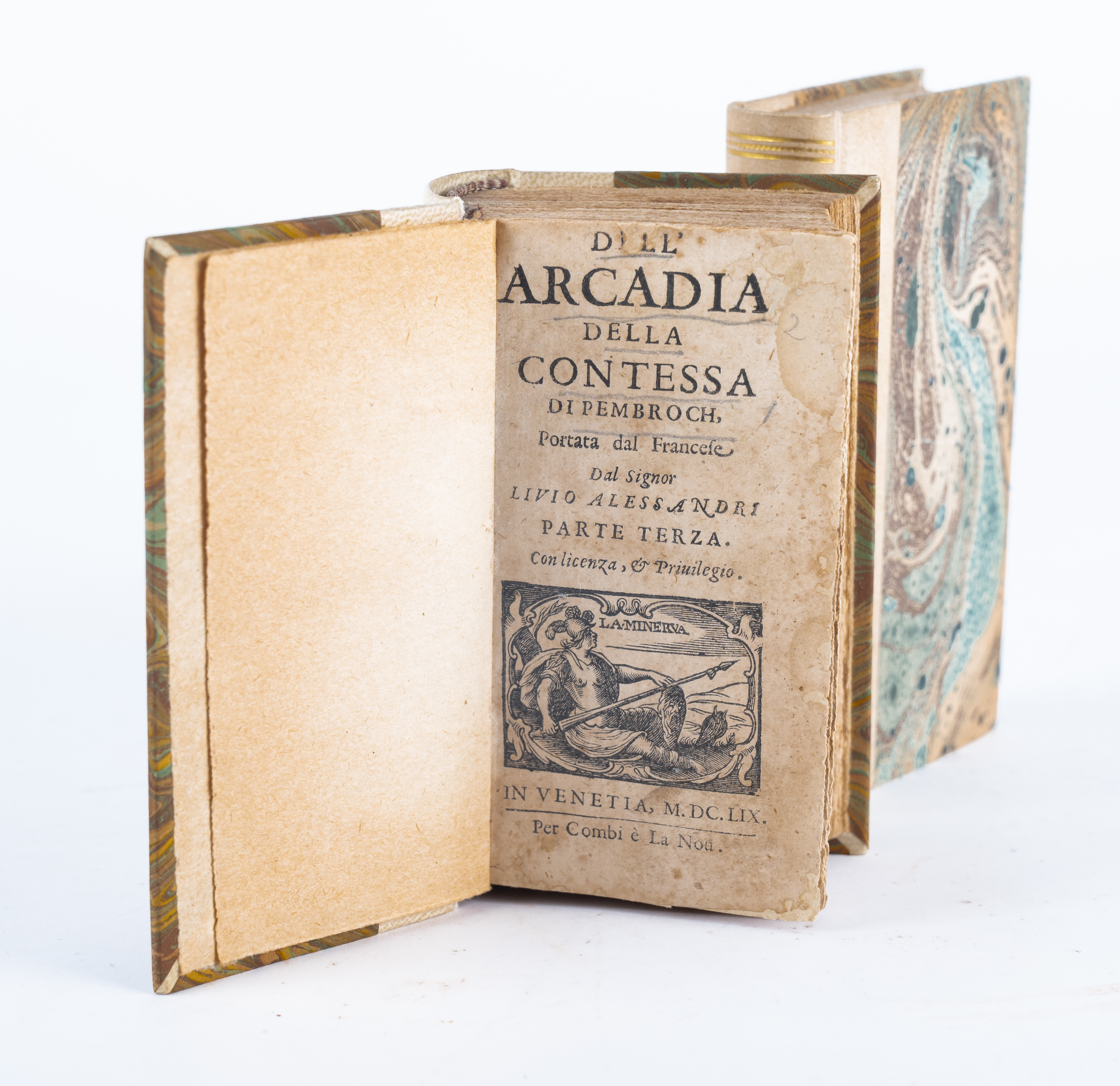 DUE SEICENTINE IN 16°: 1) Giuseppe Miselli ( detto Burattino) IL BURATTINO VERIDICO, OVERO ISTRUZZIONE GENERALE PER CHI VIAGGIA, ed. In Venetia MDCXCVII. Bella legatura novecentesca in mezza pergamena con piatti marmorizzati e titoli in oro antro tassello al dorso. filetti e fregi in oro al dorso. pagine rifilate ma pulite e ben tenute. Testatina e capilettera incisi. Pp. 342, (6). 2) Livio Alessandri DELL'ARCADIA DELLA CONTESSA DI PEMBROCH, PORTATA DAL FRANCESE DAL SIGNOR LIUIO ALESSANDRI PARTE TERZA, ed. In Venetia MDCLIX, per Combi e La Nou. Bella legatura novecentesca in mezza pergamena con piatti marmorizzati e titoli in oro antro tassello al dorso. filetti e fregi in oro al dorso. pagine rifilate ma pulite e ben tenute. Testatine e capilettera incisi. Note e glosse manoscritte. Pp. 776.