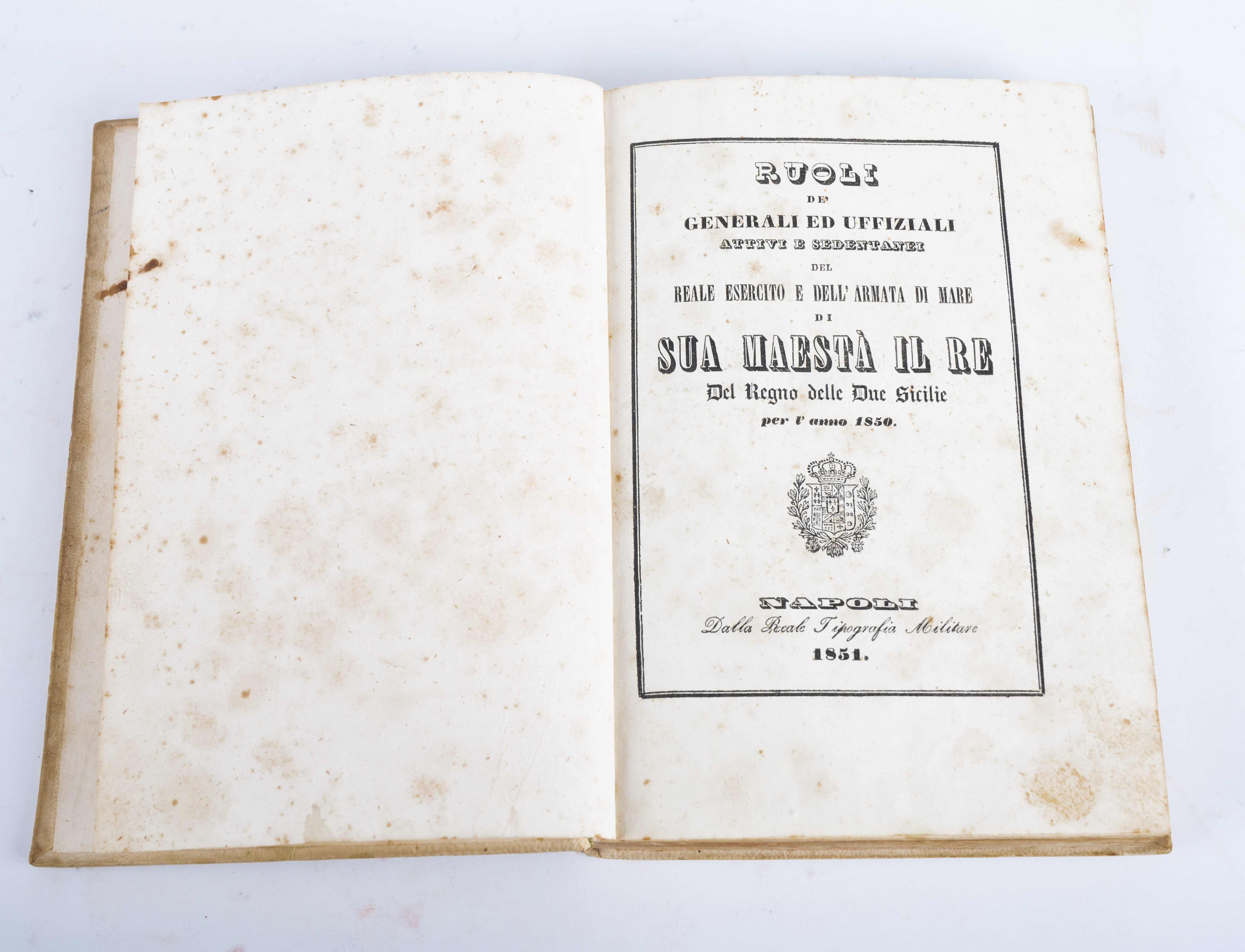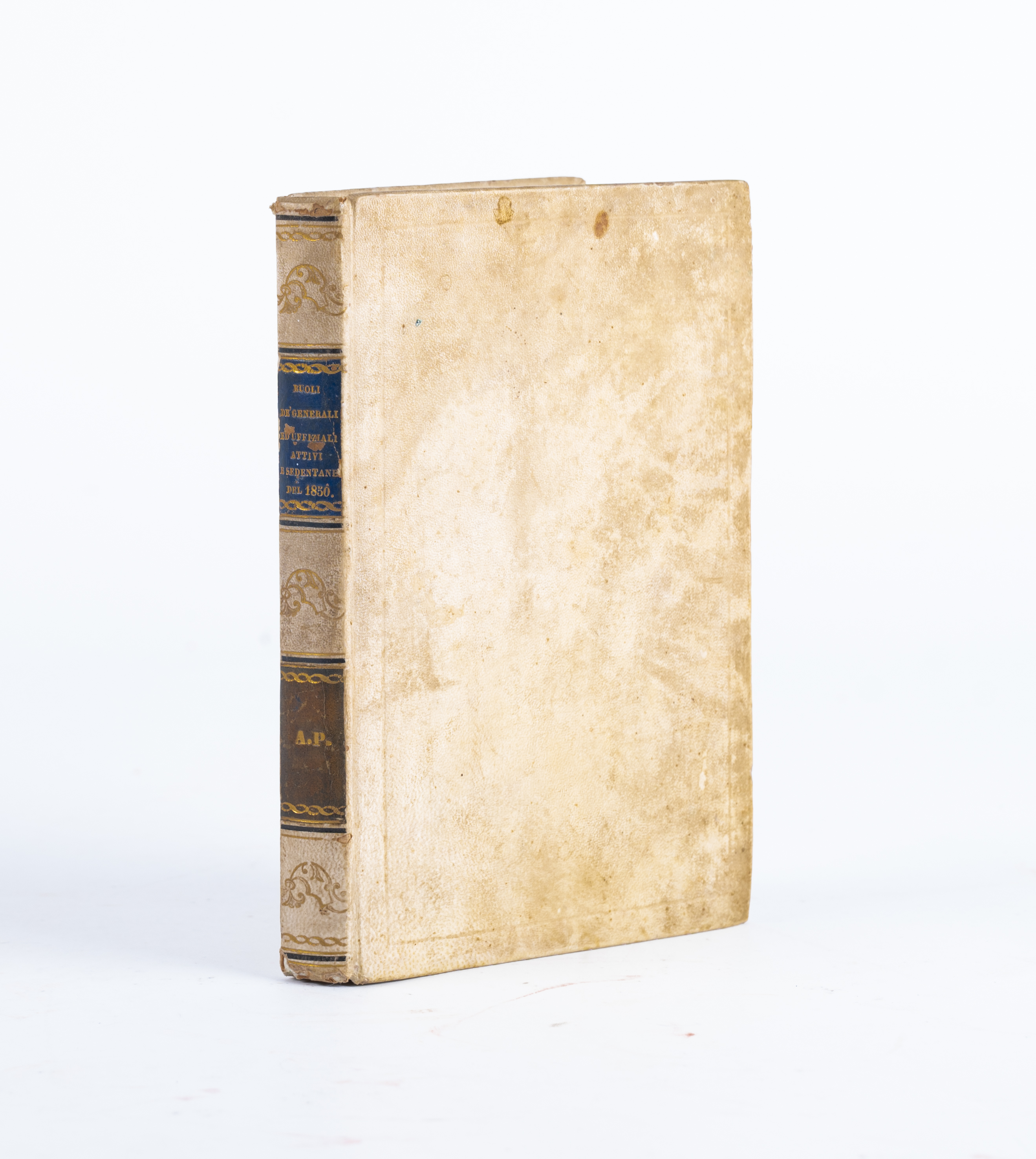 RUOLI DE’ GENERALI ED UFFIZIALI ATTIVI E SEDENTARI DEL REALE ESERCITO E DELL’ARMATA DI MARE DI SUA MAESTA’ IL RE DEL REGNO DELLE DUE SICILIE PER L’ANNO 1850, ed. Napoli, Dalla Reale Tipografia Militare 1851. Legatura coeva in piena pergamena rigida, con titoli entro tassello al dorso, filetti, fregi e iniziali di appartenenza, entro tassello, in oro al dorso. volume in perfette condizioni con pagine ancora fresche. Note e glosse manoscritte. Pagine stampate con testo entro cornice. Raro. Pp. 218.
