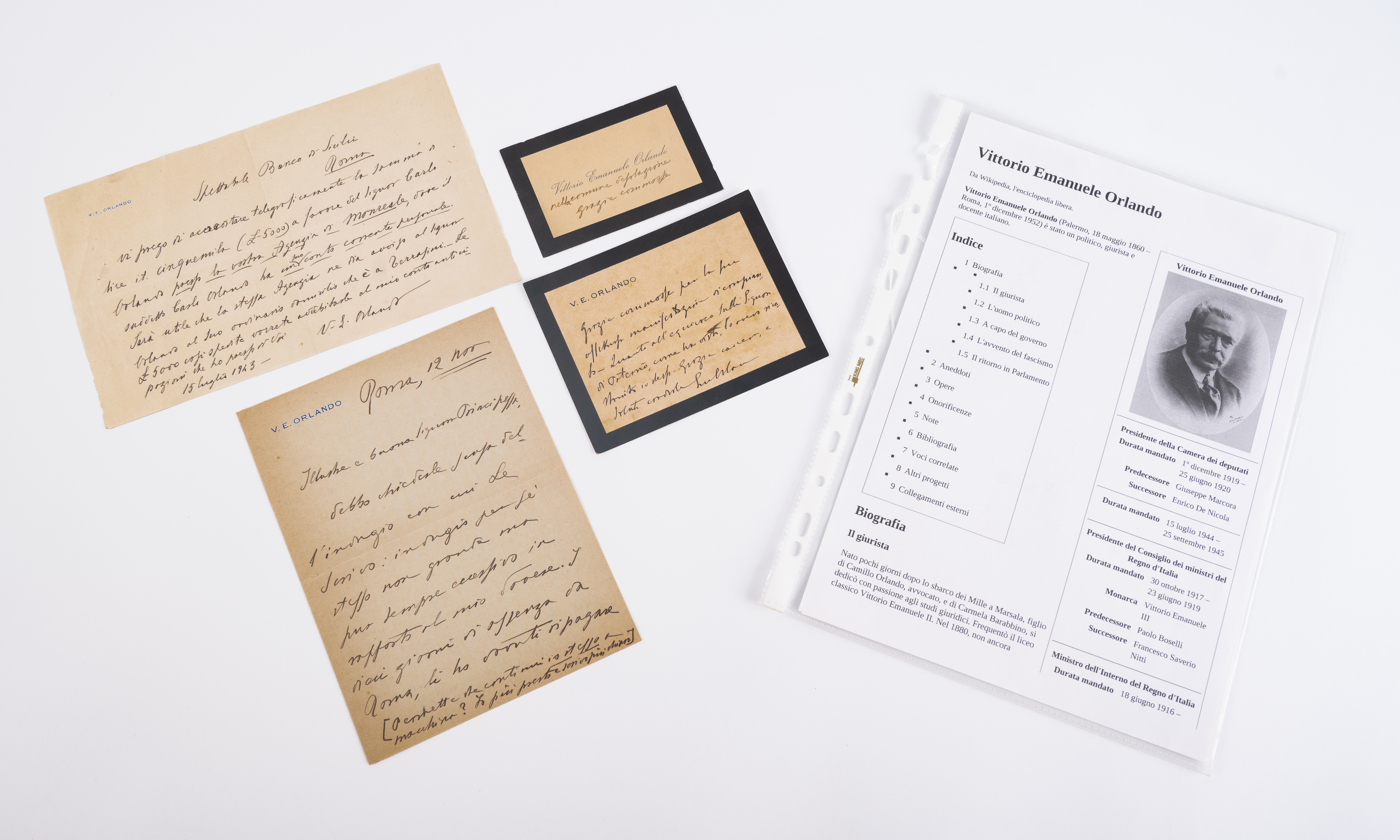 DUE LETTERE E DUE BIBLIETTI AUTOGRAFI DI VITTORIO EMANUELE ORLANDO. Le due lettere, entrambe su carta intestata, sono: l’una scritta a mano ed in parte dattilografata e firmata in fine porta la data del 12 Novembre senza anno; l’altra riporta la data del 15 Luglio 1943. I due biglietti autografi risultano su carta intestata ma senza data.