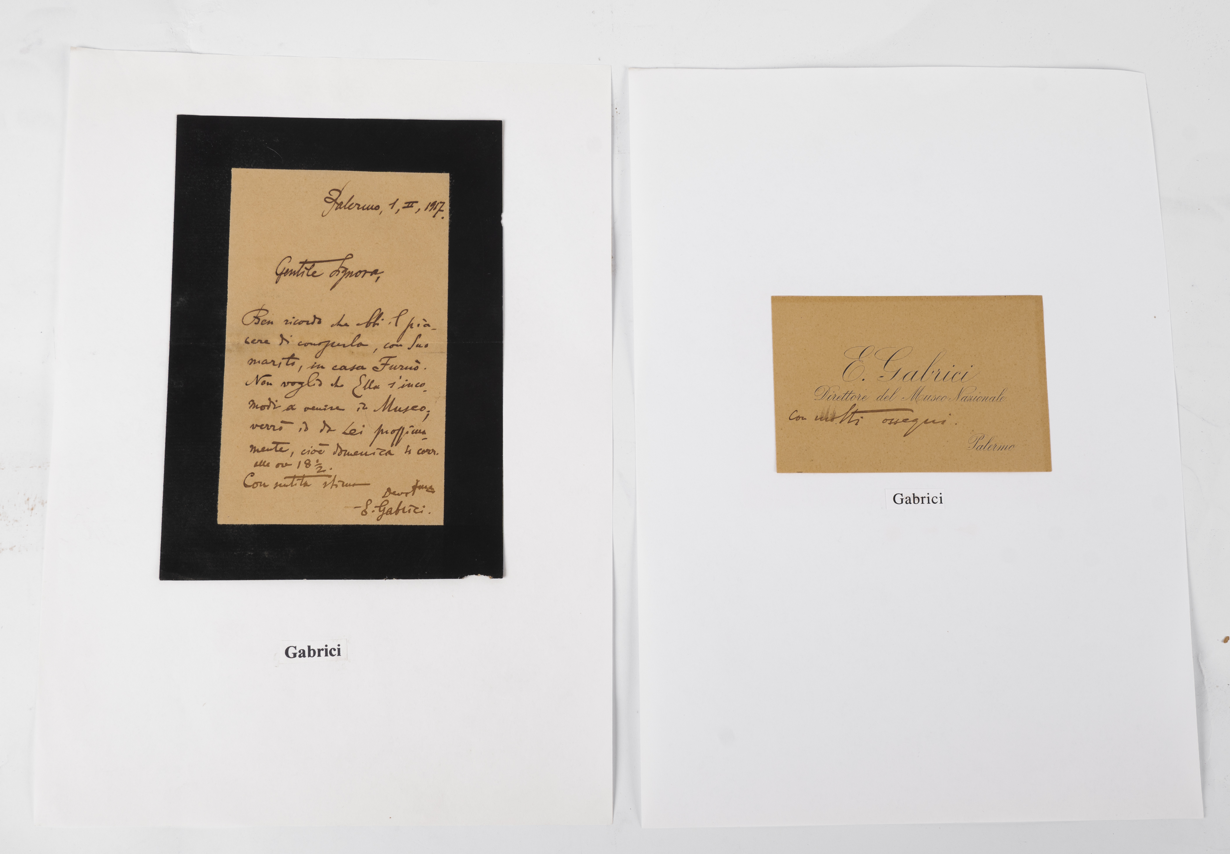 DUE BIGLIETTI AUTOGRAFI DI ETTORE GABRICI. Il primo datato Palermo 1 Febbraio 1917 e l’altro è senza data. Ettore Gabrici (Napoli, 1868 – Palermo, 1962) è stato un archeologo e numismatico italiano. Nel 1926 fu nominato soprintendente archeologo, continuando a lavorare a Palermo. L'anno successivo vinse il concorso per la cattedra di archeologia e storia dell'arte antica all'Università di Palermo, dove continuò nell'insegnamento fino al 1939, quando andò in pensione; ma non smise la sua attività di ricercatore, pubblicando lavori sino agli anni 1950.