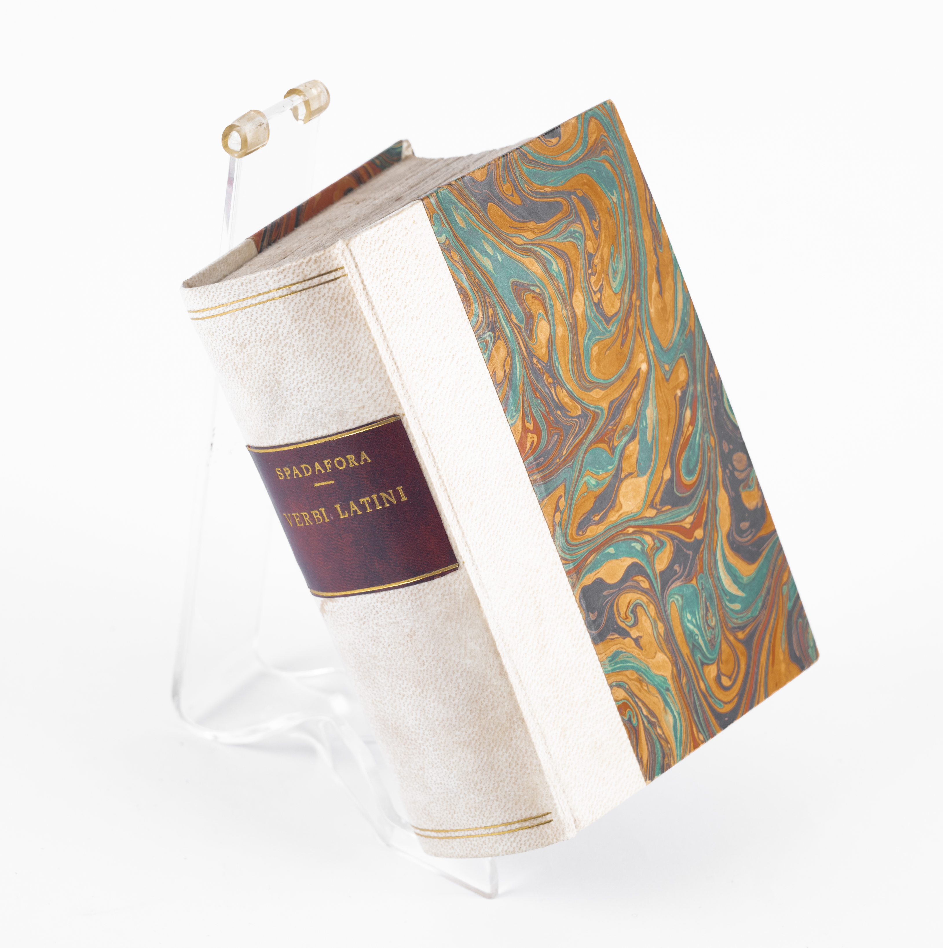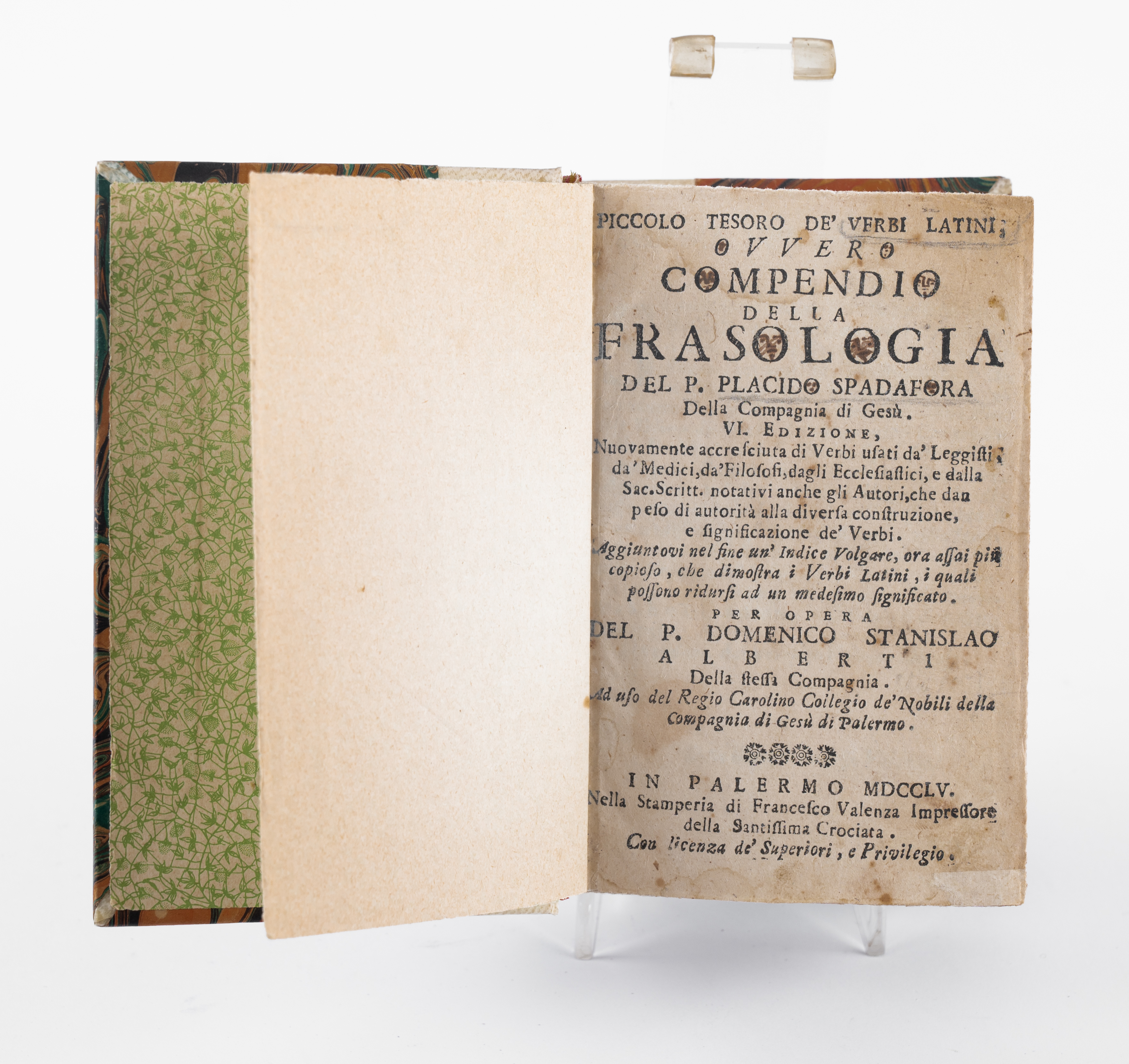 SETTECENTINA pubblicata a Palermo di Placido Spatafora COMPENDIO DELLA FRASOLOGIA DEL P. PLACIDO SPATAFORA, ed. Palermo, Francesco Valenza MDCCLV. In 16°. Legatura novecentesca in mezza pergamena e piatti marmorizzati. titoli impressi in oro al tassello al dorso; tagli goffrati a secco. Rifilatura del testo. Pagine pulite e ben tenute. Pp. 752. Raro a trovarsi. Placido Spadafora (Palermo, 1628 – Palermo, 1691) è stato un grammatico e gesuita italiano, autore tra l'altro di una Prosodia italiana (1682), dizionario di pronuncia e soprattutto di accentazione, più volte ristampato fino all'800.