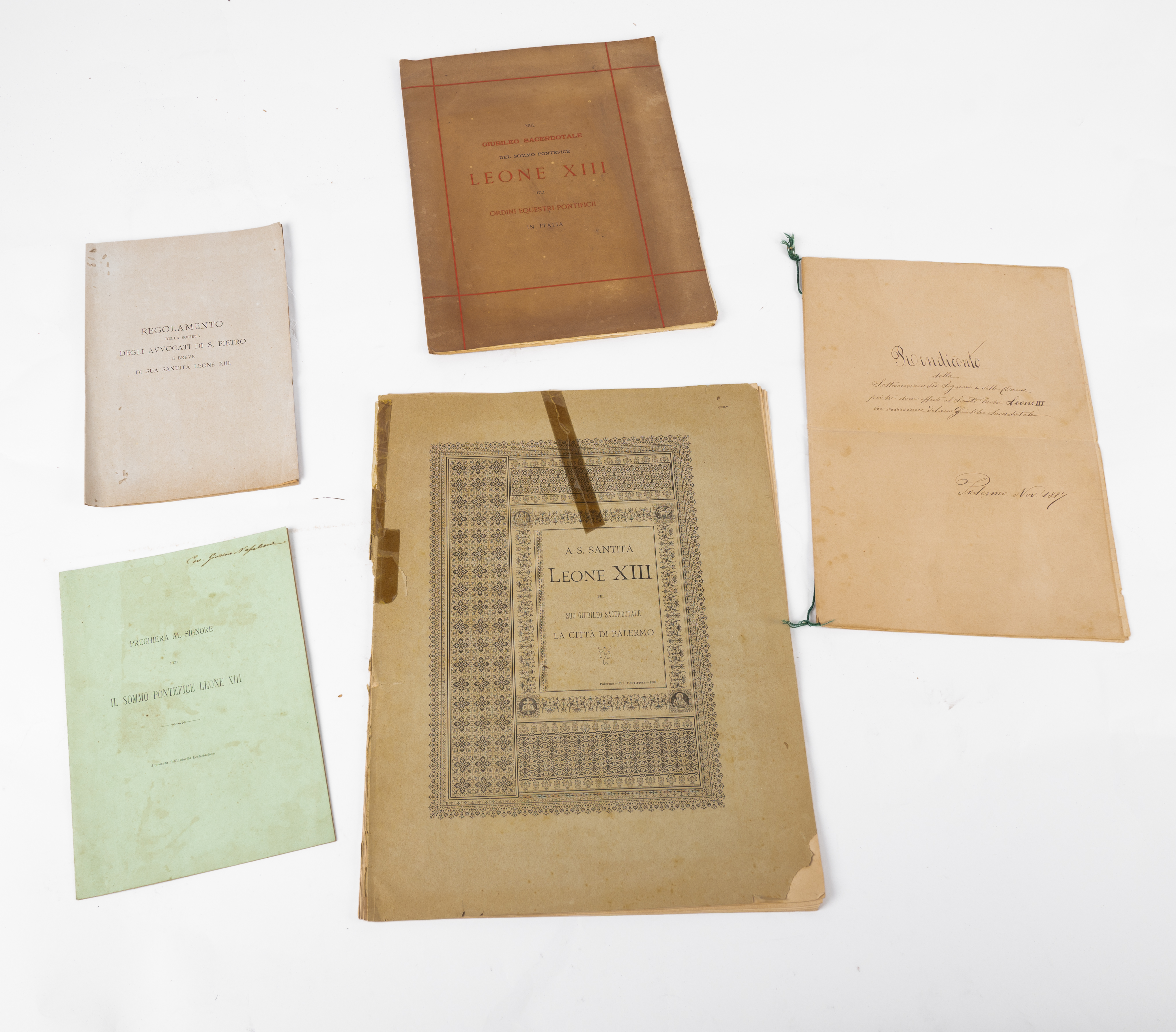 QUATTRO OPUSCOLI ED UN DOCUMENTO OPUSCOLI RELATIVI A PAPA LEONE XIII ED AL SUO GIUBILEO SACERDOTALE: 1) REGOLAMENTO DELLA SOCIETA’ DEGLI AVVOCATI DI S. PIETRO E BREVE DI SUA SANTITA’ LEONE XIII, , ed. Tipografia Monaldi, Roma s. d. in 8°. In ottime condizioni. pp. 8. 2) PREGHIERA AL SIGNORE PER IL SOMMO PONTEFICE LEONE XIII, s. d. ( ma 1888). in 8°. Brossura editoriale originale. Pp. 4. Segni manoscritti di appartenenza del Cav. Napoleone Giusino alla copertina. 4) AL SOMMO PONTEFICE LEONE XIII GLI ORDINI EQUESTRI PONTIFICI IN ITALIA, ed. Gennaio MDCCCLXXXVIII. In 4°. Brossura editoriale. Incisione in antiporta. Pp. 15 con testo stampato entro cornice. Tagli irregolari. 4) A S. SANTITA’ LEONE XIII PEL SUO GIUBILEO SACERDOTALE LA CITTA’ DI PALERMO, ed. Palermo, Tipografia Pontificia 1887. In 4° grande. Brossura editoriale con normali usure d’uso ed uno strappetto rammendato. Pagine in ottime condizioni. testo stampato entro cornice floreale. Pp. 30. 5) RENDICONTO DELLA SOTTOSCRIZIONE DEI SIGNORI E DELLE DAME PEI TRE DONI OFFERTI AL SANTO PADRE LEONE III IN OCCASIONE DEL SUO GIUBILEO SACERDOTALE, Palermo Novembre 1887. Interessantissimo rendiconto manoscritto, con un errore di scrittura Leone III anziché Leone XIII, relativo alle sottoscrizioni in denaro ed ai doni, citati in fine, che furono elargiti dalle famiglie più in vista della società palermitana di allora, ed il cui elenco con la relativa sottoscrizione compare nel Rendiconto.