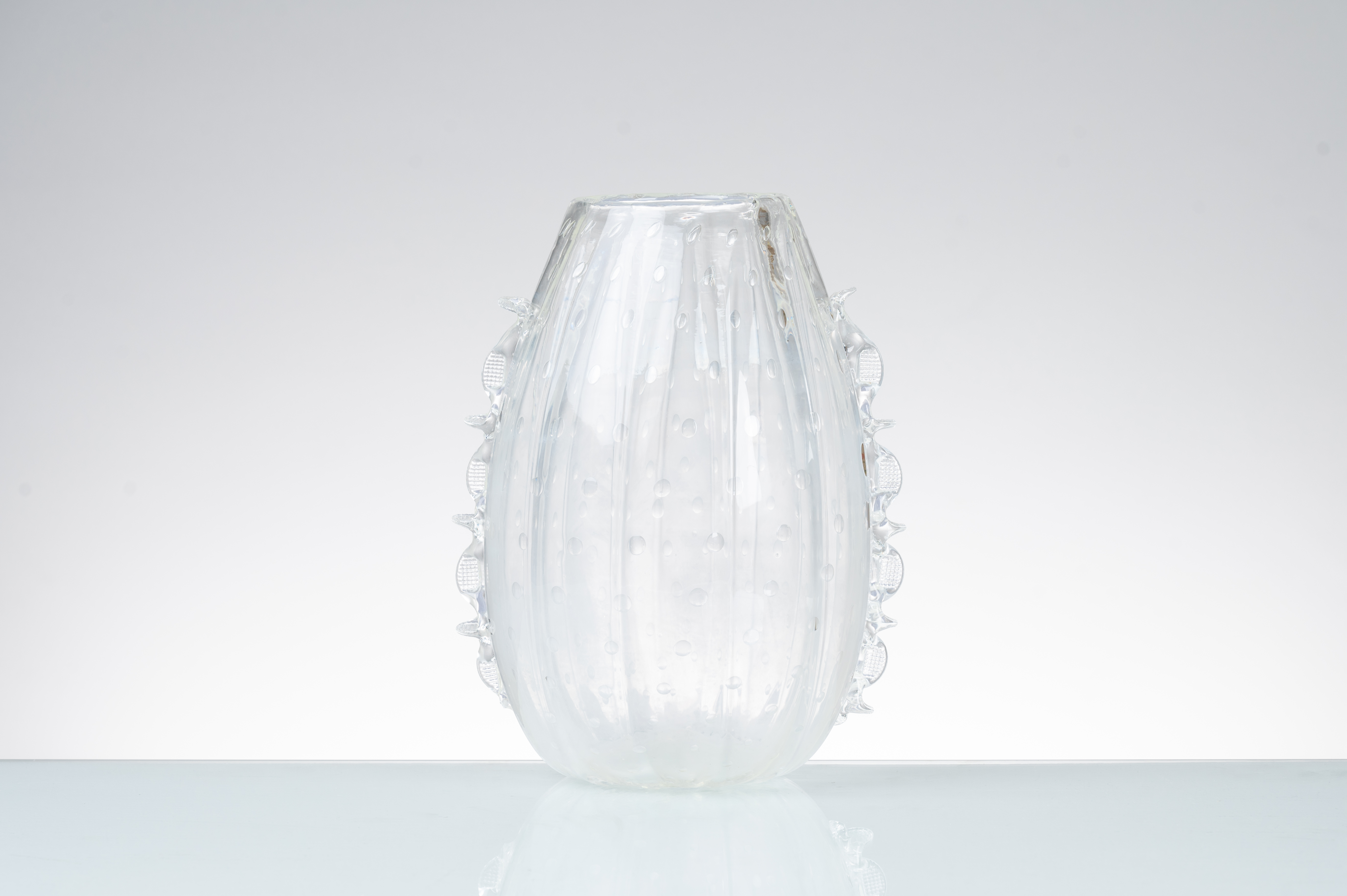 Vaso in vetro incolore bullicante, corpo ovalizzato decorato con costolature verticali, anse pizzicate lungo i fianchi. Difetto ad un’ansa e tracce di calcare.