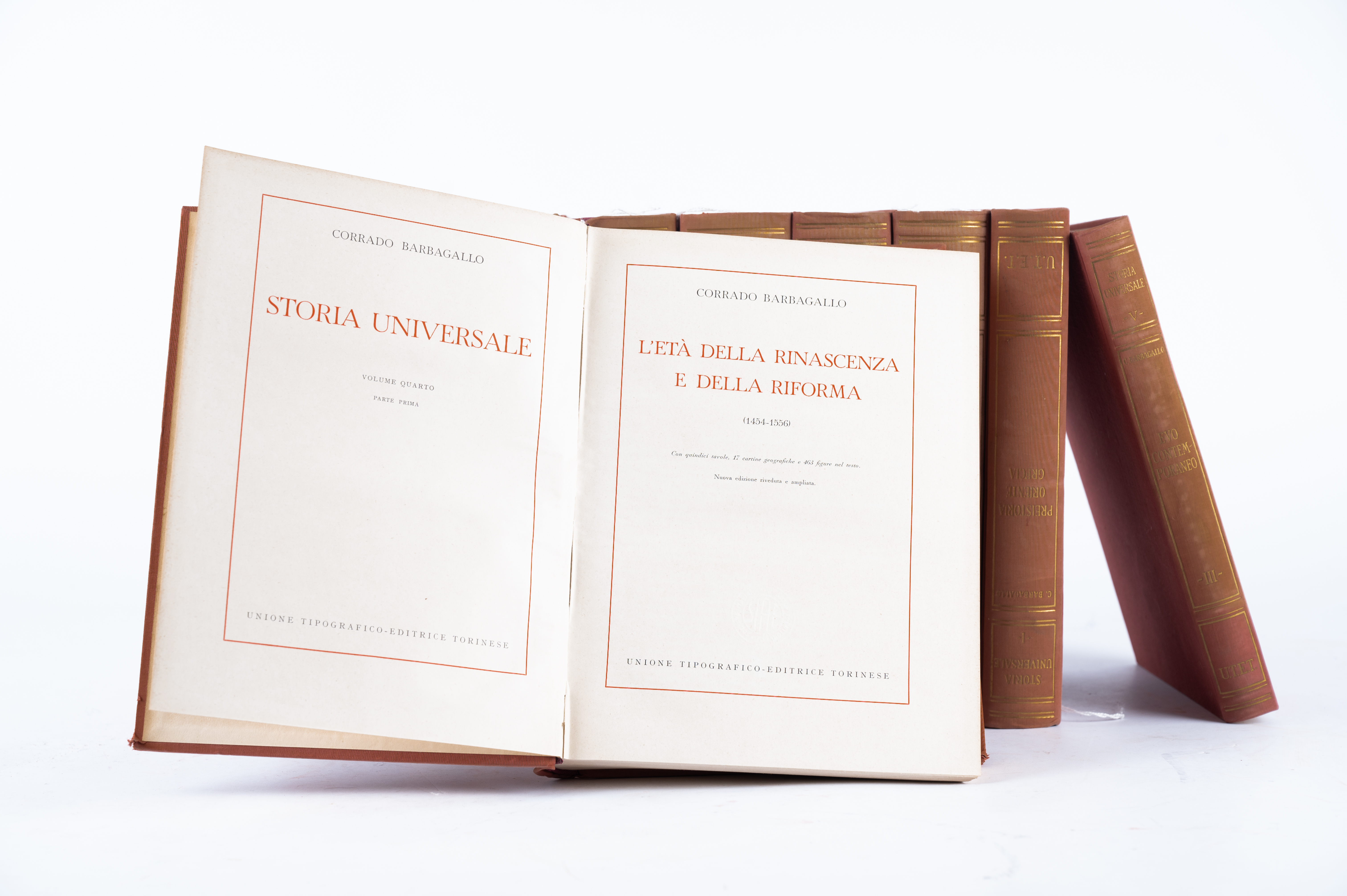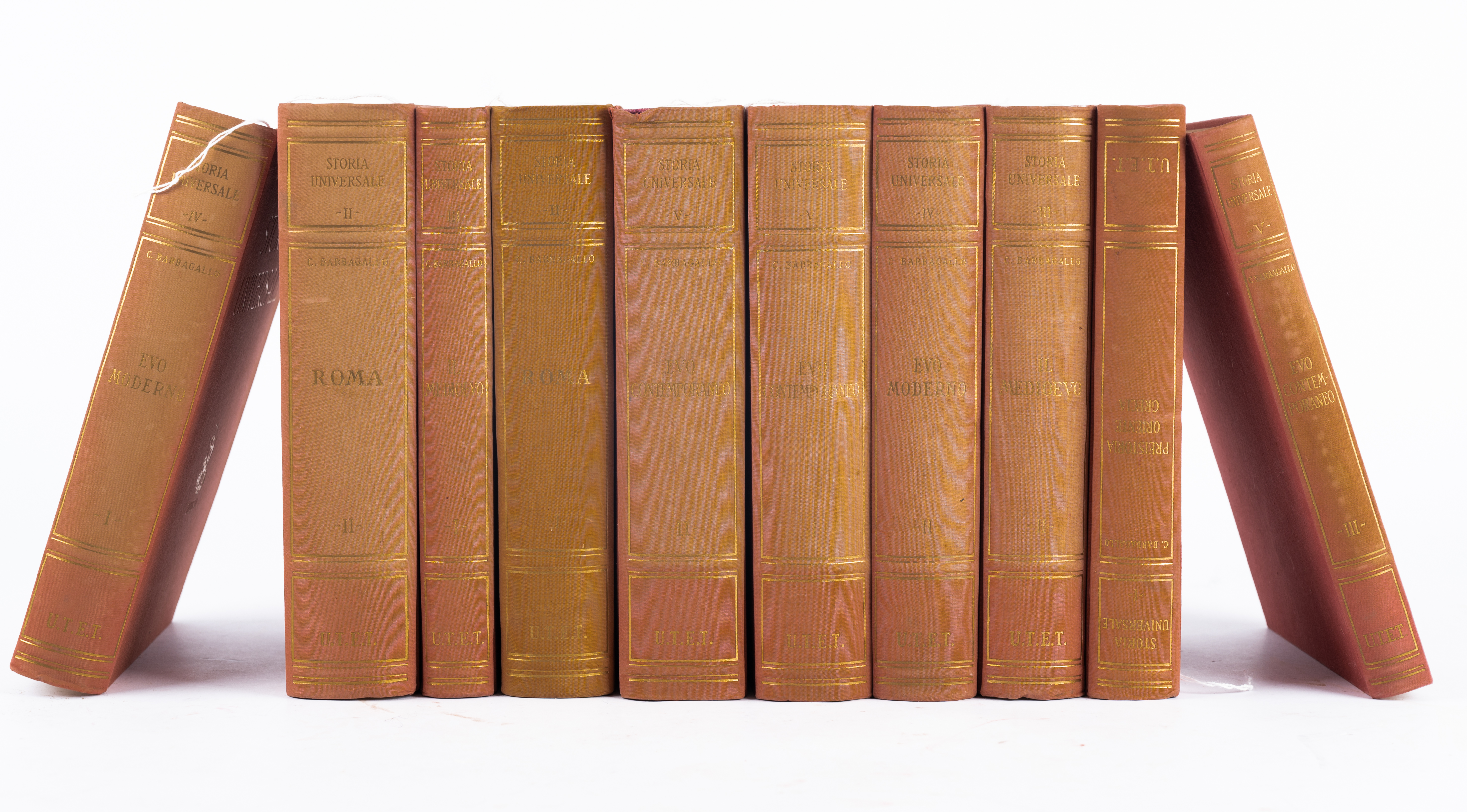 DIECI VOLUMI DI STORIA: Corrado Barbgallo STORIA UNIVERSALE, ed. UTET 1950 – 1954. Dieci volumi in 8°. Legatura editoriale in piena tela con titoli impressi in oro ai piatti e ai dorsi. Opera completa in 10, in ottimo stato con pagine integre e pulite, con tavole fuori testo illustrazioni e cartine. Piano dell’opera: 1: Preistoria, Oriente, Grecia (... IV sec. a C.). - 1950. - XV, 574 p. : con [10] tavole, 19 cartine storico-geografiche e 225 figure nel testo; 2.1: Roma antica : dalle origini alla fine della Repubblica (VIII sec. a C. 49 d. C.). - 1951. - XIV, 823 p. : con [9] tavole e 1 cartina a colori fuori testo, 42 cartine geografiche e 295 figure nel testo; 2.2: Roma antica: l'Impero (49 a C. 476 d. C.). - 1952. - XII, [825]-1721 p. : con 1 carta storico-geografica e [12] tavole fuori testo, 7 cartine geografiche e 484 figure nel testo; 3.1: Il Medioevo (476-Sec. 11). - 1950.- VIII, 467 p. : con [4] tavole, 20 cartine geografiche e 364 figure nel testo; 3.2: Il Medioevo (Sec. 11.-1454). - 1950. - VIII, [469]-1218 p. : con [8] tavole, 20 cartine geografiche e 462 figure nel testo; 4.1: L'età della Rinascenza e della Riforma (1454-1556). - 1950. - XII, 680 p.: con [15] tavole, 17 cartine geografiche e 463 figure nel testo; 4.2: Controriforma e prerivoluzione (1556-1699). - 1950. - VIII, [681]-1368 p. : con [11] tavole, 14 cartine geografiche e 360 figure nel testo; 5.1: Riforme e rivoluzioni (1699-1799). - 1951. - XVI, 794 p. : con [11] tavole, 13 cartine geografiche e 455 figure nel testo; 5.2: Dall'età Napoleonica alla fine della prima guerra mondiale (1799-1919). -1953. - XII, [795]-1678 p. : con [14] tavole, 36 cartine geografiche e 570 figure nel testo; 5.3: Dalla fine della prima guerra mondiale allo scoppio della seconda (1919-1939) /note bibliografiche a cura di Gino Luzzatto. - 1954. - XII, 361 p. : con 12 tavole e 280 figure nel testo.