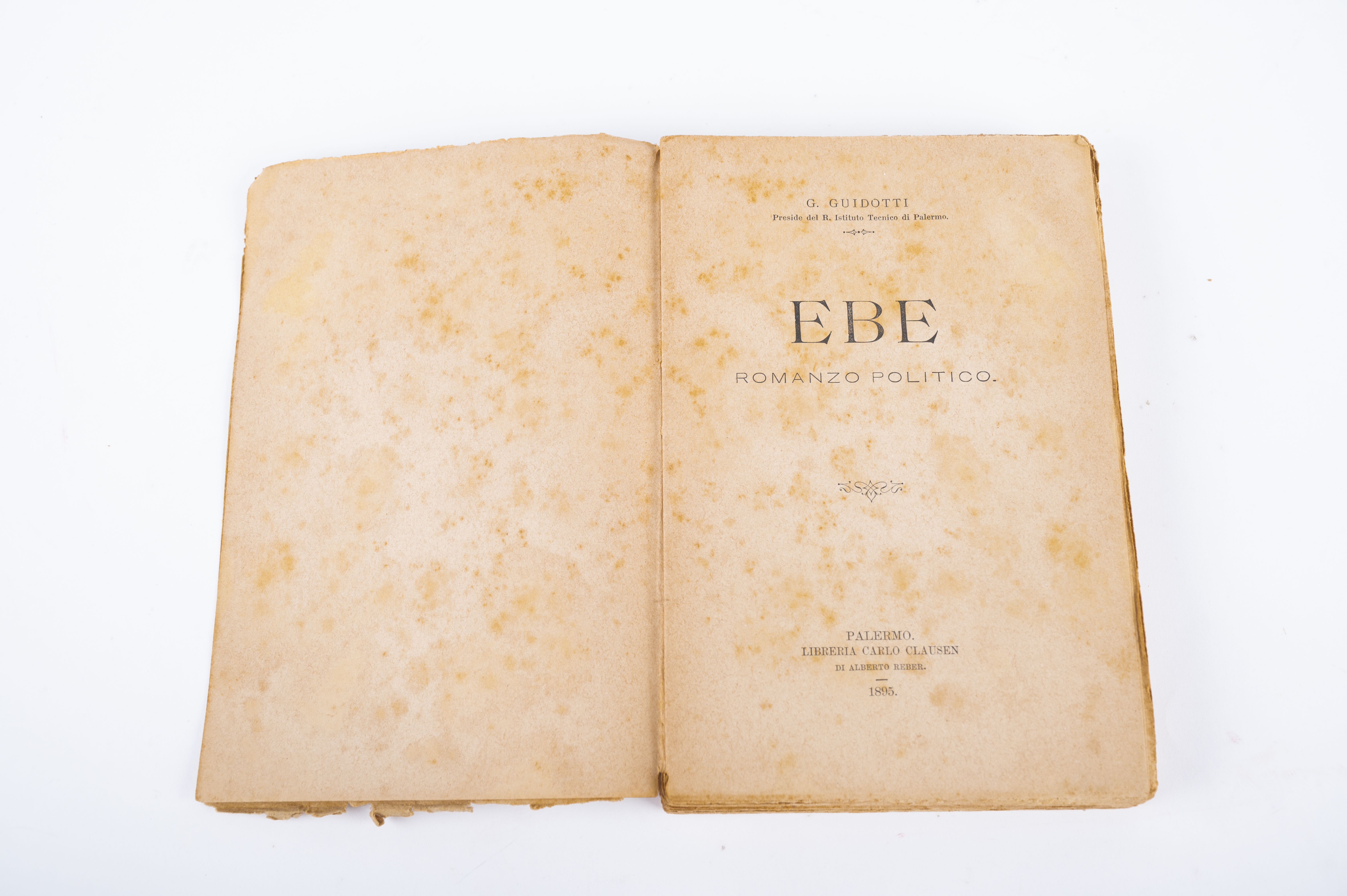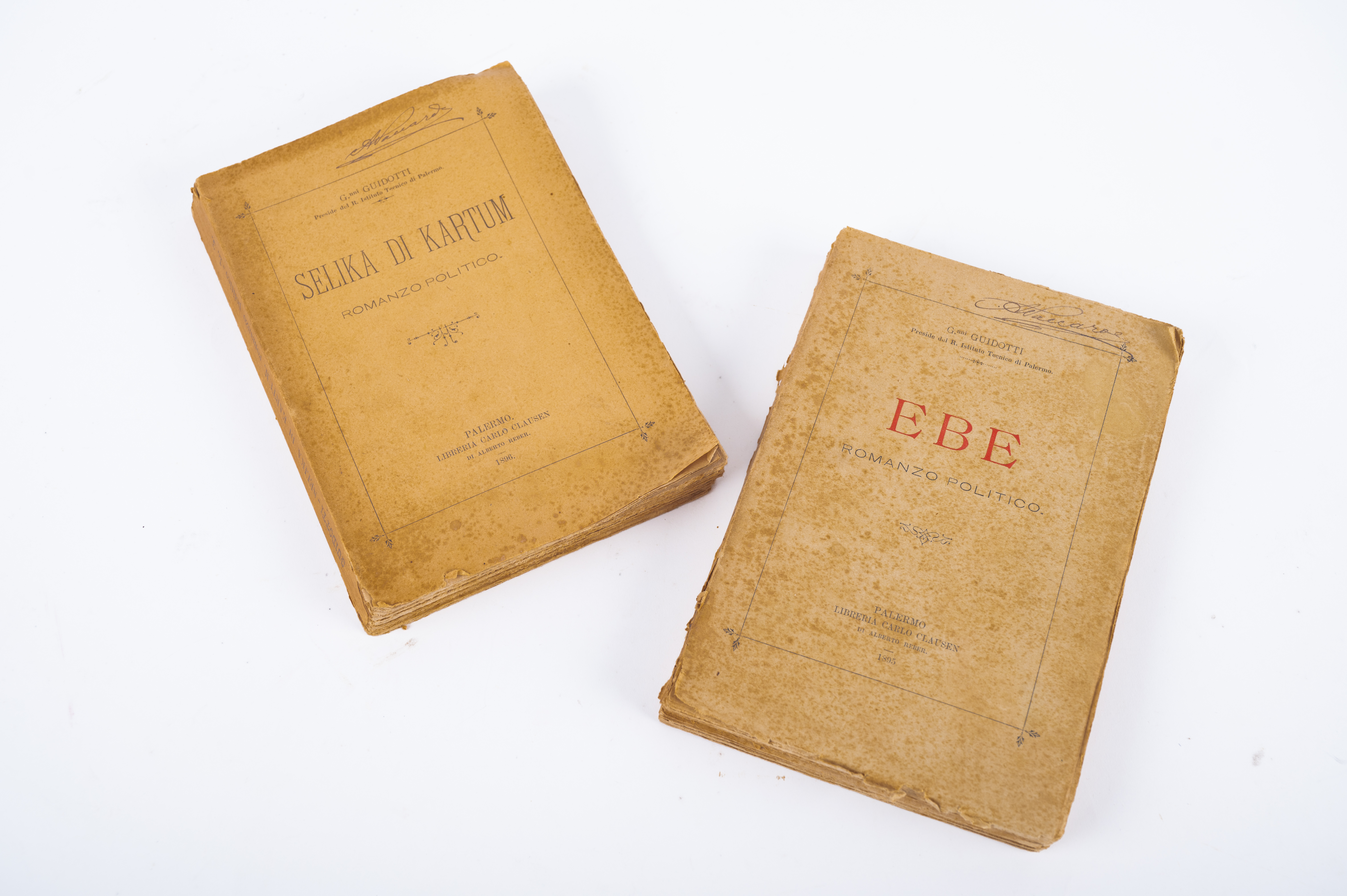 DUE RARISSIMI VOLUMI di Giovanni Guidotti: 1) EBE. ROMANZO POLITICO, ed. Palermo, Carlo Clausen 1895. In 8° piccolo. Brossura editoriale marginosa. Fioriture sparse ma volume in più che discrete condizioni. pp. 254. 2) SELIKA DI KARTUM. ROMANZO POLITICO, ed. Palermo, Carlo Clausen 1896. In 8° piccolo. Brossura editoriale e tagli marginosi. Fioriture sparse ma volume in più che discrete condizioni. pp. 254.