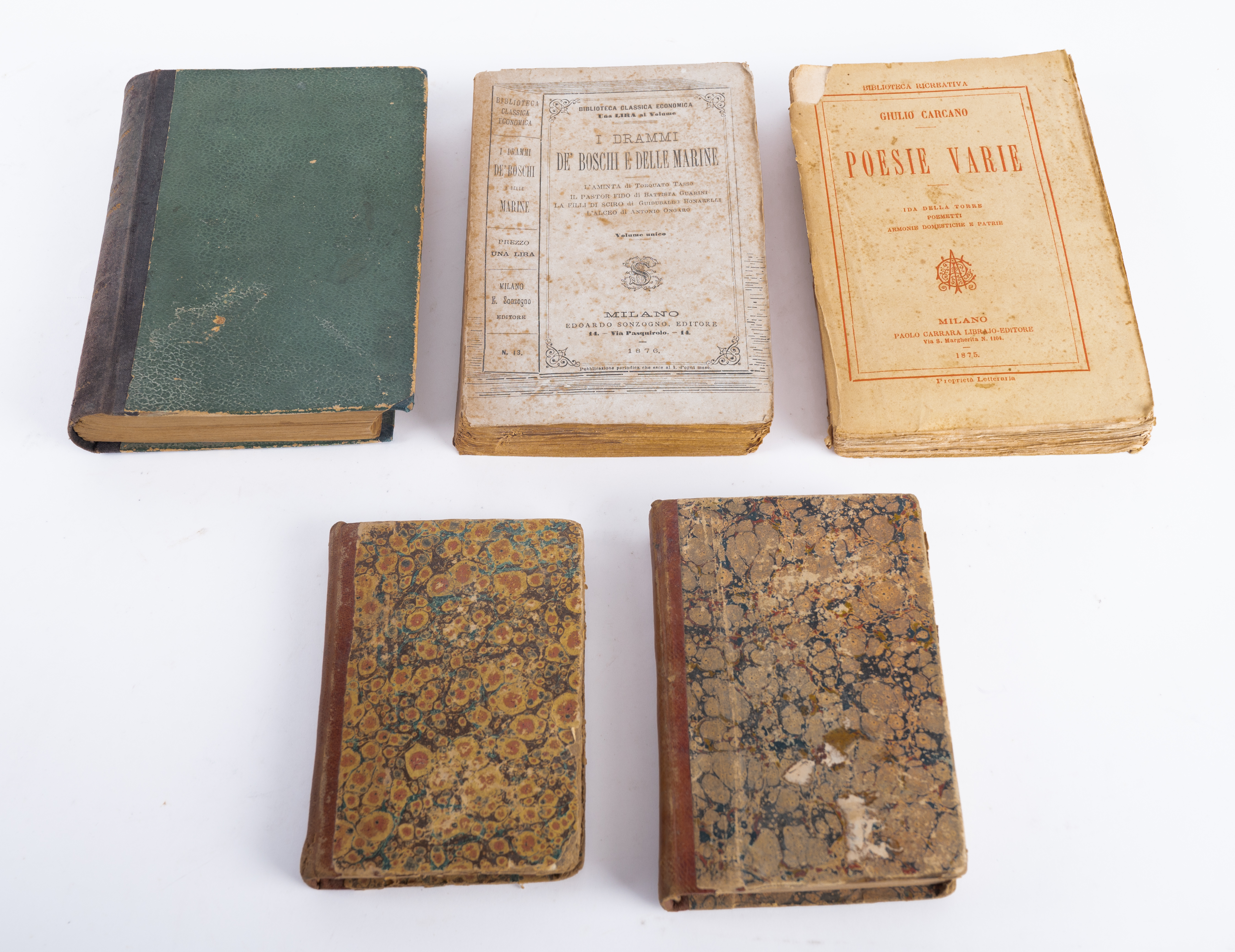 CINQUE OTTOCENTINE DI LETTERATURA: 1) Edmondo De Amicis MAROCCO, ed. Milano, Fratelli Treves 1885. In 8° piccolo. Legatura coeva in mezza percallina con piatti cartonati rigidi e titoli efregi impressi al dorso in oro. Pp. 483. Uno strappetto in ultima pagine, ma volume in buone condizioni. 2) Giulio Carcano POESIE VARIE, ed. Milano, Paolo Carrara 1875. In 8° piccolo. Brossura editoriale. Qualche sporcizia da esposizione ai piatti ma pagine pulite e ben tenute. Pp. 336. 3) I DRAMMI DE’ BOSCHI E DELLE MARINE, ed. Milano, Edoardo Sonzogno 1876. In 8° piccolo. Brossura editoriale con tagli marginosi. Fioriture sparse ma volume in più che discrete condizioni. pp. 427, (4). 4) P. Antonio Bresciani DON GIOVANNI OSSIA IL BENEFATTORE OCCULTO, ed. Napoli, G. Rossi 1863. In 24°. Due volumi in unico tomo. Legatura coeva in mezza pelle muta con piatti marmorizaati. Pp. 145, (4), 154, (2). 5) P. Antonio Bresciani LA CASA DI GHIACCIO OSSIA IL CACCIATORE DI VINCENNES, ed. Napoli, Francesco Giannini 1861. In 24°. Legatura coeva in mezza pelle muta con piatti marmorizzati. Pp. 384, (2).