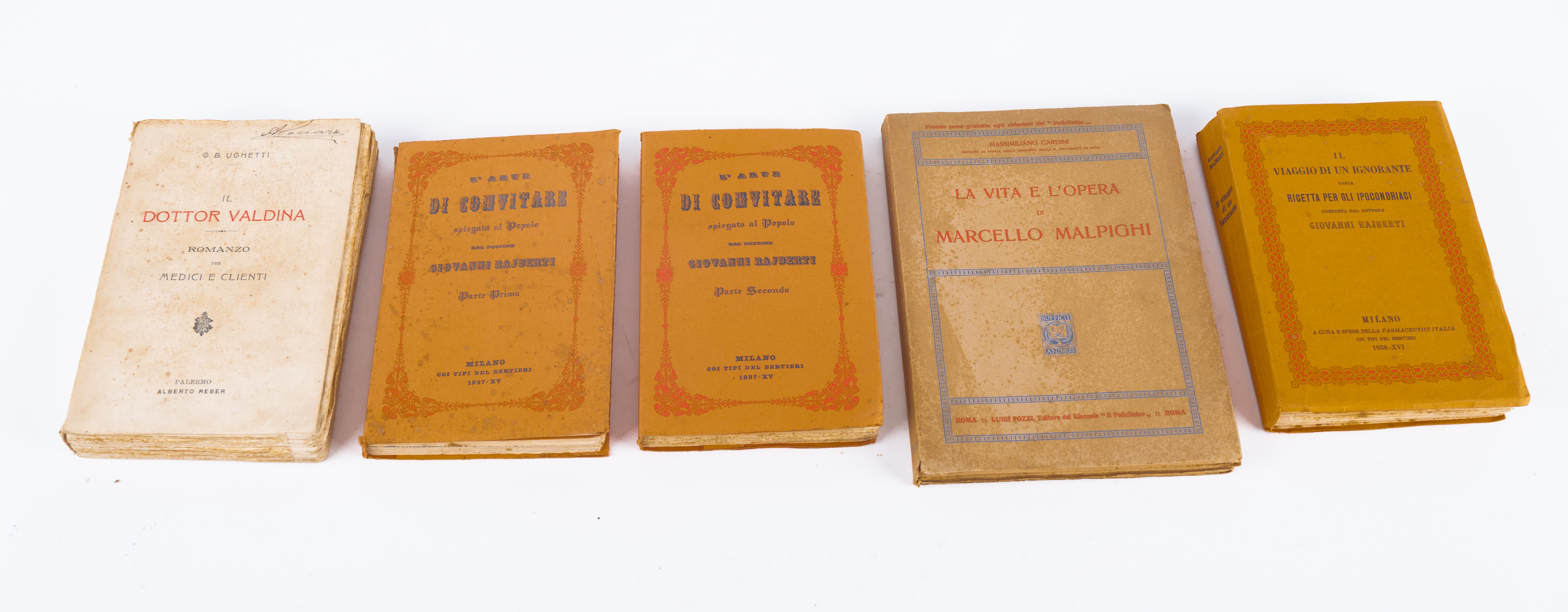 CINQUE VOLUMI DI VARIA DEI PRIMI DEL XX SECOLO: 1) G. B. Ughetti IL DOTTOR VALDINA. ROMANZO PER MEDICI E CLIENTI, ed. Palermo, Alberto Reber 1909. In 8° piccolo. Brossura editoriale con tagli marginosi. Qualche piccola e sporadica fioritura e macchiolina ma volume in più che discrete condizioni. pp. 308, (16). 2) Massimiliano Cardini LA VITA E L’OPERA DI MARCELLO MALPIGHI, ed. Roma, Luigi Pozzi 1927. In 8°. Brossura editoriale con tagli marginosi. Volume in ottime condizioni. pp. (8), 124. 3) Giovanni Rajberti L’ARTE DI CONVIVIARE, ed. Bertieri, Milano 1937 – XV. 2 volumi in 8° piccolo. Brossura editoriale con ali e tagli marginosi. Qualche sporcizia da esposizione ai piatti ma pagine pulite e ben tenute. Pp. 165, (6); 191, (4). 4) Giovanni Rajberti IL VIAGGIO DI UN IGNORANTE OSSIA RICETTA PER GLI IPOCONDRIACI, ed. Milano, a cura e spese della Farmaceutici Italia coi tipi del Bertieri 1938 – XVI. Brossura editoriale con ali e tagli marginosi. Qualche piccola sporcizia da esposizione ai piatti ma pagine pulite e ben tenute. Pp. 256, (6).