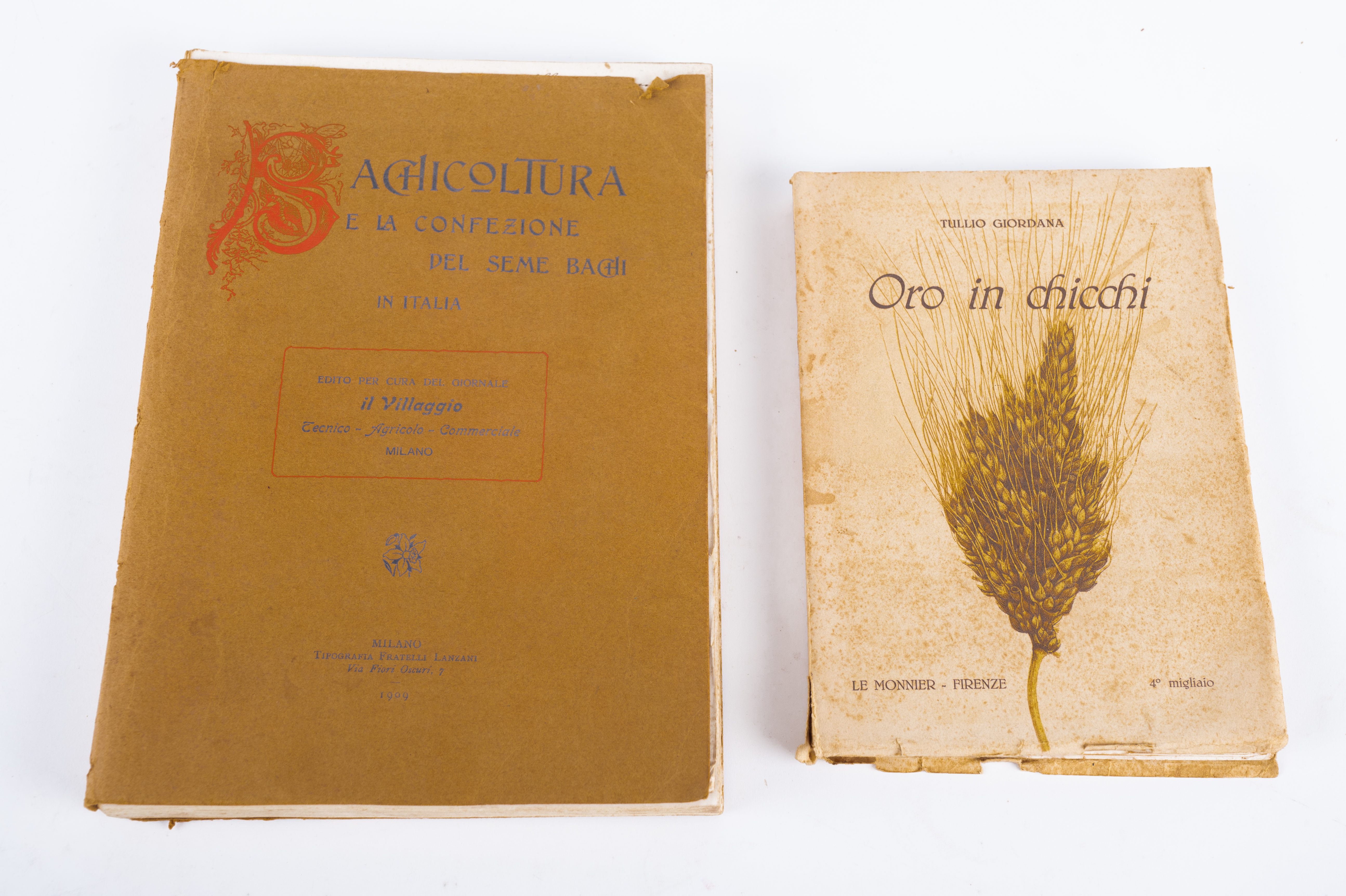 DUE VOLUMI DI AGRICOLTURA DEI PRIMI DEL ‘900: 1) BACHICOLTURA E LA CONFEZIONE DEL SEME BACHI DI IN ITALIA, EDITO PER CURA DEL GIORNALE IL VILLAGGIO, Milano, Lanzani 1909. In 8° grande. Brossura editoriale figurata. Con illustrazioni fotografiche in b/n nel testo. In più che discrete condizioni. Pp. 326 con Indice. 2) Tullio Giordana ORO IN CHICCHI, ed. Le Monnier, Firenze 1929. In 8°. Brossura editoriale con tagli marginosi. Volume in ottime condizioni. pp. 201.