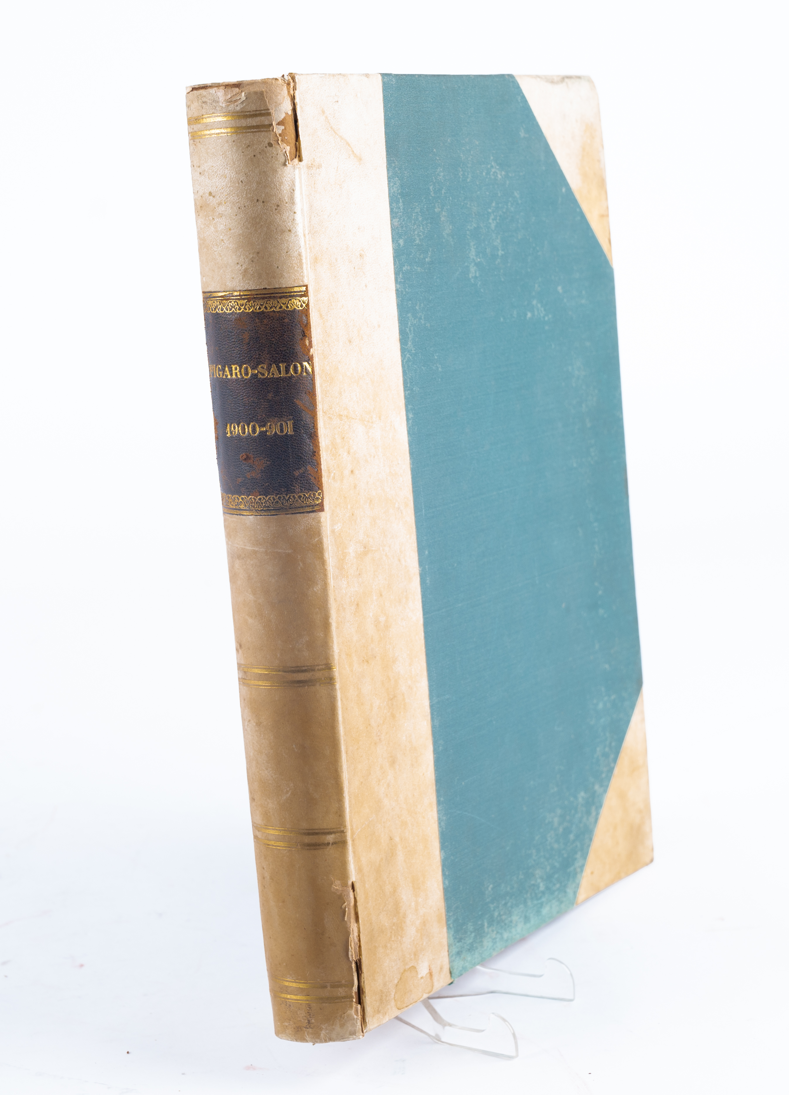 Frederic Masson FIGARO SALON LES BEAUX ARTS EN 1900, ed. Paris, Goupil et cie1900 – 1901. 2 tomi in 1 volume. In folio (36 x 27 cm). Legatura coeva in mezza pergamena rigida con angoli e piatti in percallina verde, con titoli e fregi impressi in oro al tassello al dorso. Brossure originali all’interno. Volume in ottimo stato di conservazione. Stampato su carta patinata. Pp. 72; 72 con numerose riproduzioni in bianco e nero e indici delle incisioni.
