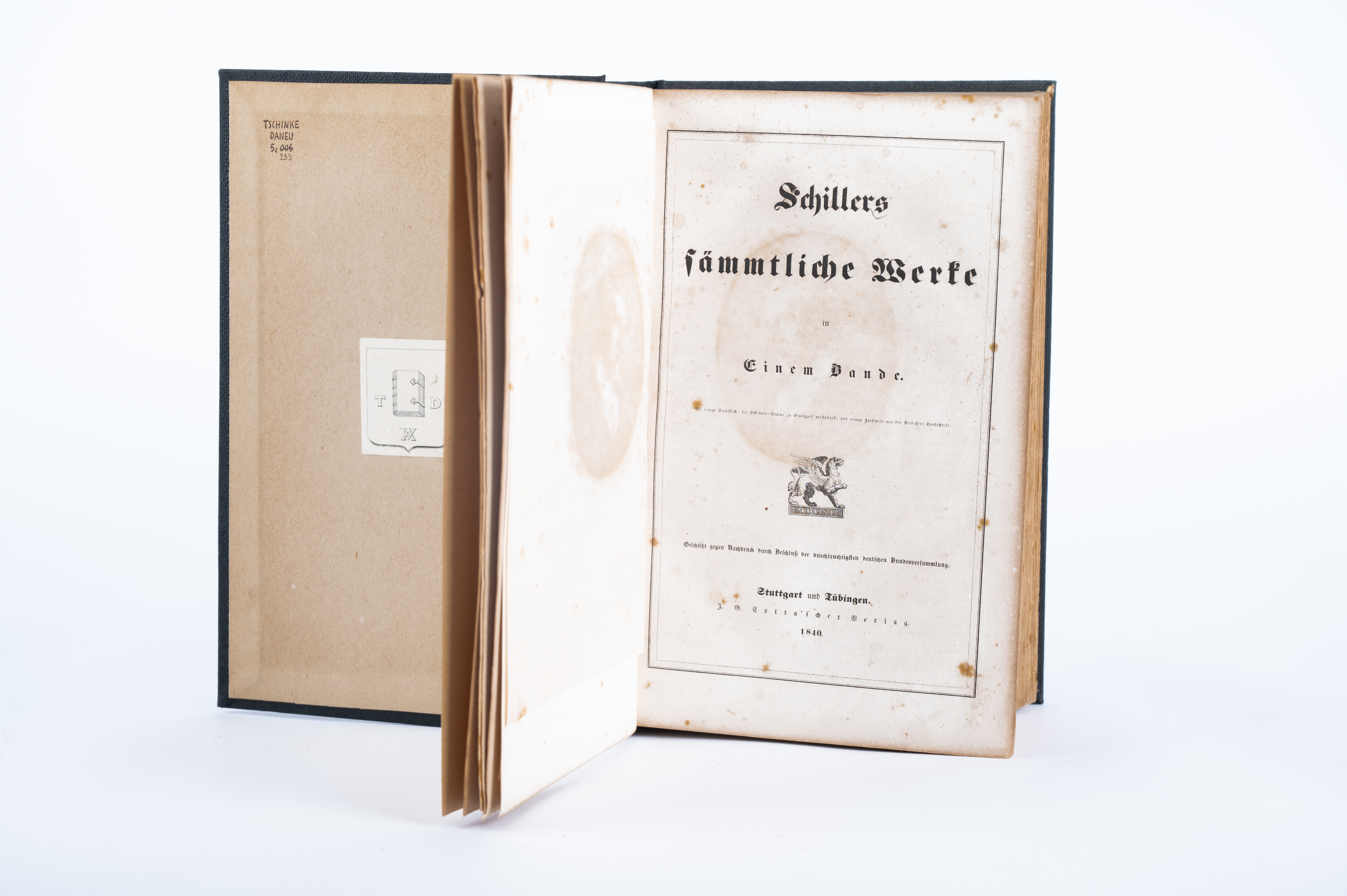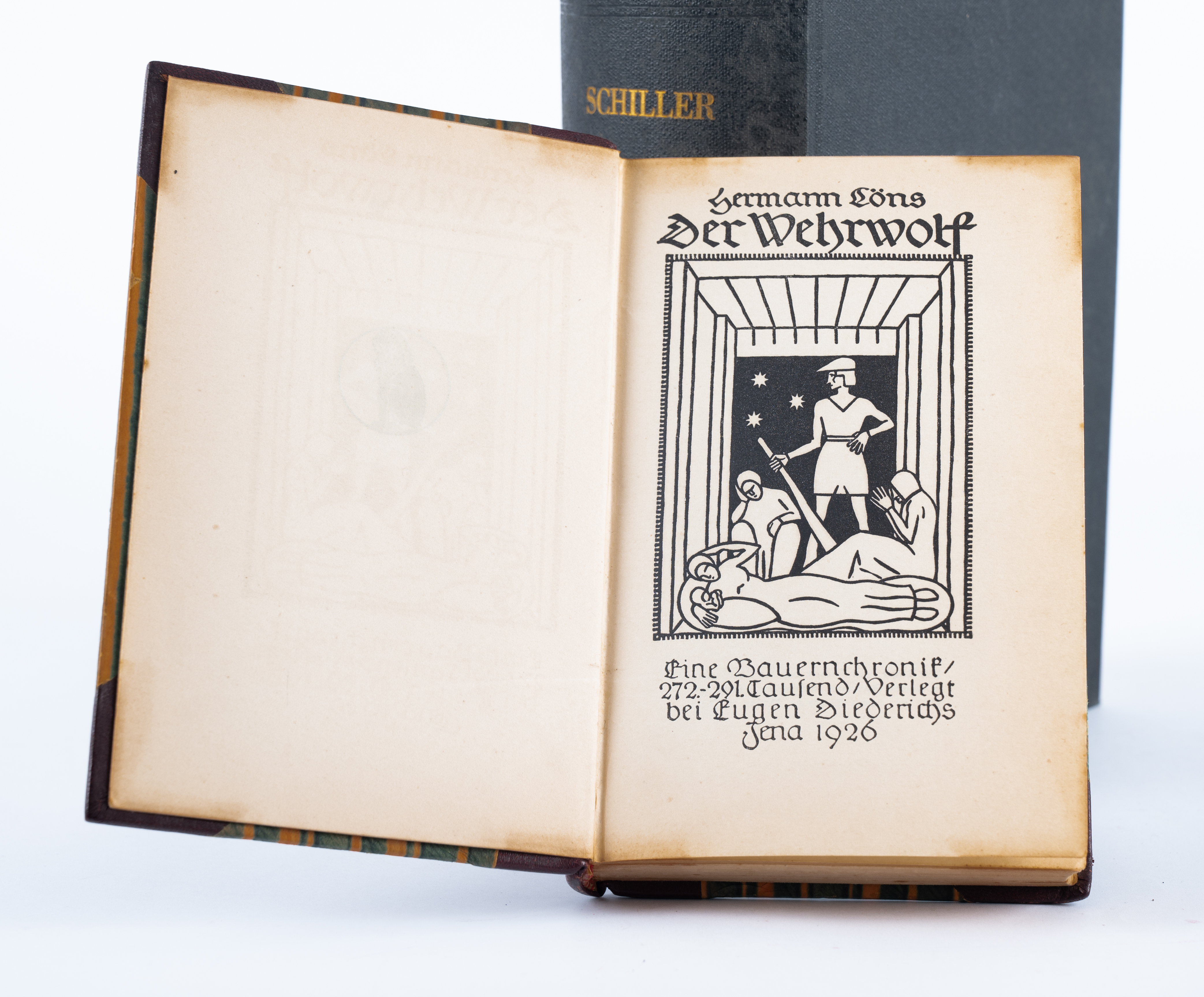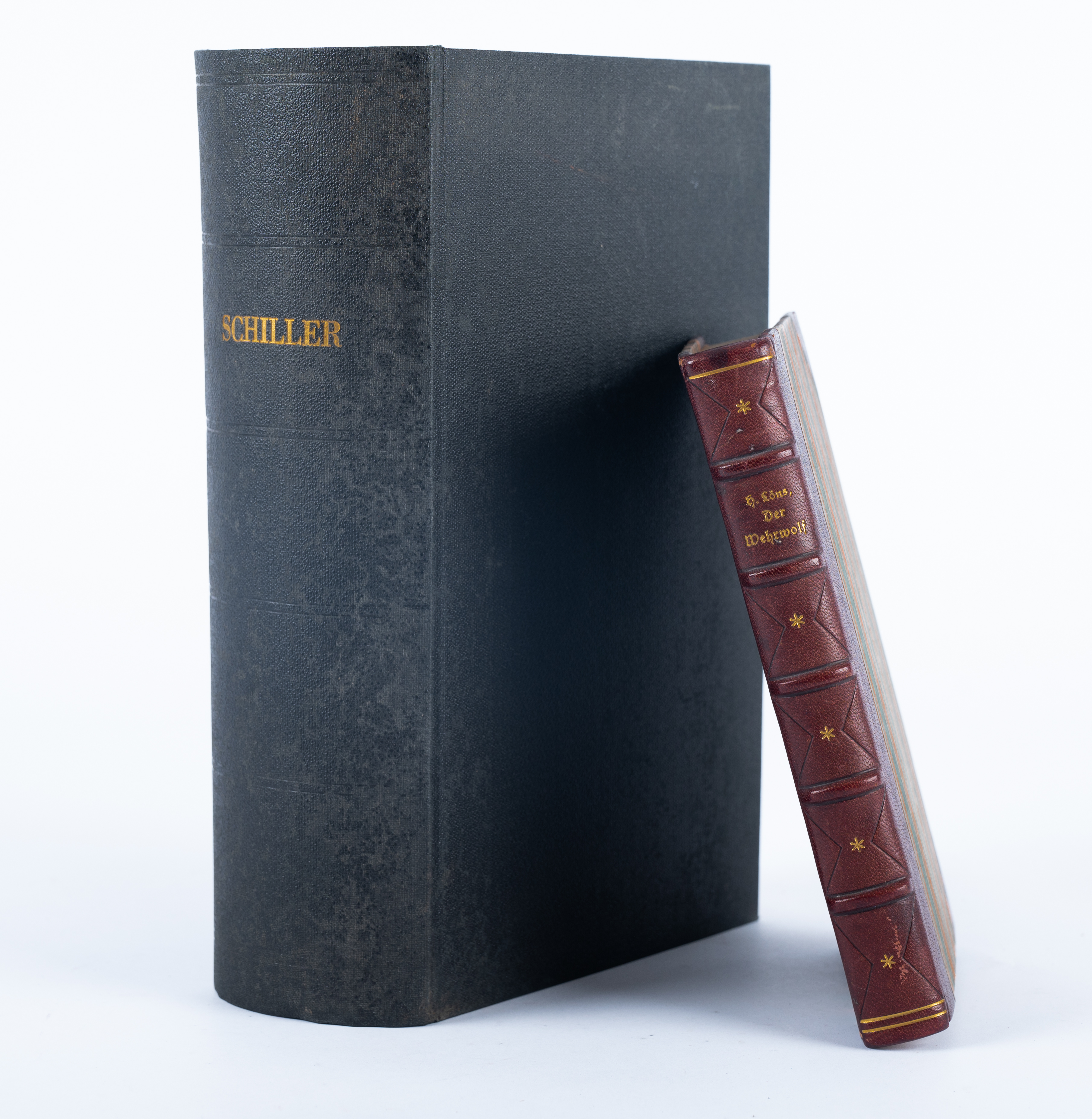 DUE VOLUMI IN LINGUA TEDESCA DEL XIX e XX SECOLO: 1) SCHILLERS SÄMMTLICHE WERKE IN EINEM BANDE, ed. Stuttgart und Tubingen, Cotta 1840. In 4°. 2 fogli di frontespizio con numerose incisioni su acciaio. Rilegatura dell'epoca, in piena percallina nera e titoli impresso in oro al dorso. Ex libris dell’antiquario Daneu. In perfette condizioni. Con incisioni su acciaio di Wilhelm Kaulbach e un facsimile del manoscritto dell'autore fuori testo. Naturali bruniture del tempo. Pp. VIII, 1260 pagine. Ex libris Tschinke Daneu al contropiatto. 2) DER WEHRWOLF. EINE BAUERNCHRONIK, ed. Jena 1926. In 8° piccolo. Bella legatura coeva in mezza pelle con angoli e piatti marmorizzati, nervature e titoli impressi in oro al dorso. In eccellenti condizioni. pp. 243, (7). La storia racconta di un contadino che durante la Guerra dei Trent'anni si ribella all'oppressione esercitata da diverse potenze. Il contadino si chiama Wulf, da cui il titolo. Non si tratta quindi di un lupo mannaro, ma proprio di un Wulf che si ribella = Wehrwolf (lupo mannaro), scrittura in tedesco antico. Ex libris m. s. al foglio di guardia.