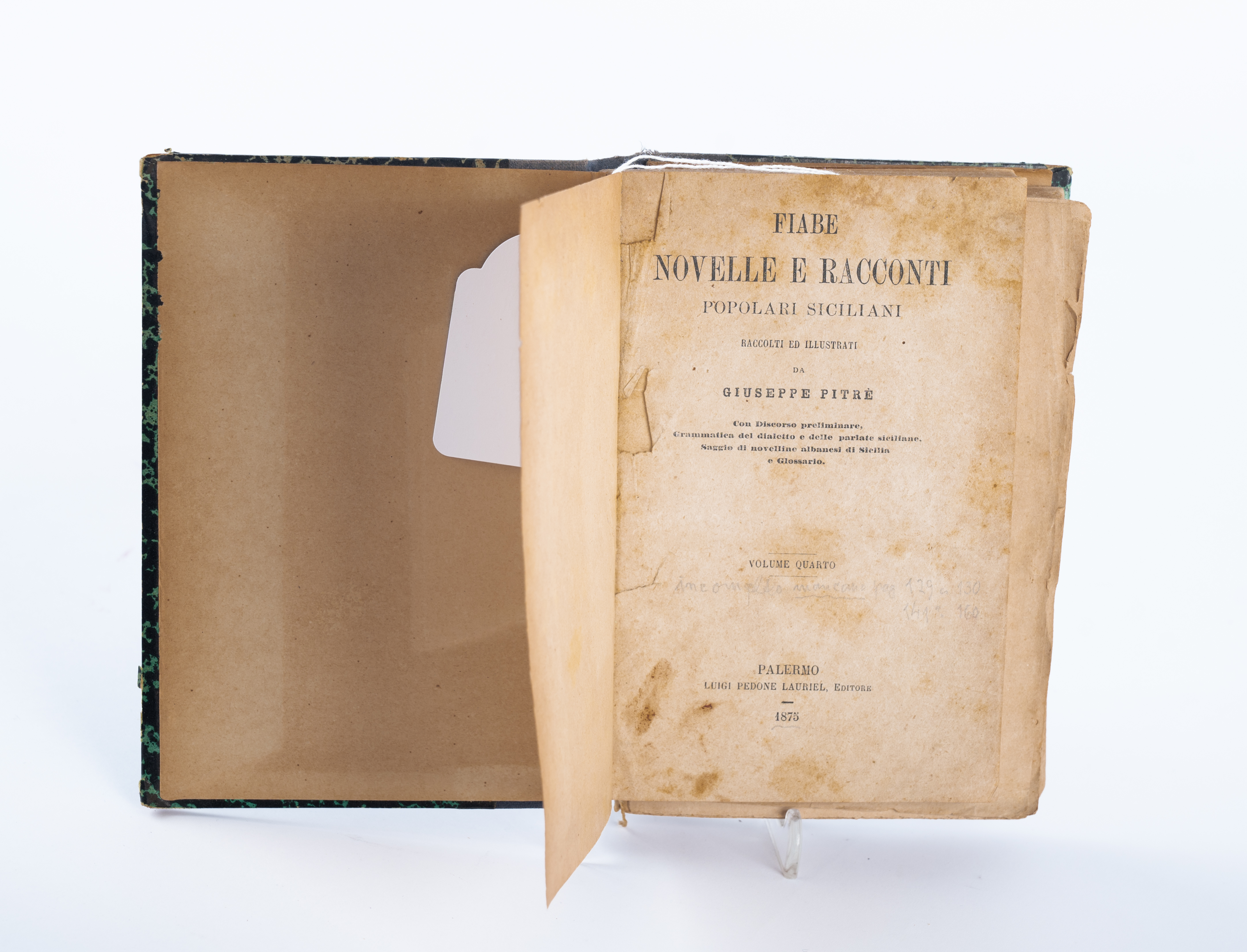 Giuseppe Pitrè FIABE NOVELLE E RACCONTI, ed. Palermo, Luigi Pedone Lauriel 1875. In 8°. Solo il volume IV di 4 volumi complessivi dell’opera. Legatura coeva in mezza tela con piatti marmorizzati. piatto anteriore e dorso parzialmente slegati. Volume in buone condizioni. Pp. 428.