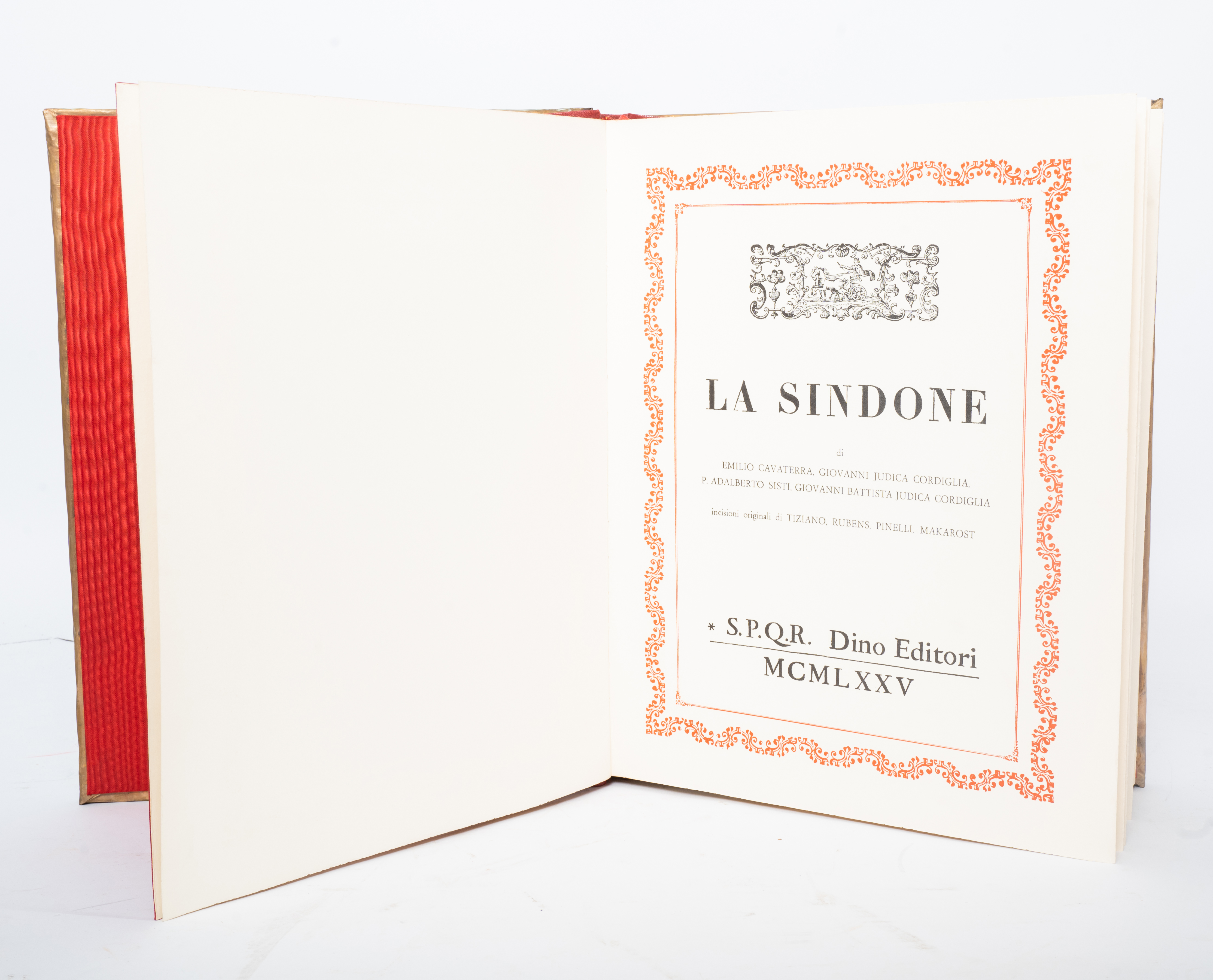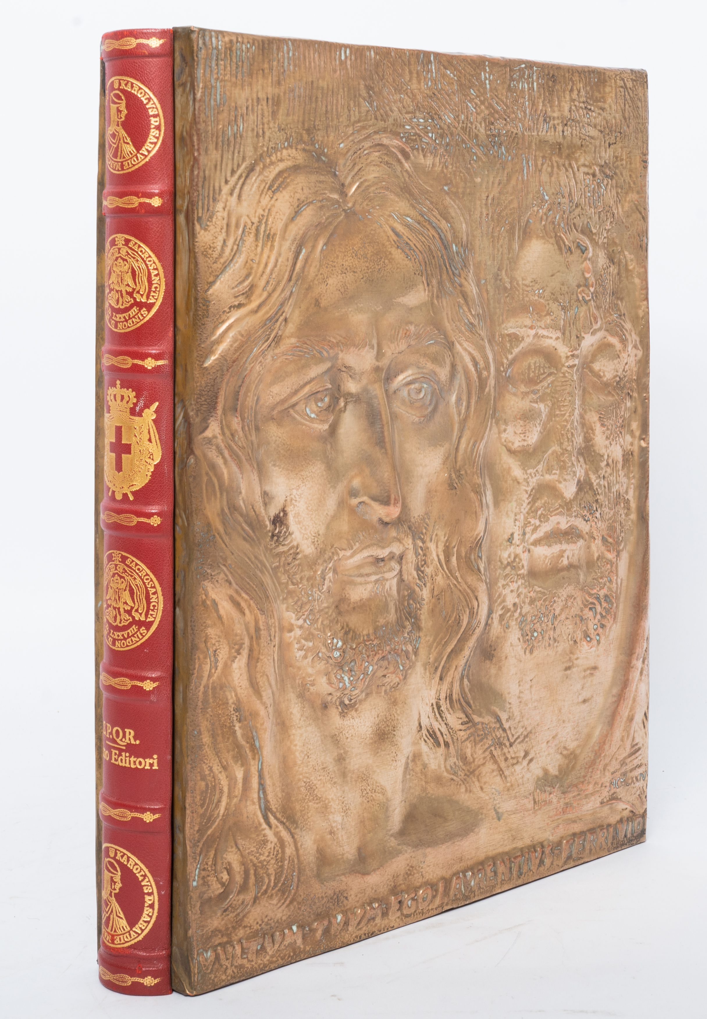AA. VV. LA SINDONE, Dino Editori 1975. Formato in folio. Riproduzioni fotografiche di incisioni di Tiziano, Rubens, Panelli e Makarost, e della Sindone. Edizione Gran Lusso Serie Oro, ad personam, con firma dell'editore. Legatura editoriale in pelle rossa con titoli in oro al dorso. Tavole in metallo sbalzato e dorato raffiguranti Cristo e la Sindone al piatto anteriore e l'uomo vitruviano al piatto posteriore. Guardie in seta rossa. Copia n. 60. In perfette condizioni.
