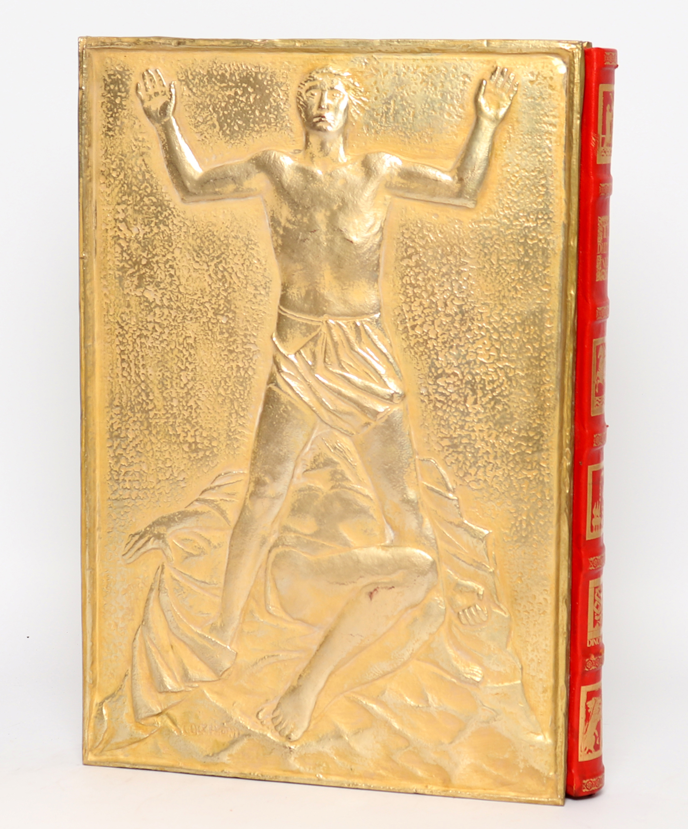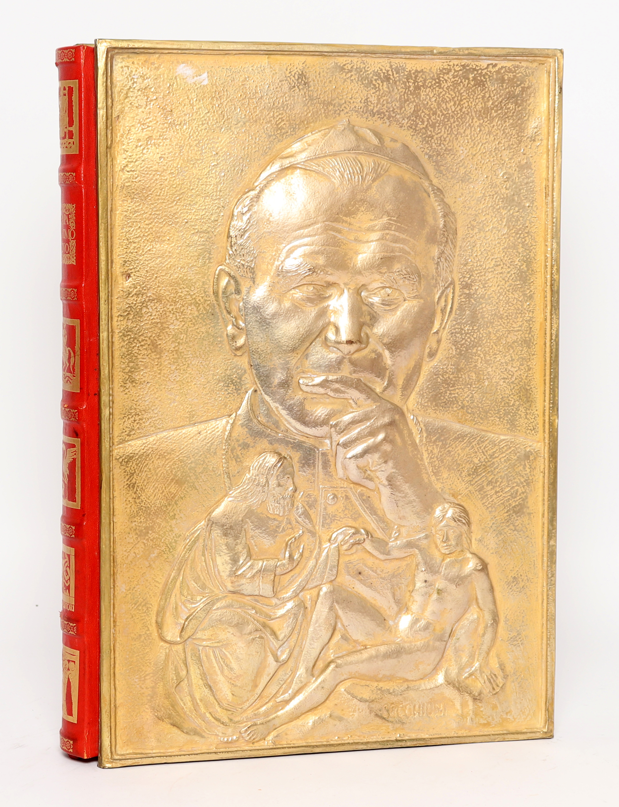 IL PAPA DELL’UOMO NUOVO, Dino Editori 1982. Il Papa dell'Uomo Nuovo, Giovanni Paolo II. Testo integrale dell'enciclica “Redemptor hominis” di Papa Giovanni Paolo II. Legatura in piena pelle con titoli in oro al dorso e tavole lavorate a sbalzo applicate ai piatti. Decorazioni di Giorgio Scalco e bassorilievi di A. Cocchioni. Edizione gran lusso ad personam, con firma dell’editore. In tiratura di 299 esemplari. Il nostro è il n. 2. Dimensione: cm 51 x 35. In perfette condizioni.