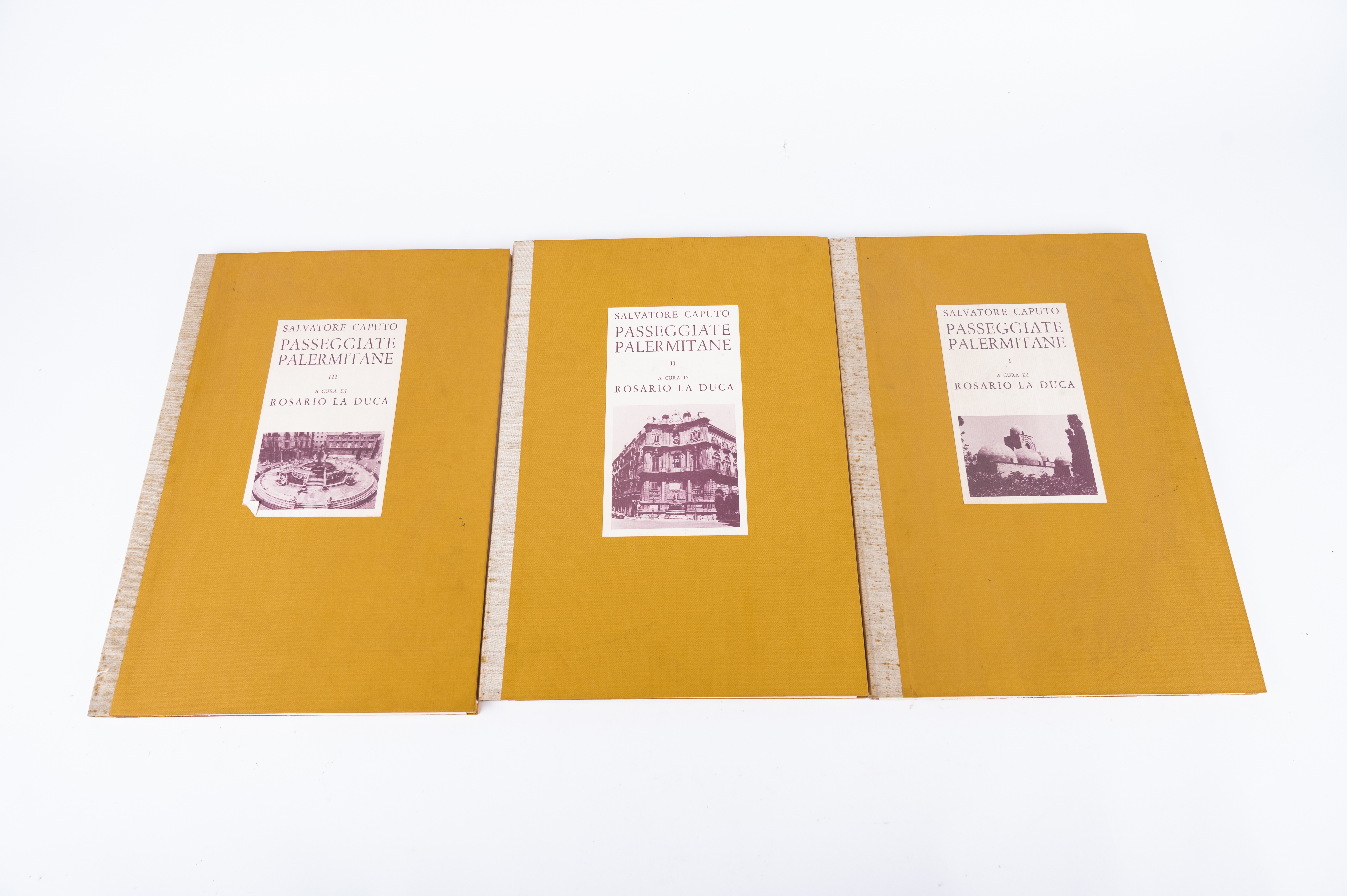TRE VOLUMI D’ARTE: Salvatore Caputo PASSEGGIATE PALERMITANE, ed. Linee d’Arte Giada 1983. In formato Atlantico. A cura di Rosario La Duca. Tre cartelle editoriali con fotoapplicazione al piatto contenenti testo e immagini sciolte. Con 6 serigrafie di Salvatore Caputo per ogni volume per un totale di 18 serigrafie firmate in originale dall’autore. Tiratura di 200 copie.