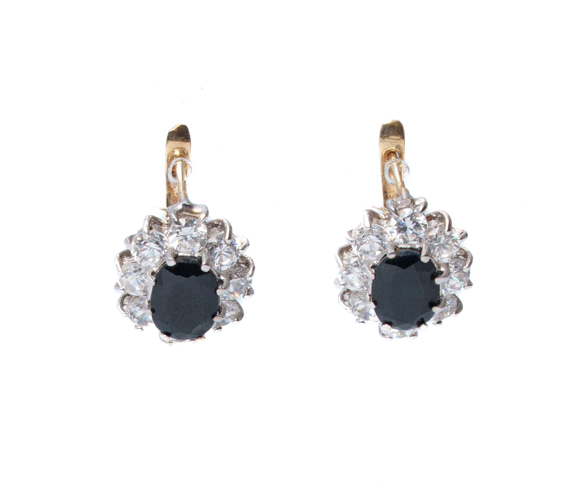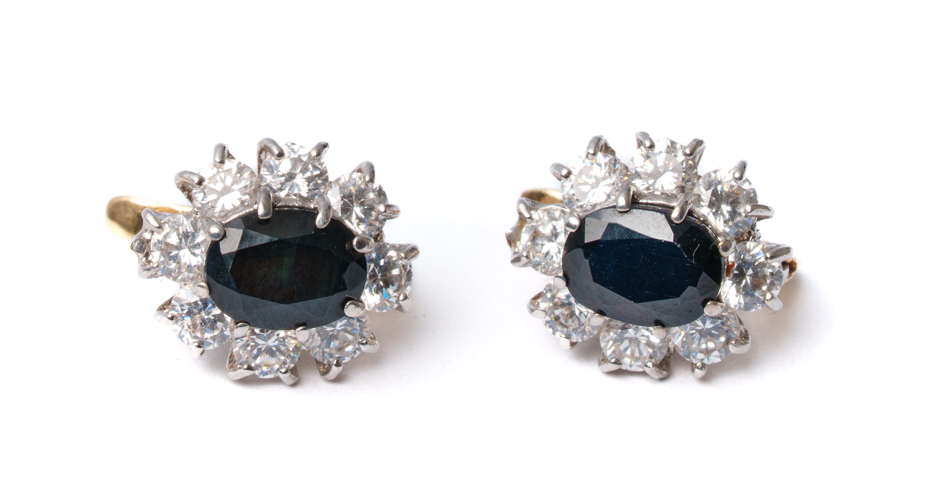 ORECCHINI in oro bianco e giallo 18 KT con zirconi e zaffiri ovali ct. 1,80 peso di stima (g. 6,40).