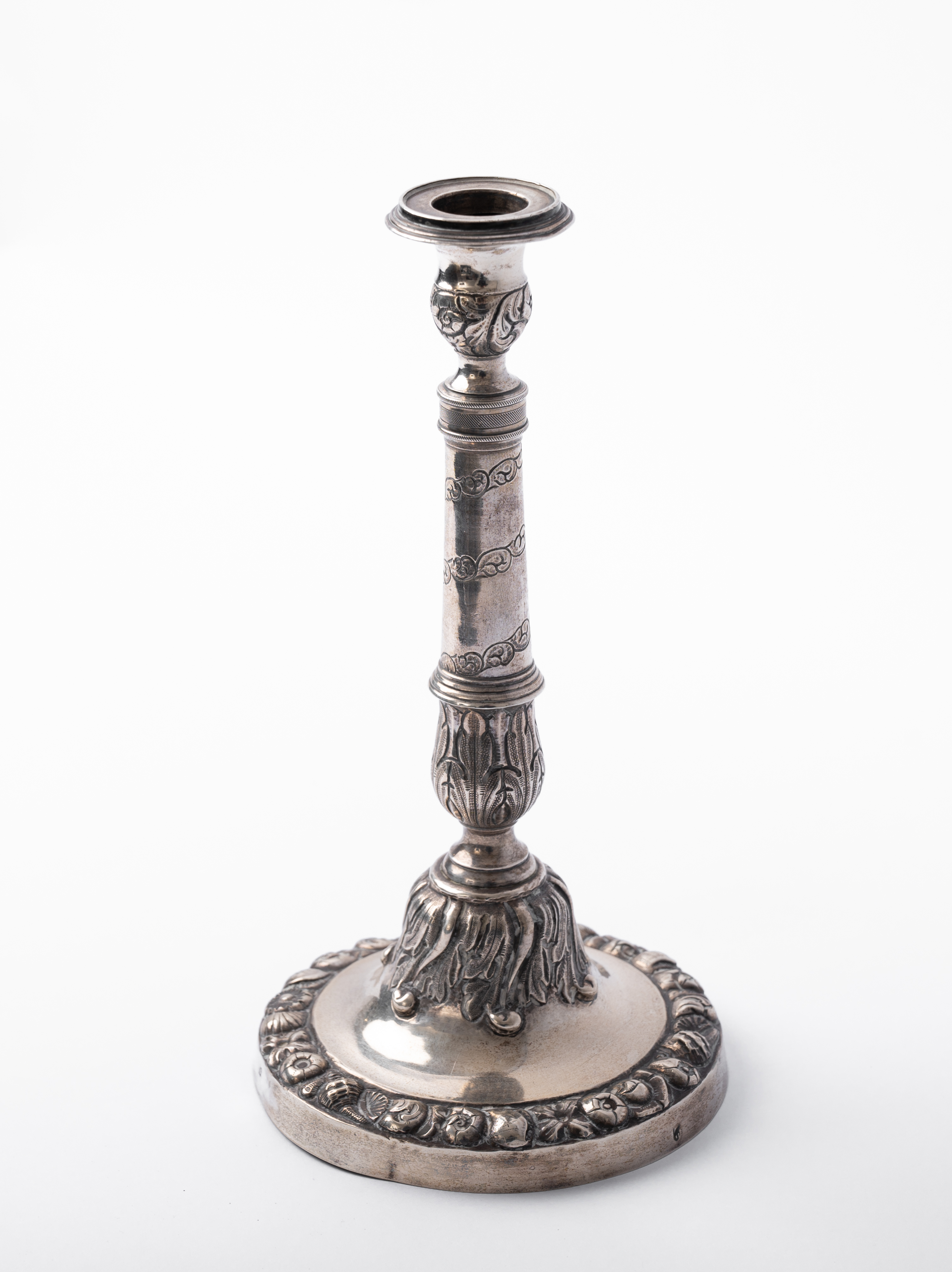 Candeliere in argento sbalzato a motivo naturalistico (g. 273).