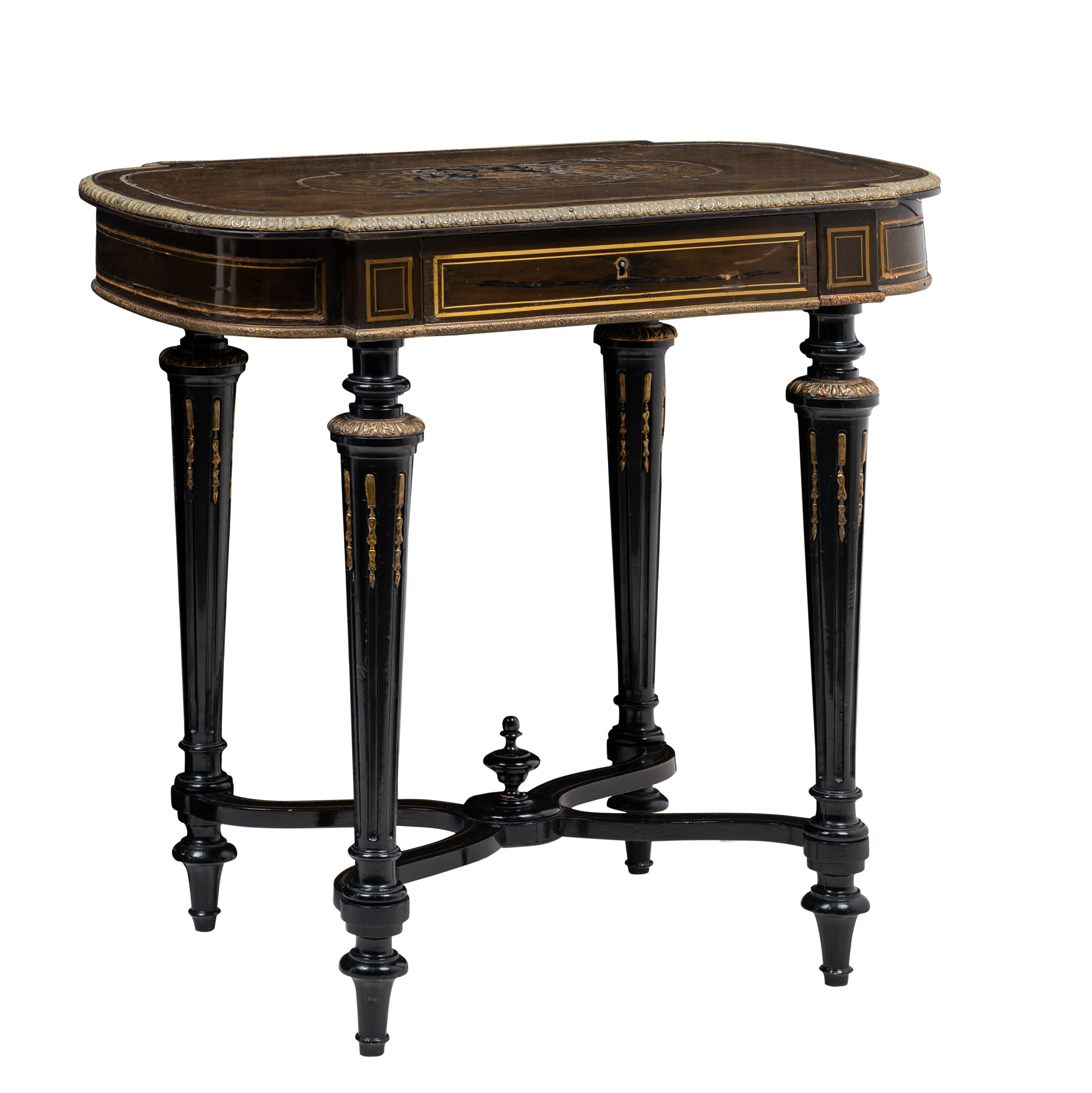 Tavolino Napoleone III in legno ebanizzato con cassetto, tarsie in rame, guarnito da bronzi.