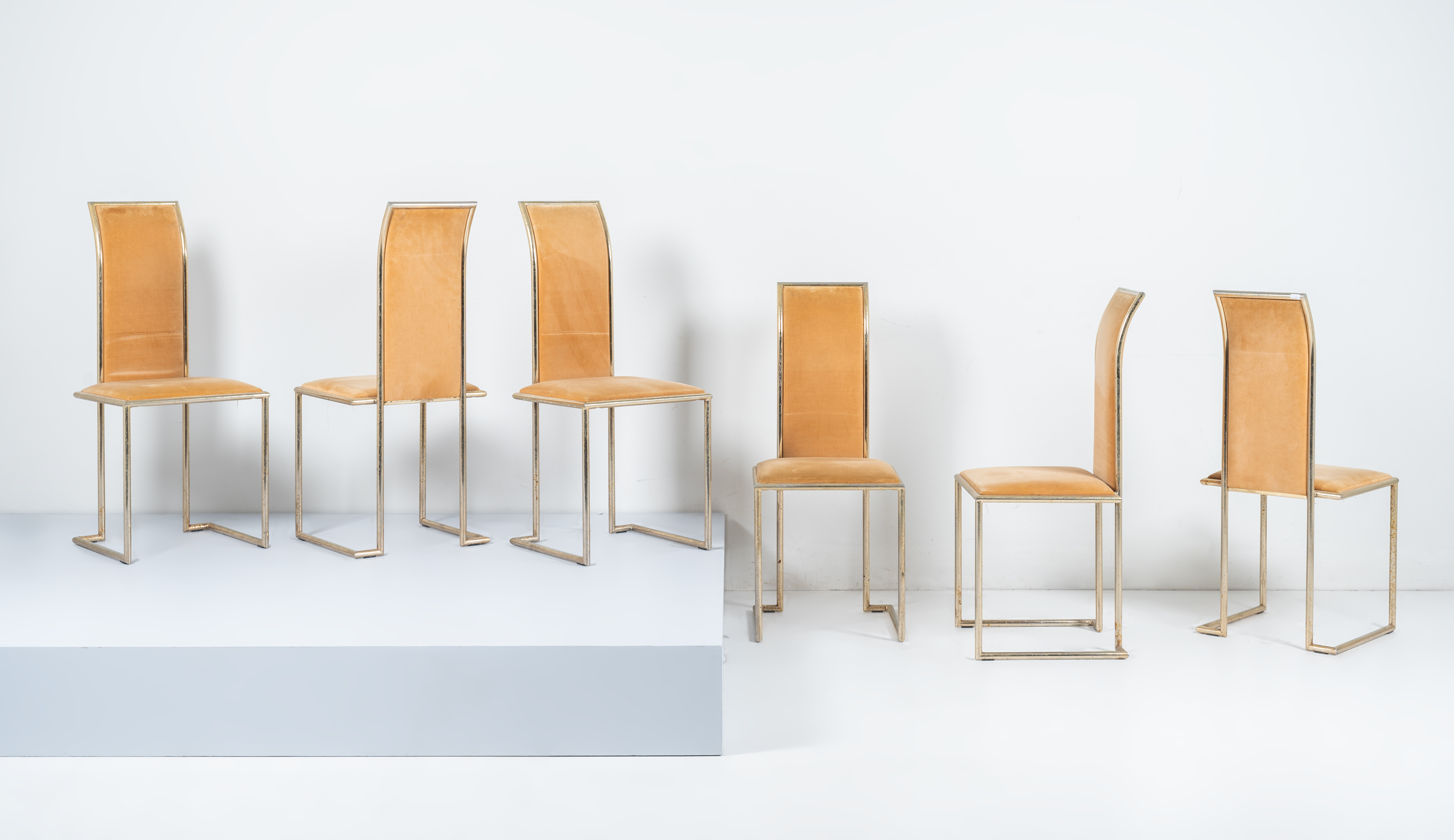 Sei sedie con struttura in ottone, spalliera e seduta con imbottitura e rivestimento in velluto beige. Segni di uso.