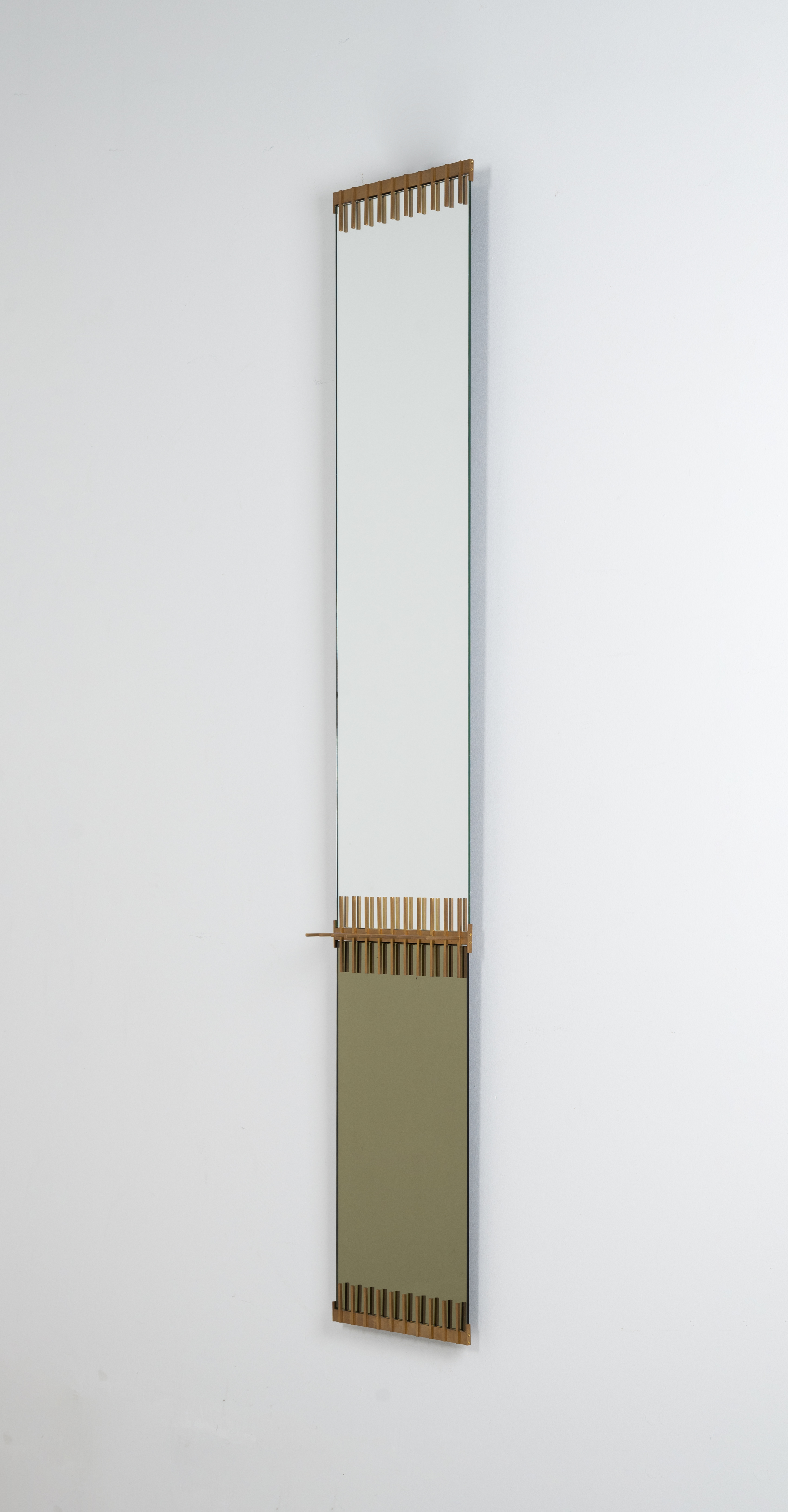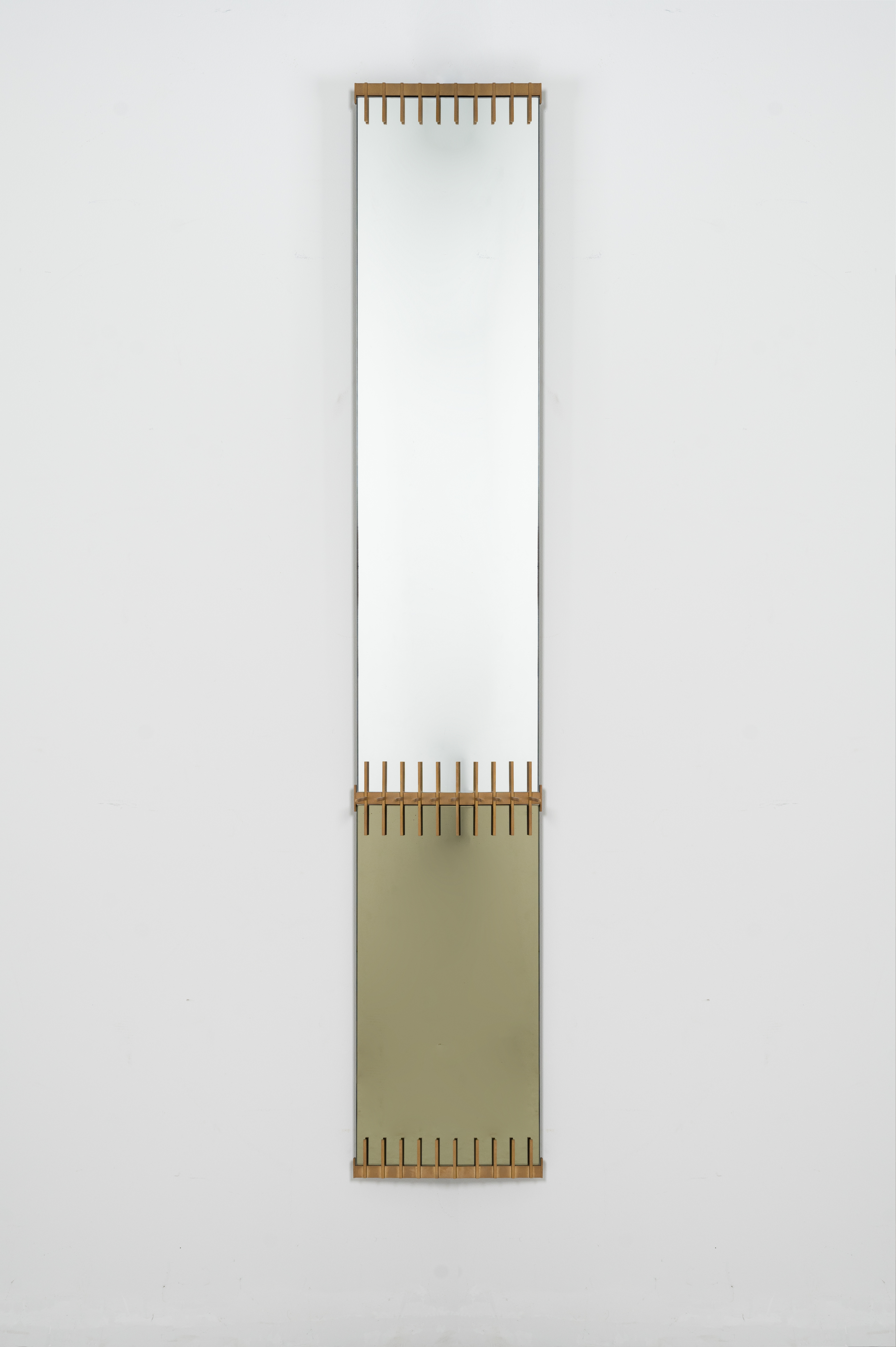 Specchio da parete con struttura in ottone, formato da un elemento di cristallo specchiato fumé ed uno di cristallo specchiato. Etichetta di produzione.