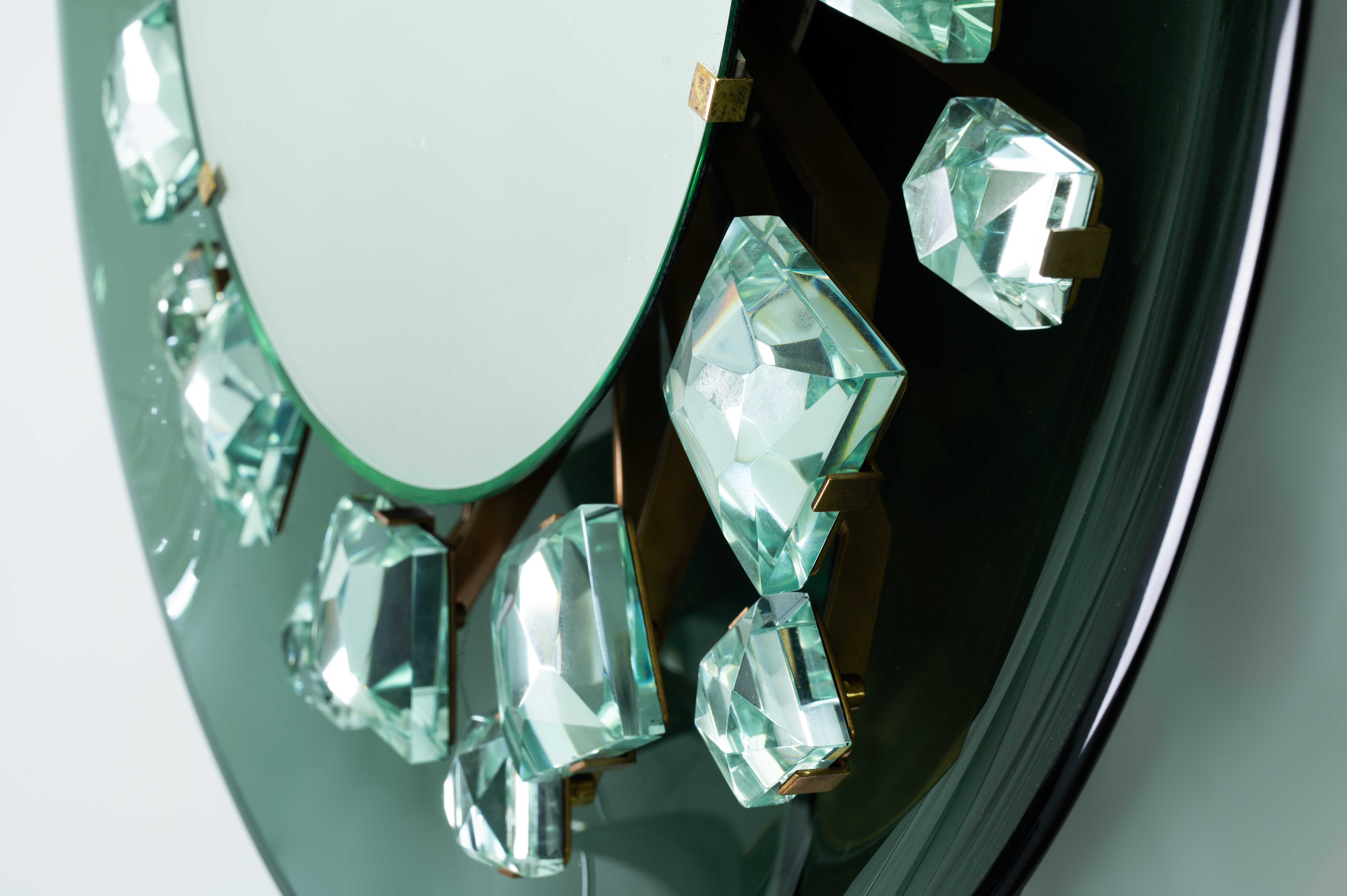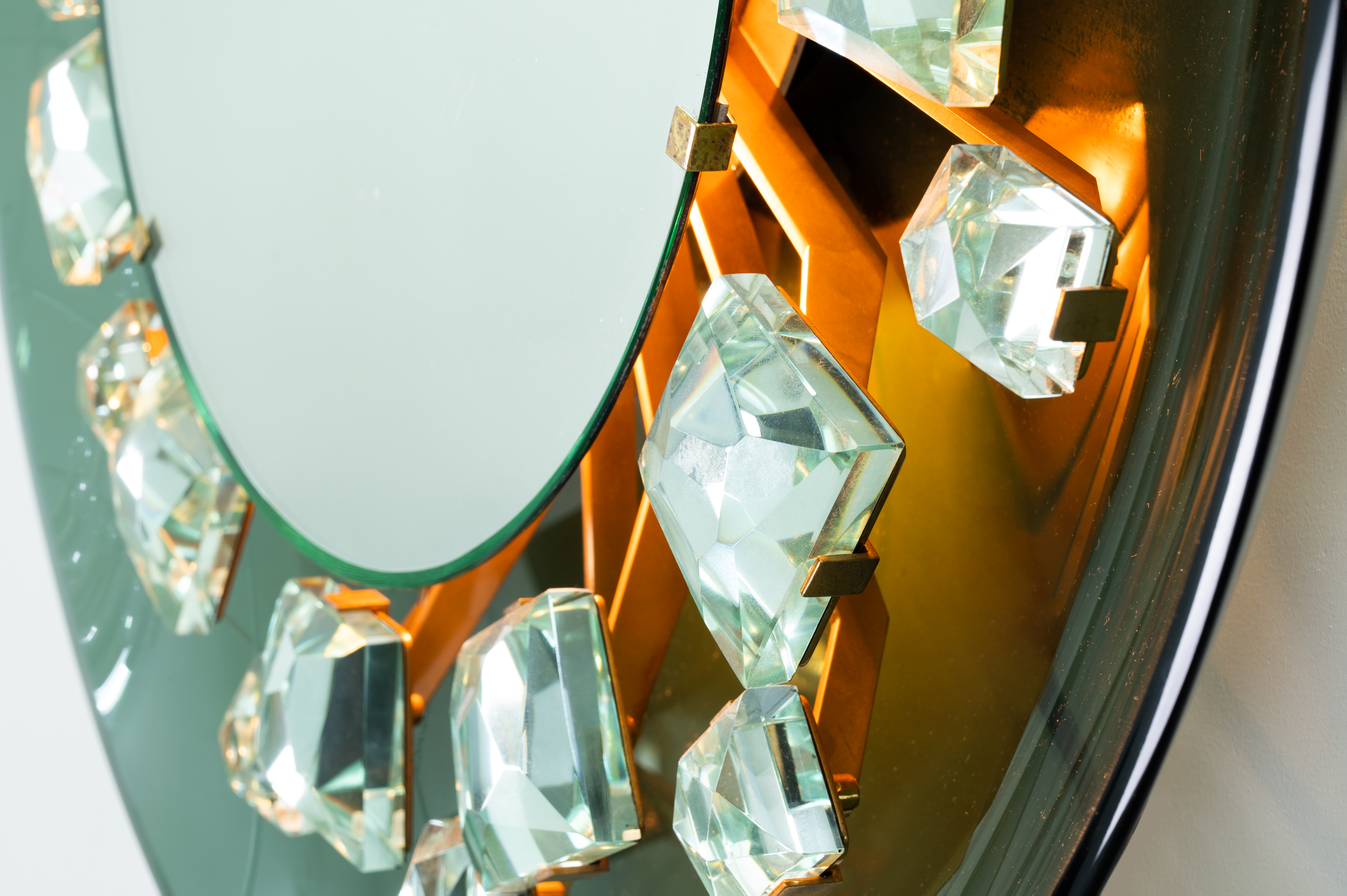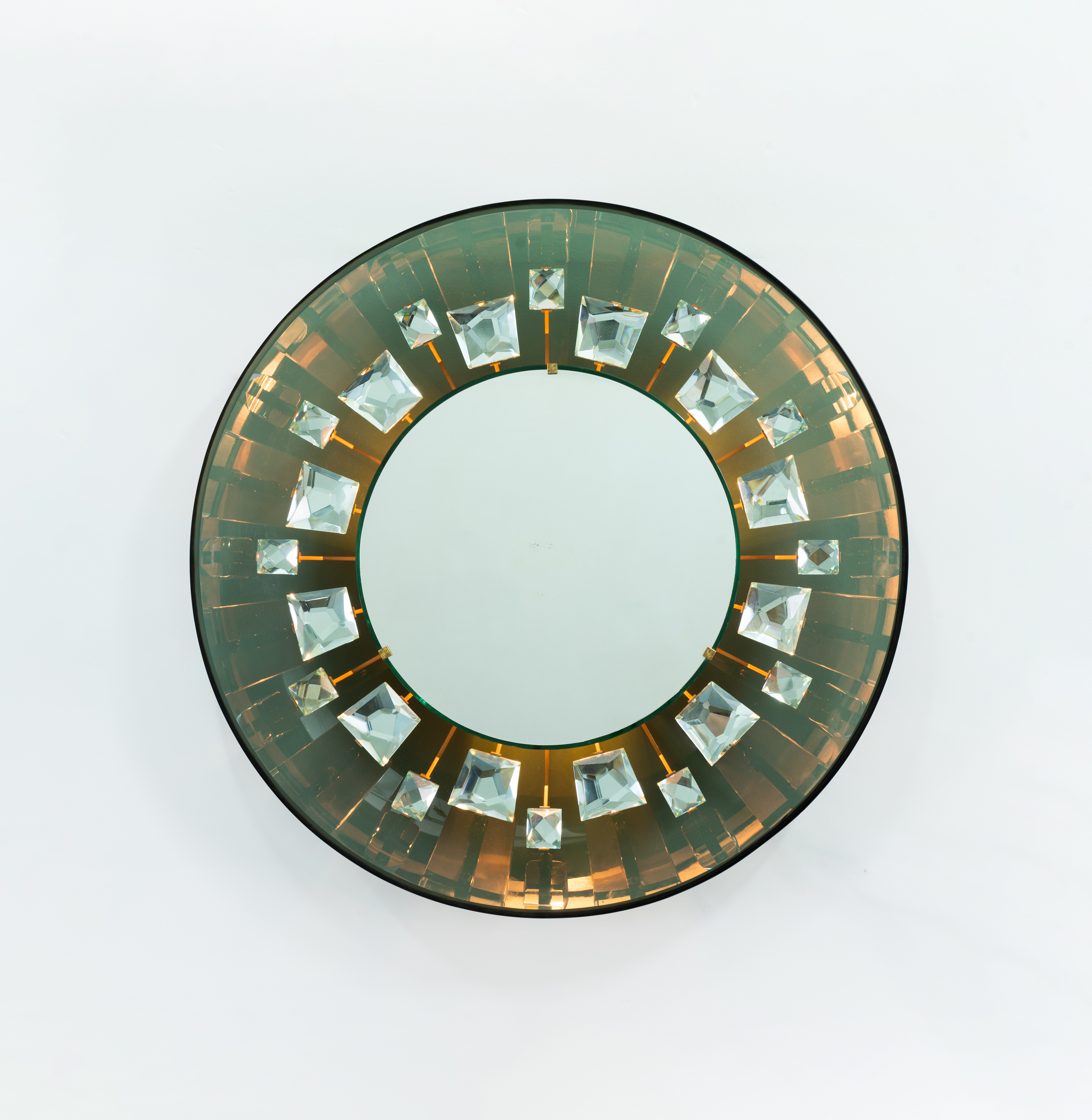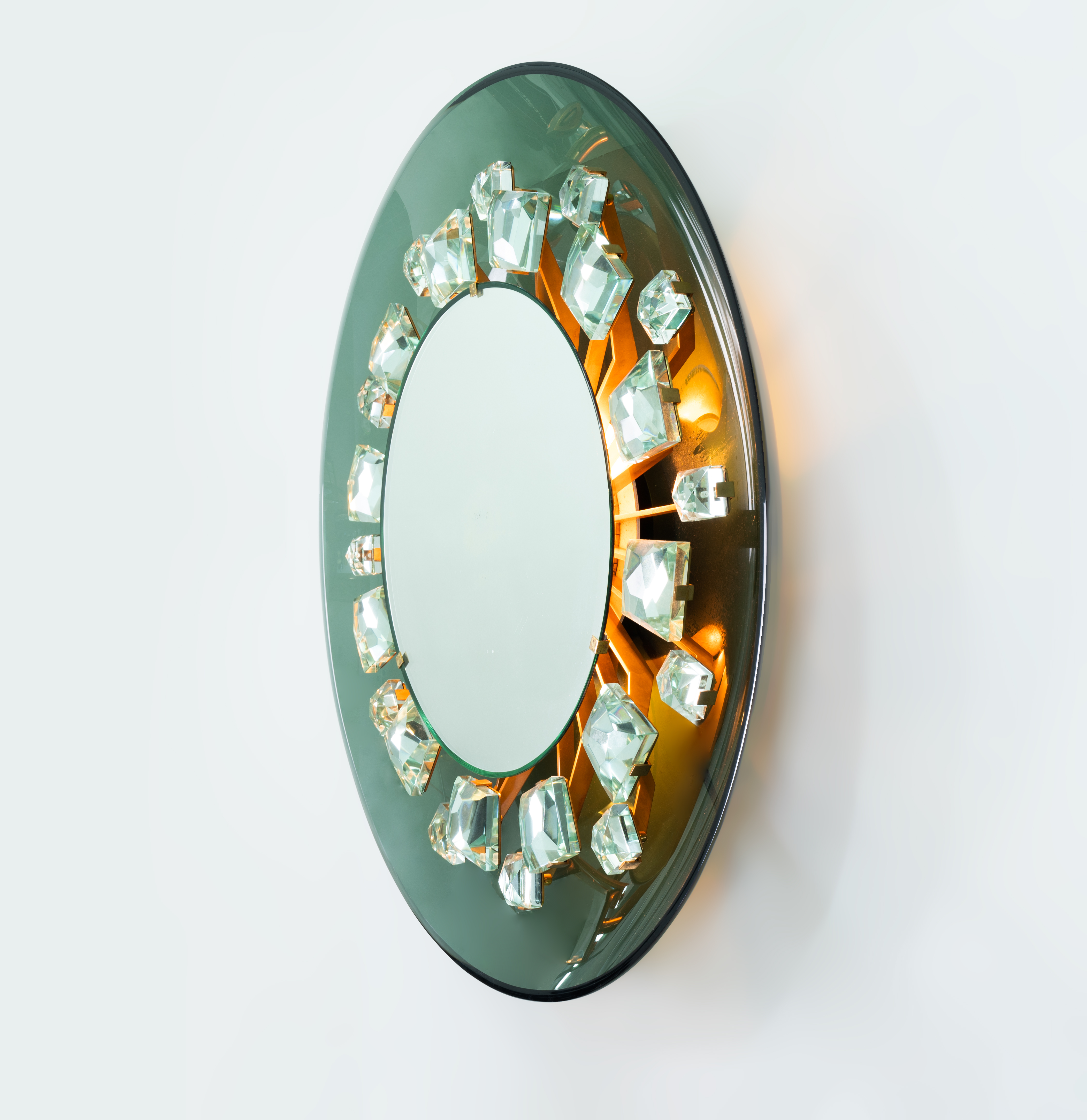 Specchio da parete retroilluminato circolare modello “2044” in cristallo curvato fumè, ottone, ottone verniciato, cristallo a gemme e cristallo specchiato.