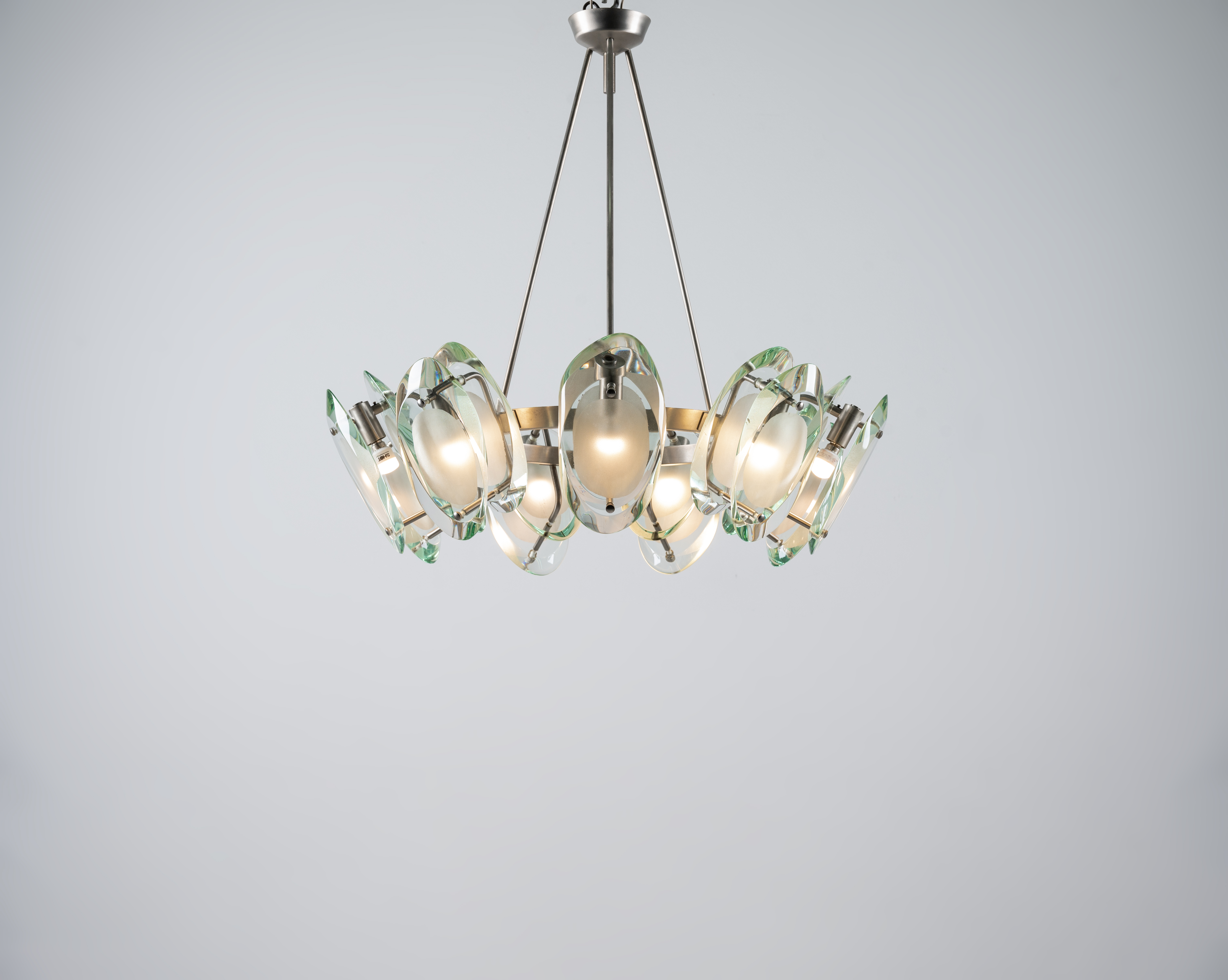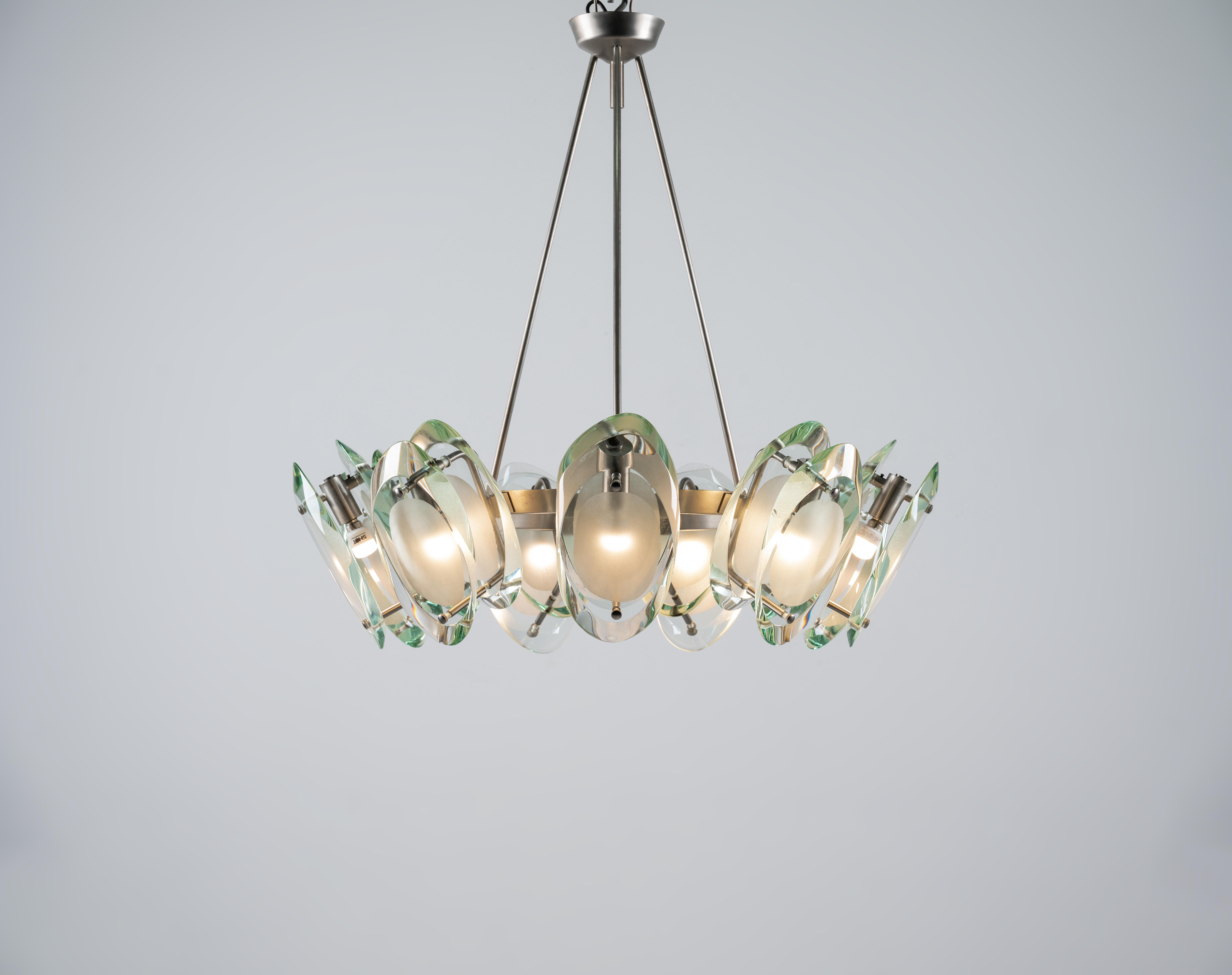Lampada a sospensione a nove luci modello “2088”, struttura in ottone nichelato, diffusori composti ciascuno da due cristalli sagomati, molati e parzialmente sabbiati.