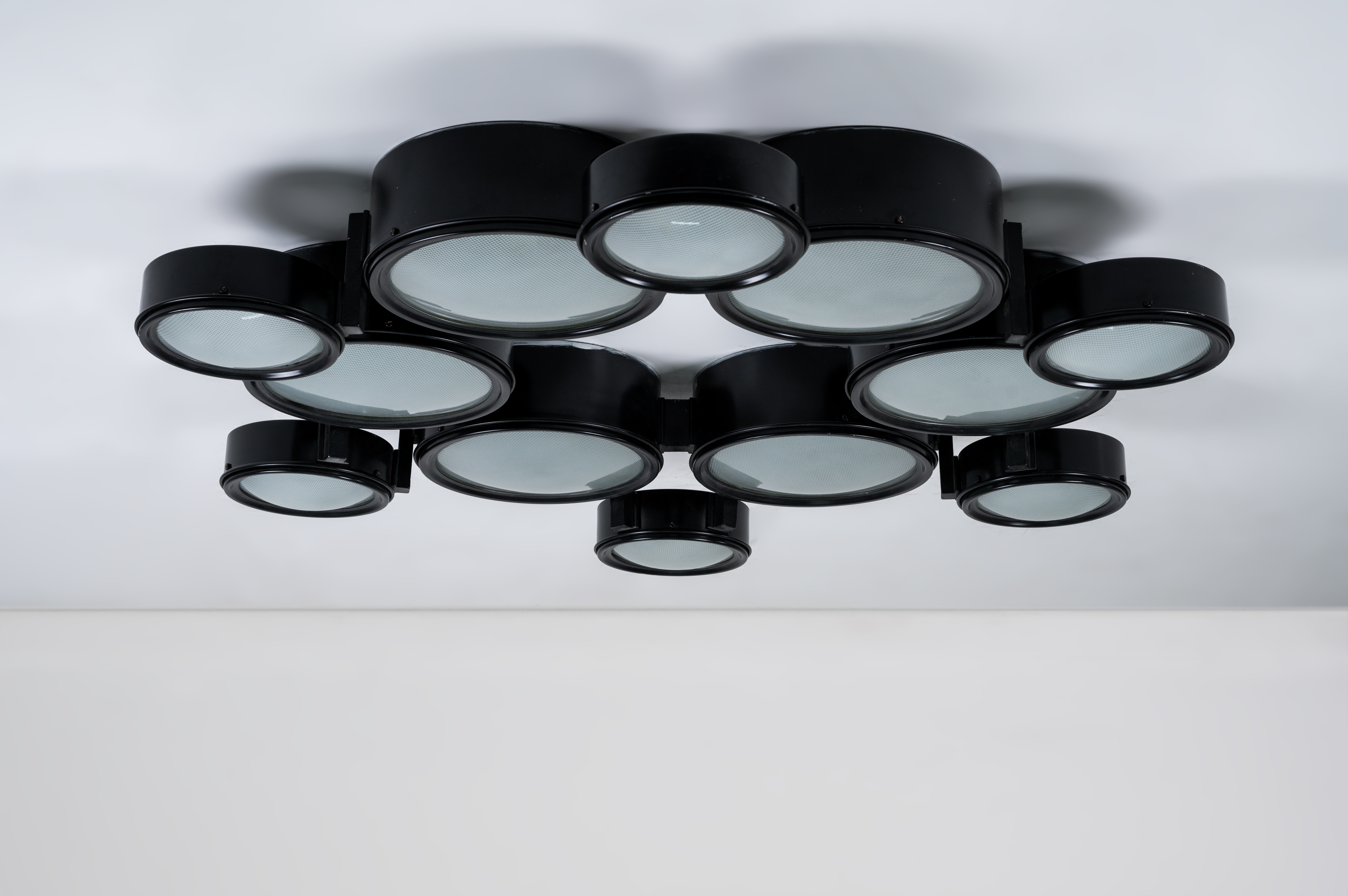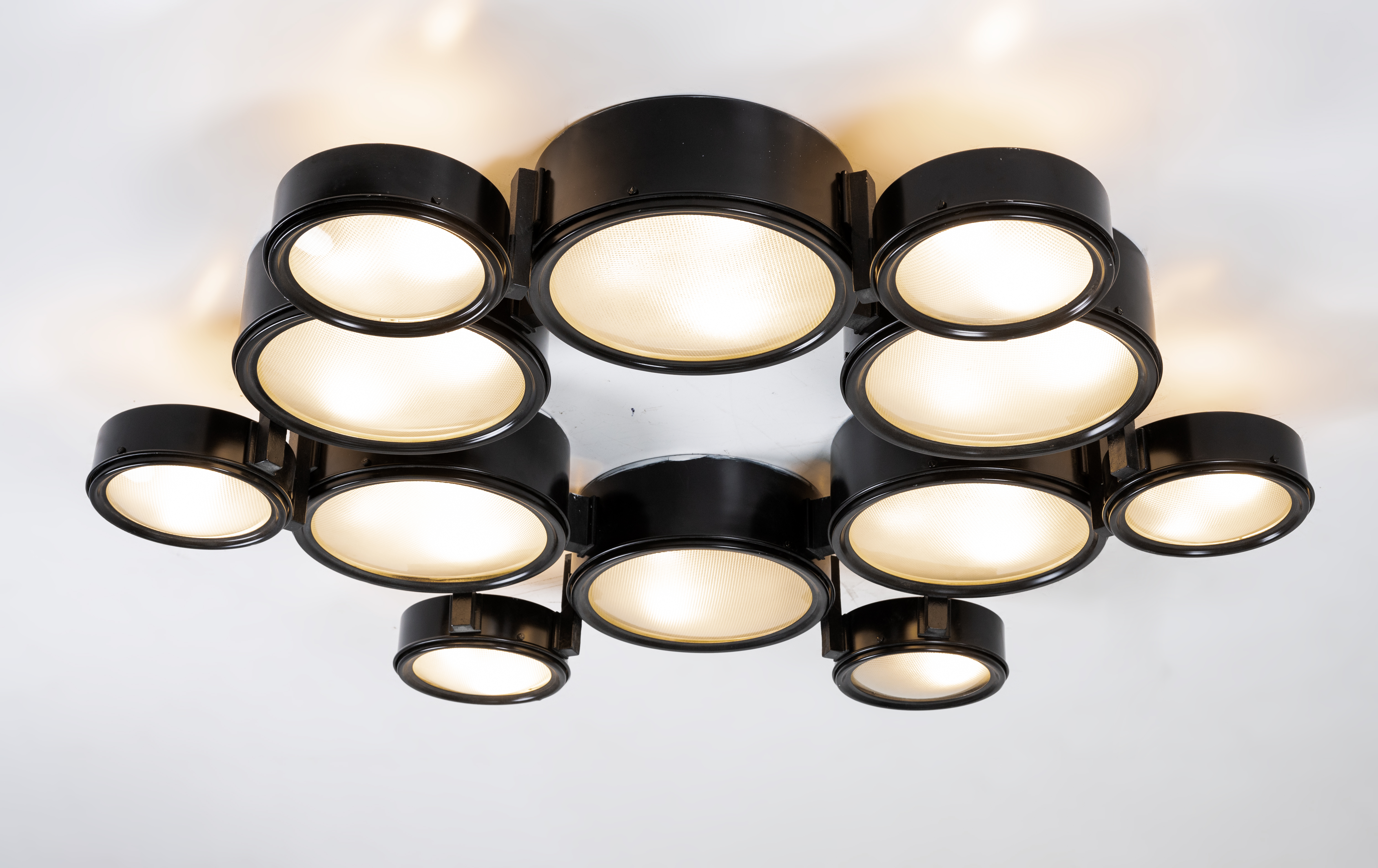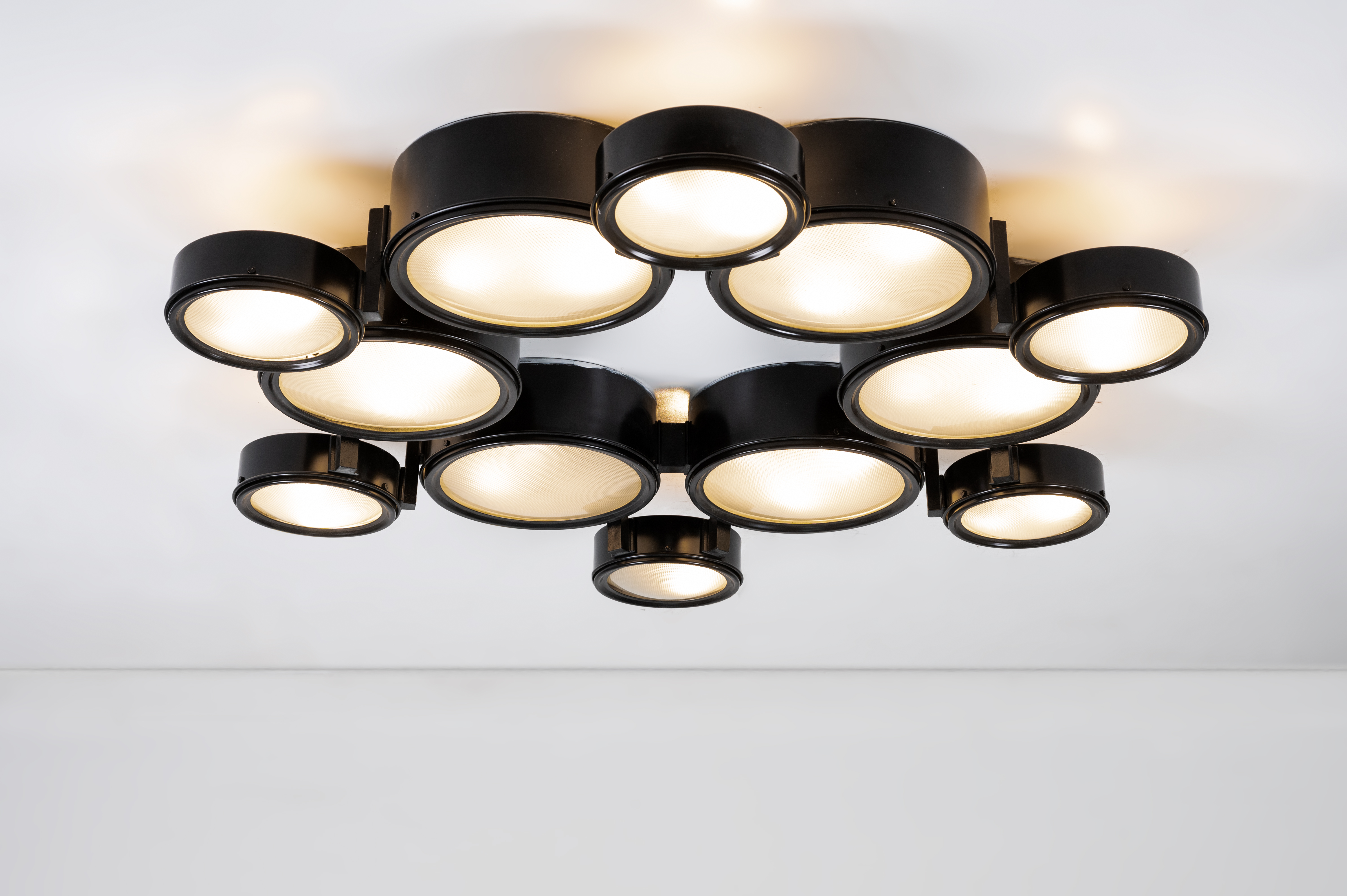 Lampada da soffitto a trenta luci modello “2045/a”, struttura in alluminio verniciato nero, diffusori circolari di due grandezze, vetro pressato e curvato. Etichetta interna di produzione. Provenienza: Antica dimora siciliana.