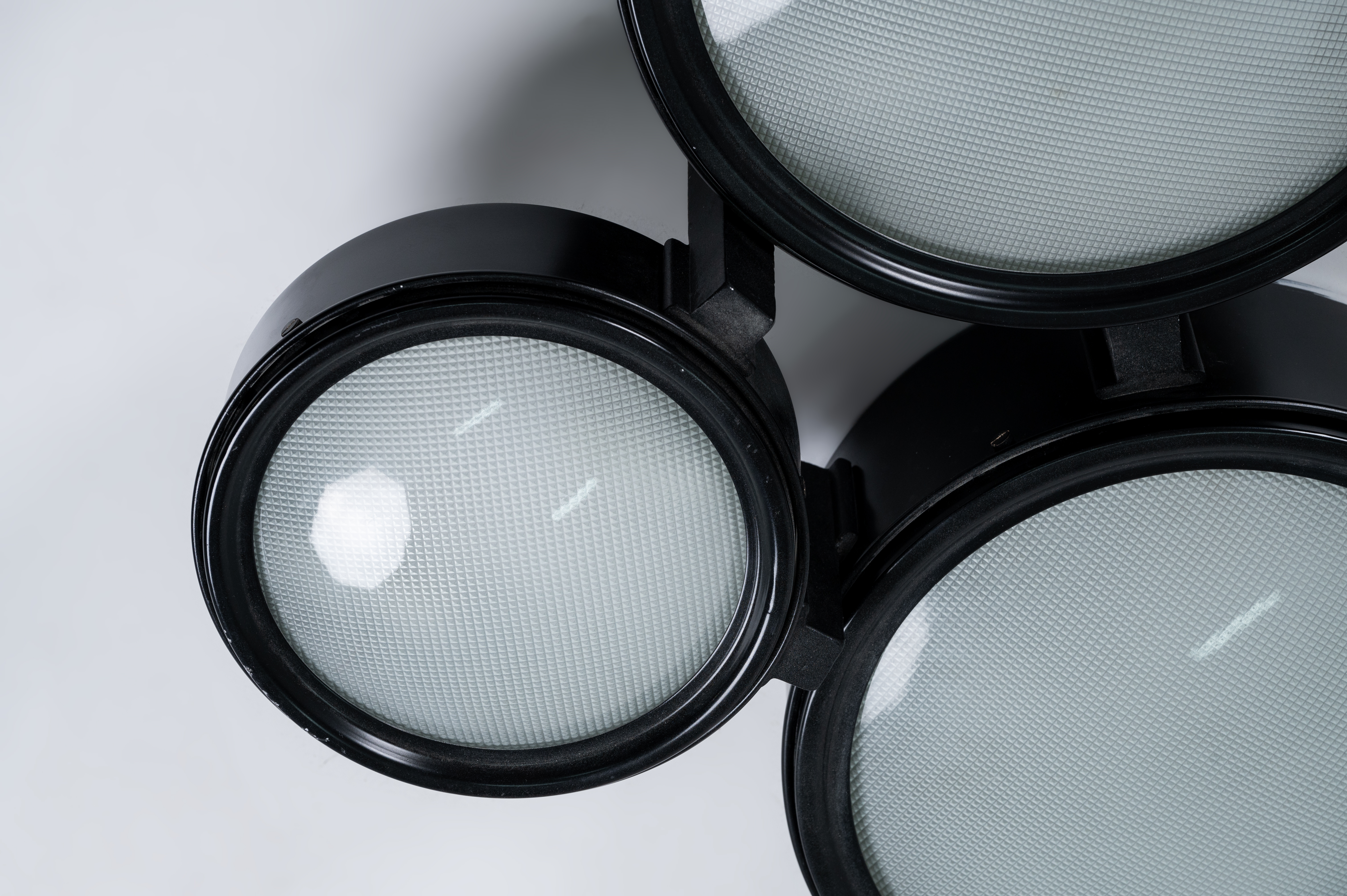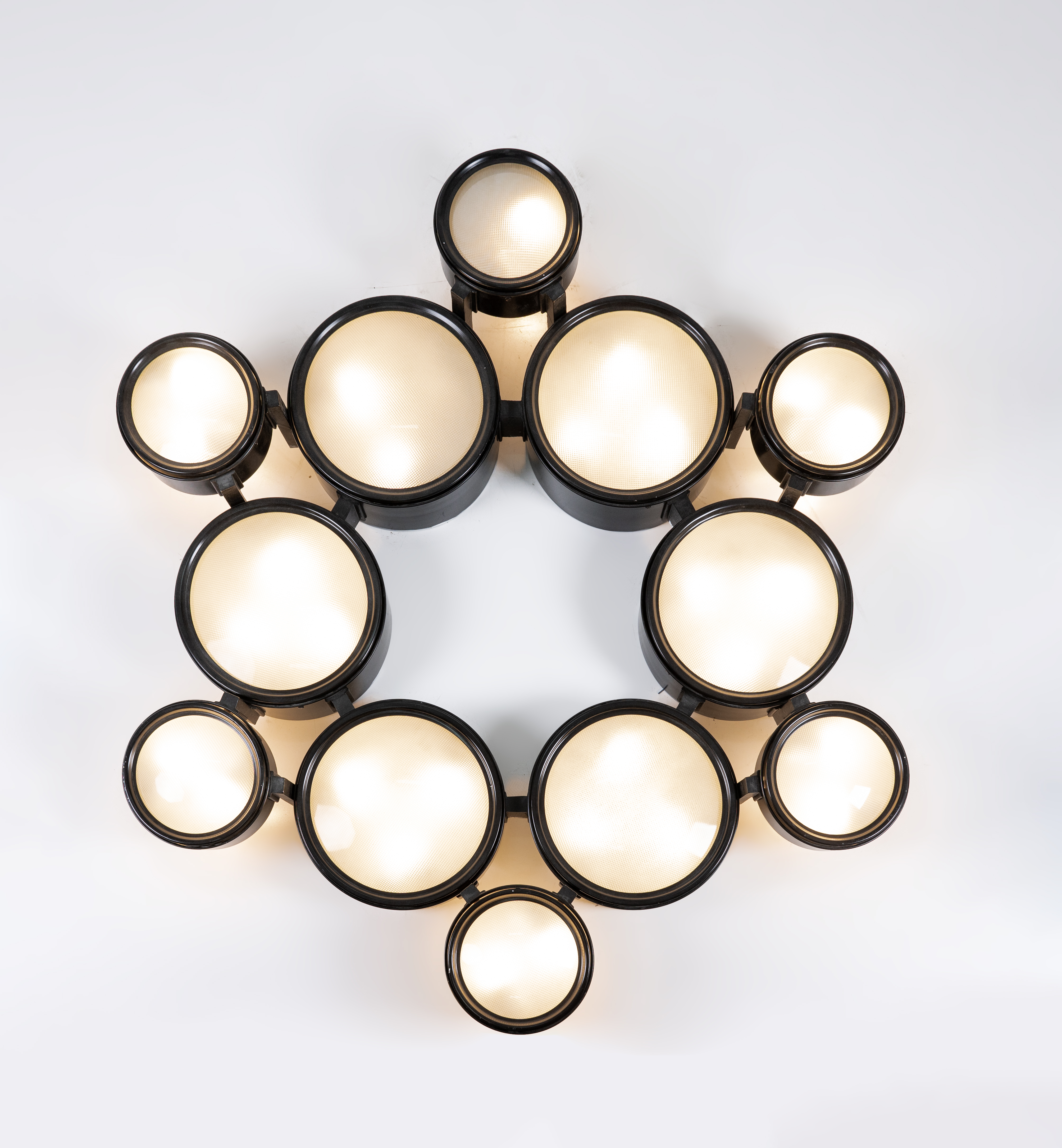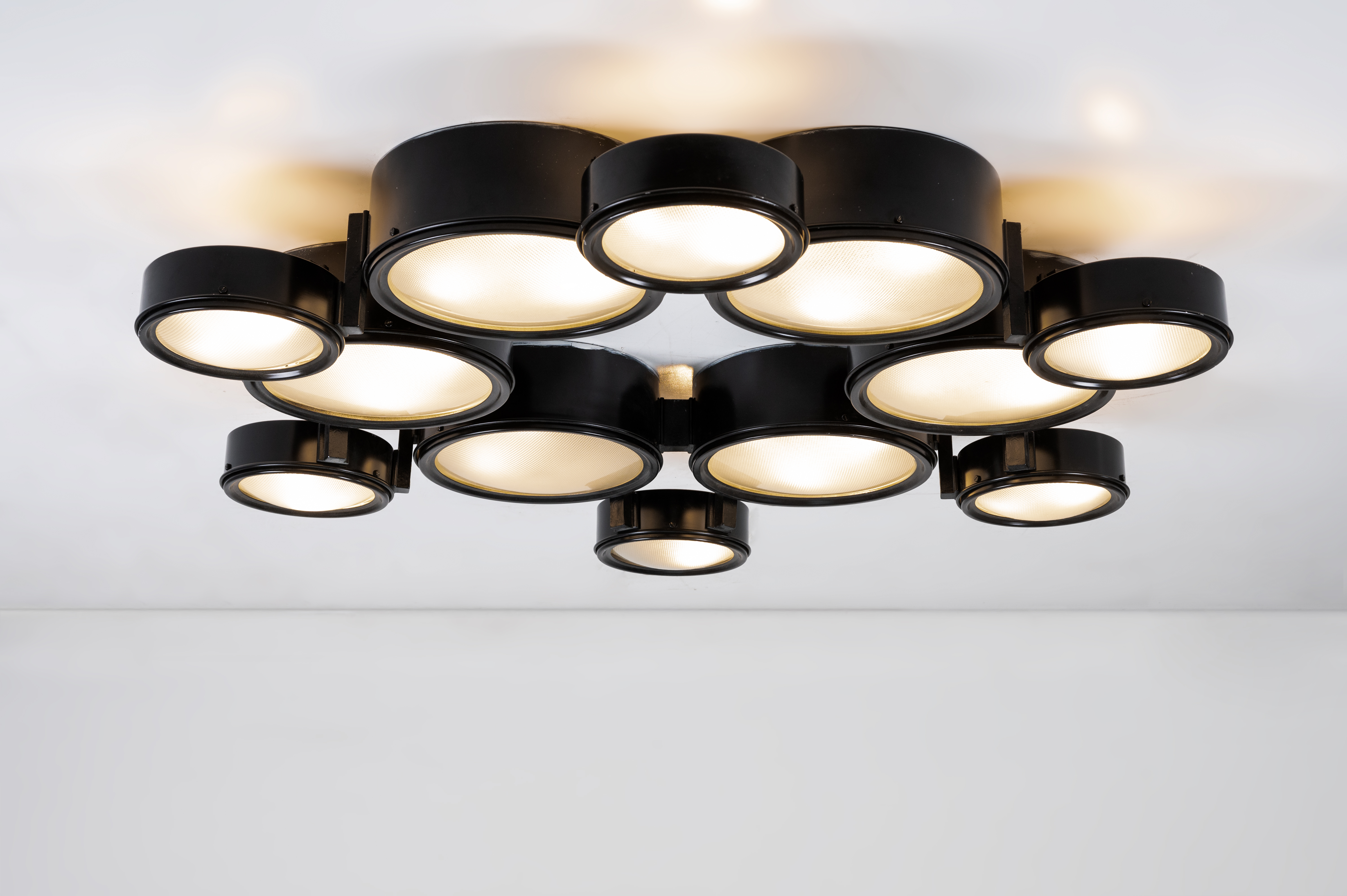 Lampada da soffitto a trenta luci modello “2045/a”, struttura in alluminio verniciato nero, diffusori circolari di due grandezze, vetro pressato e curvato. Etichetta interna di produzione. Provenienza: Antica dimora siciliana.