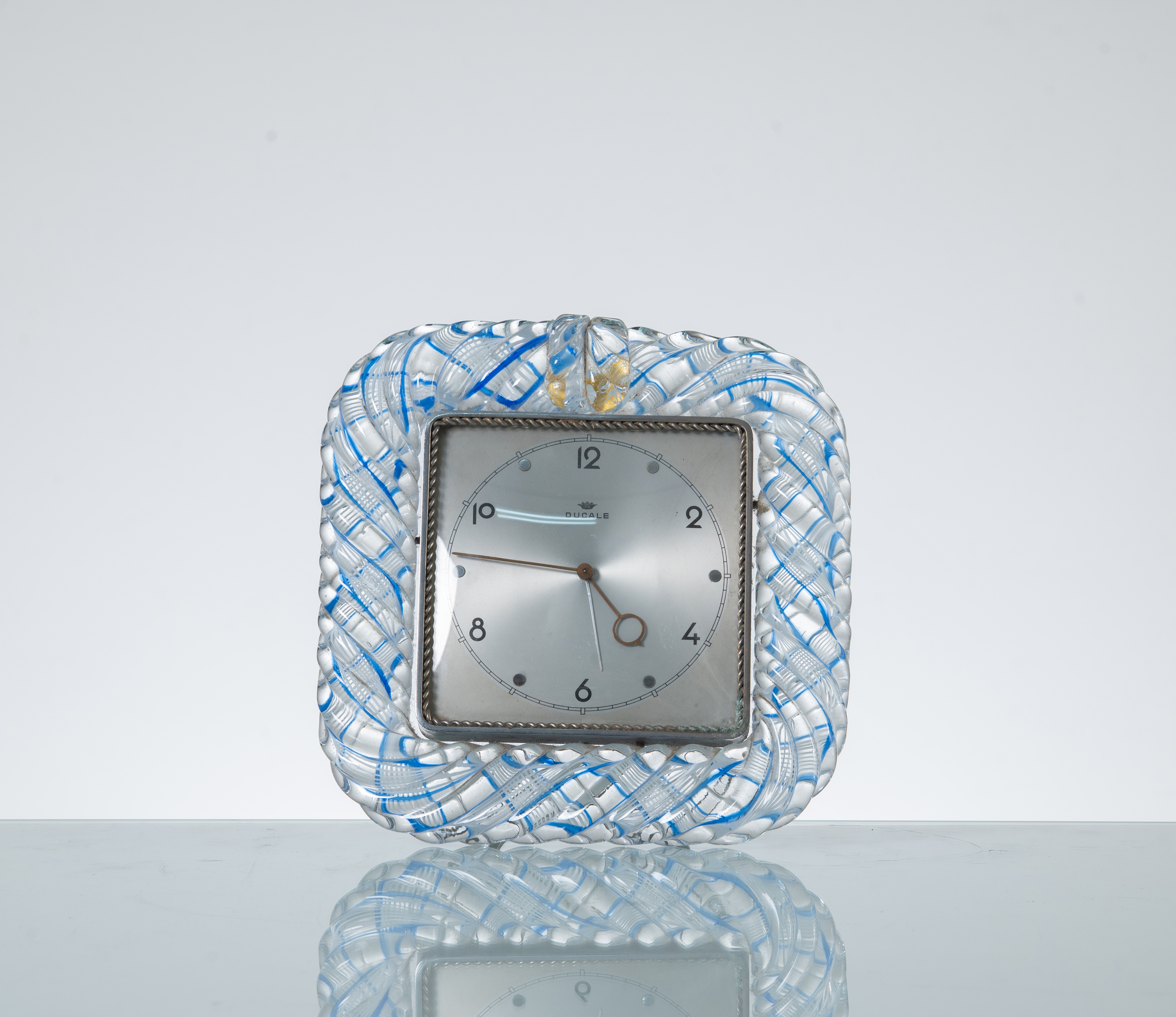 Cornice con orologio in vetro trasparente a torchon con inclusione di fili in vetro blu e vetro lattimo a reticello. Macchina dell’orologio a marchio Ducale.