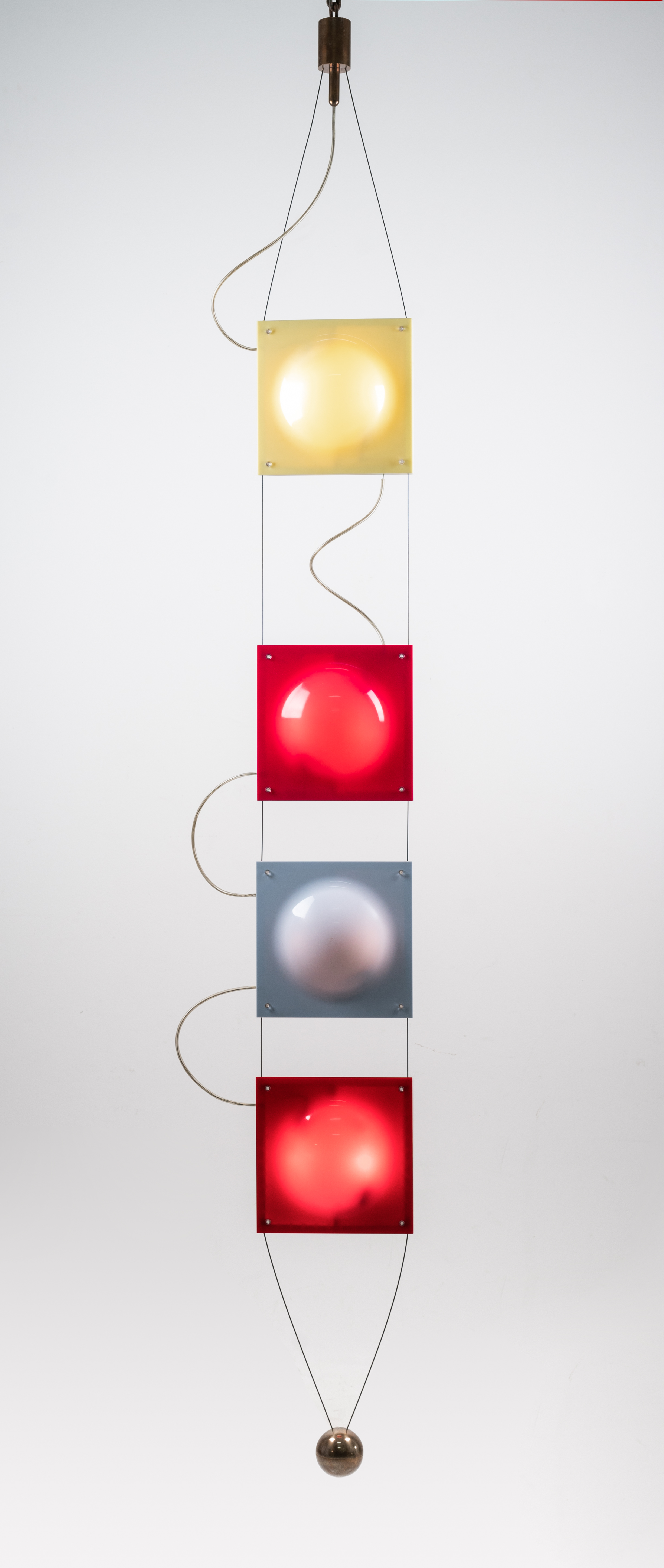 Rara lampada a sospensione ad otto luci modello “12625” detto “Festone”, composta da quattro formelle in metallo e plexiglass colorato, ottone.