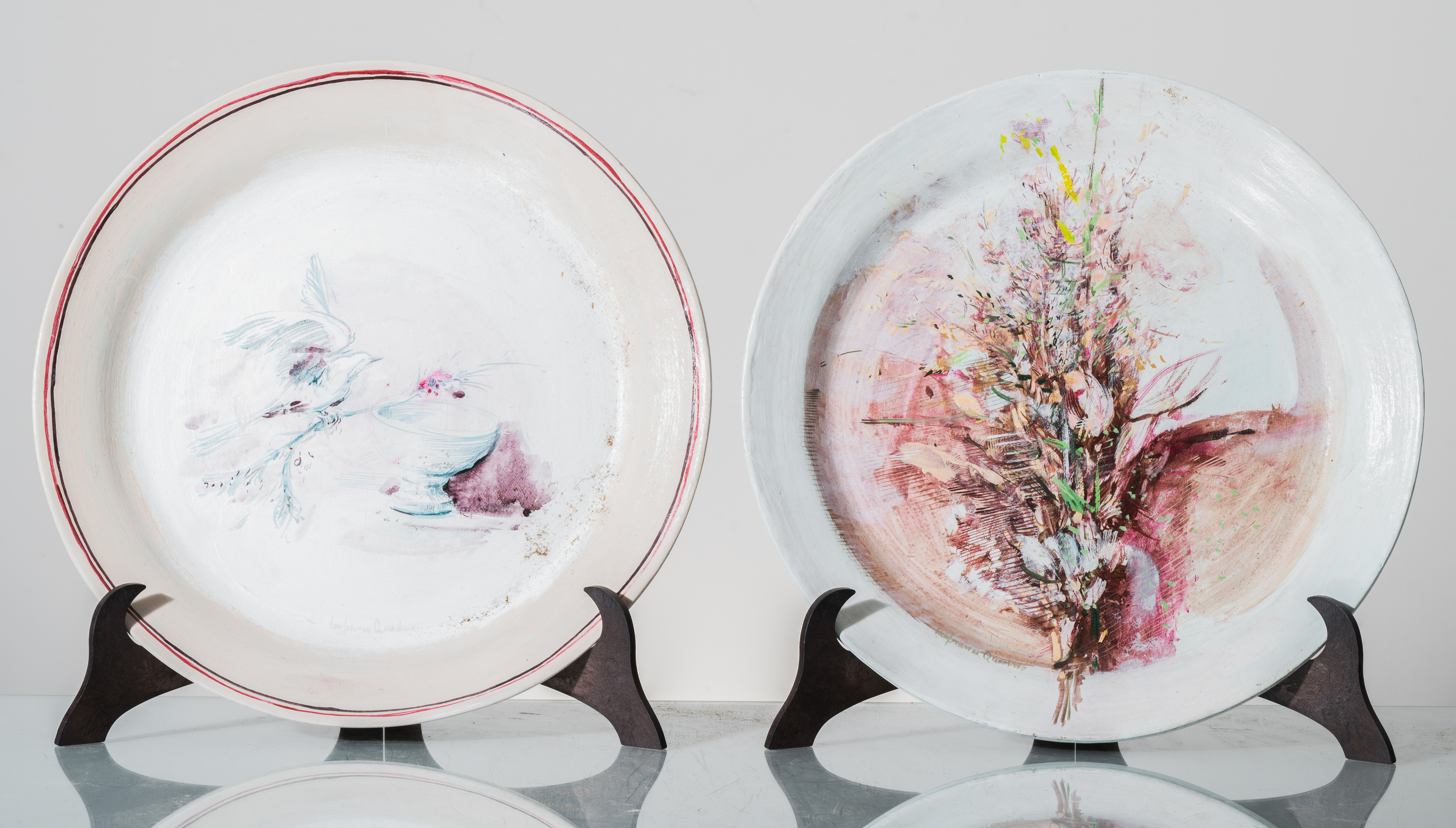 Quattro piatti in ceramica dipinta. Firmati (usure).