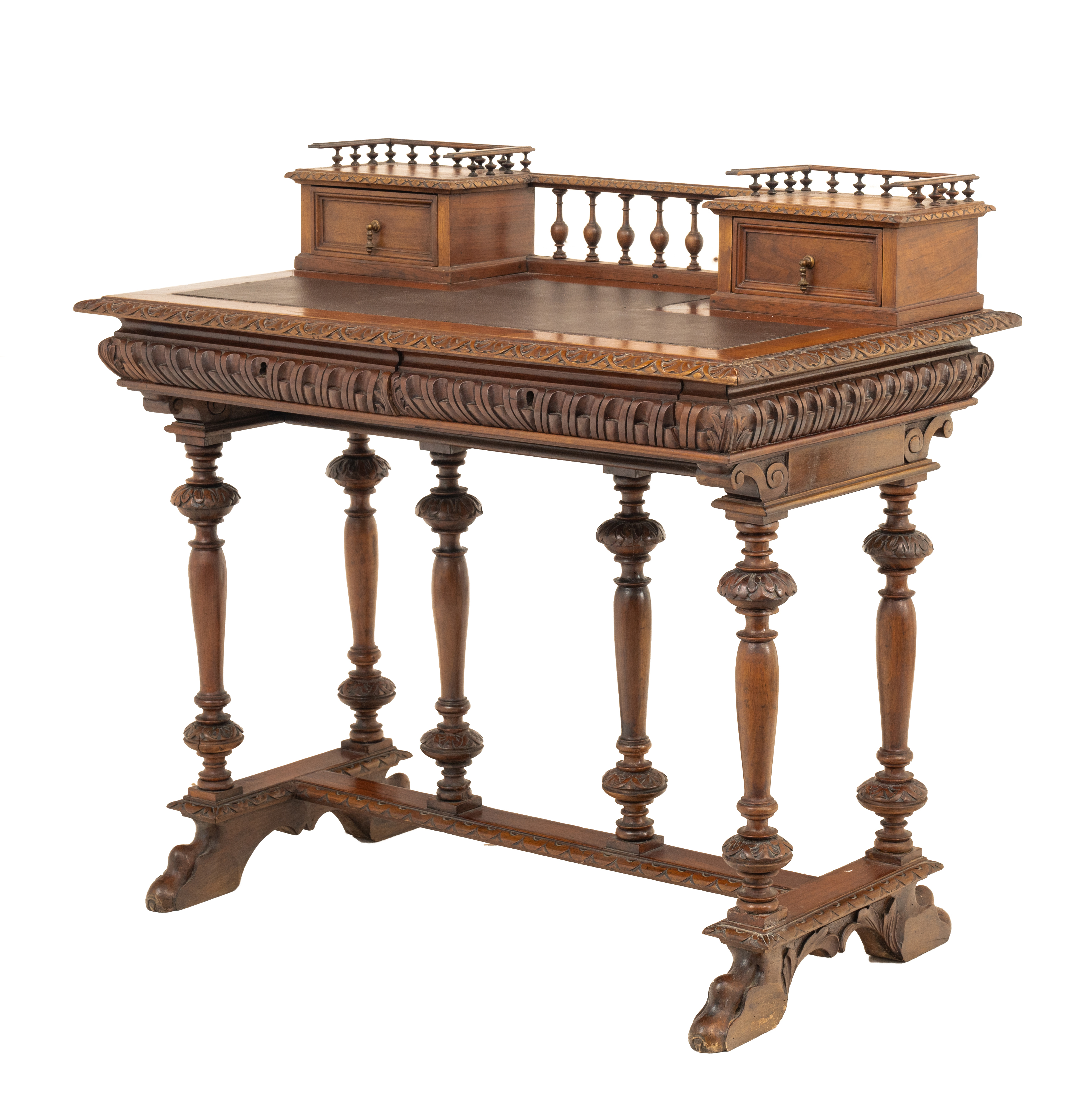 Scrittoio con alzata in legno di noce, con due cassetti e due cassetti nella parte sovrastante, piano in pelle marrone.